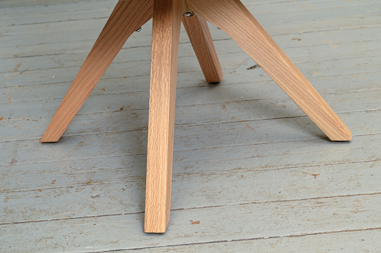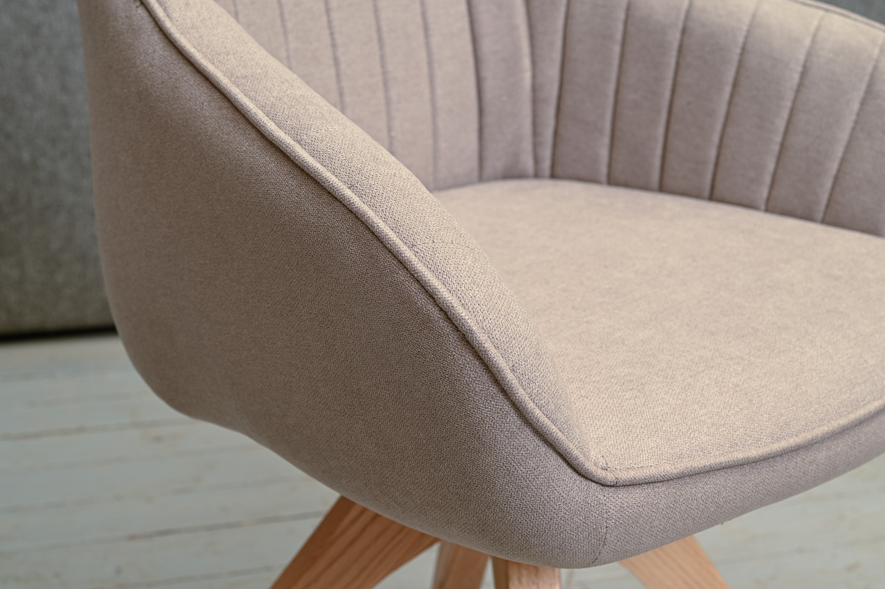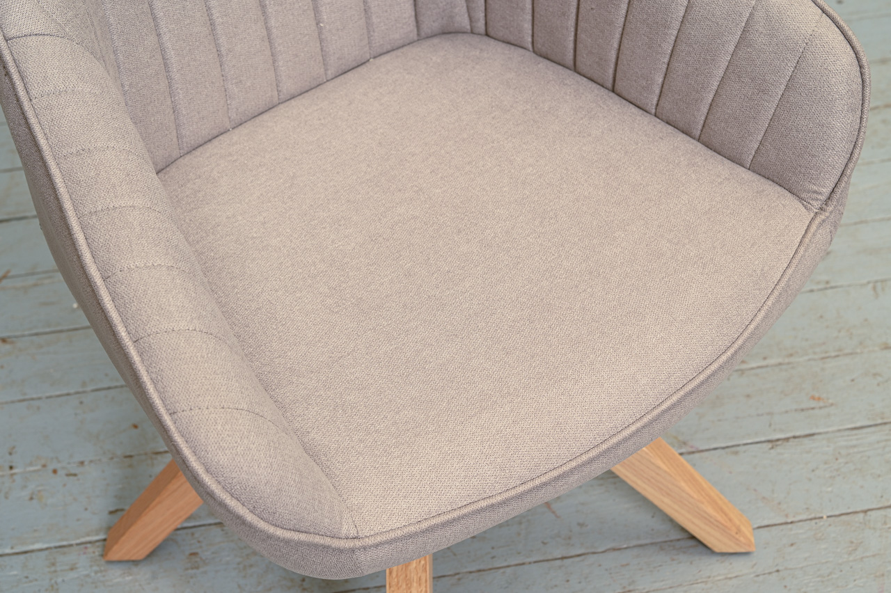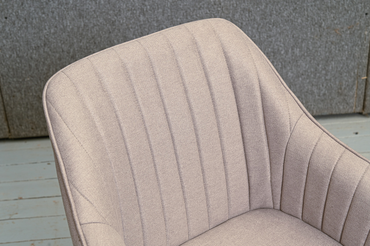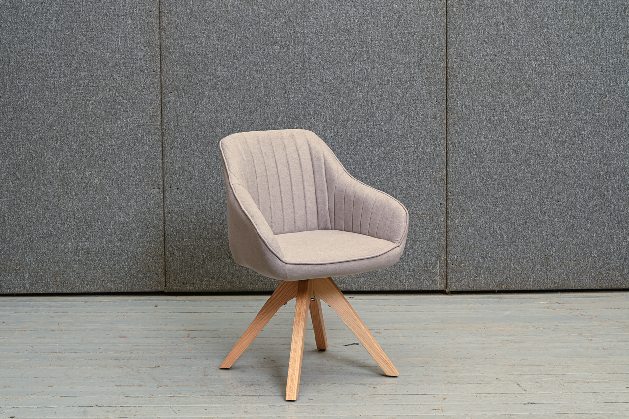 Krēsls ar paroceņiem uz dižskābarža kājām, tapsēts ar pelēku mēbeļu audumu. Krēsla sēdvirsma pagriežama pagriežams 360° ap kāju. Nelietots, salikts. Kods 108364.