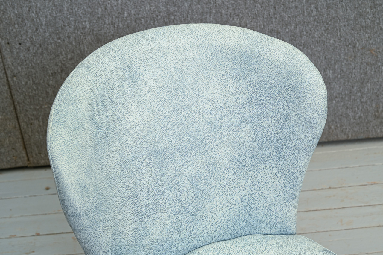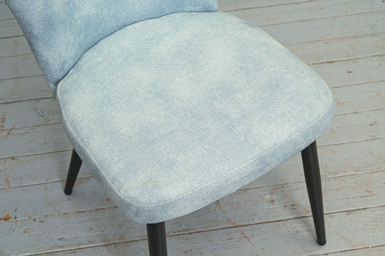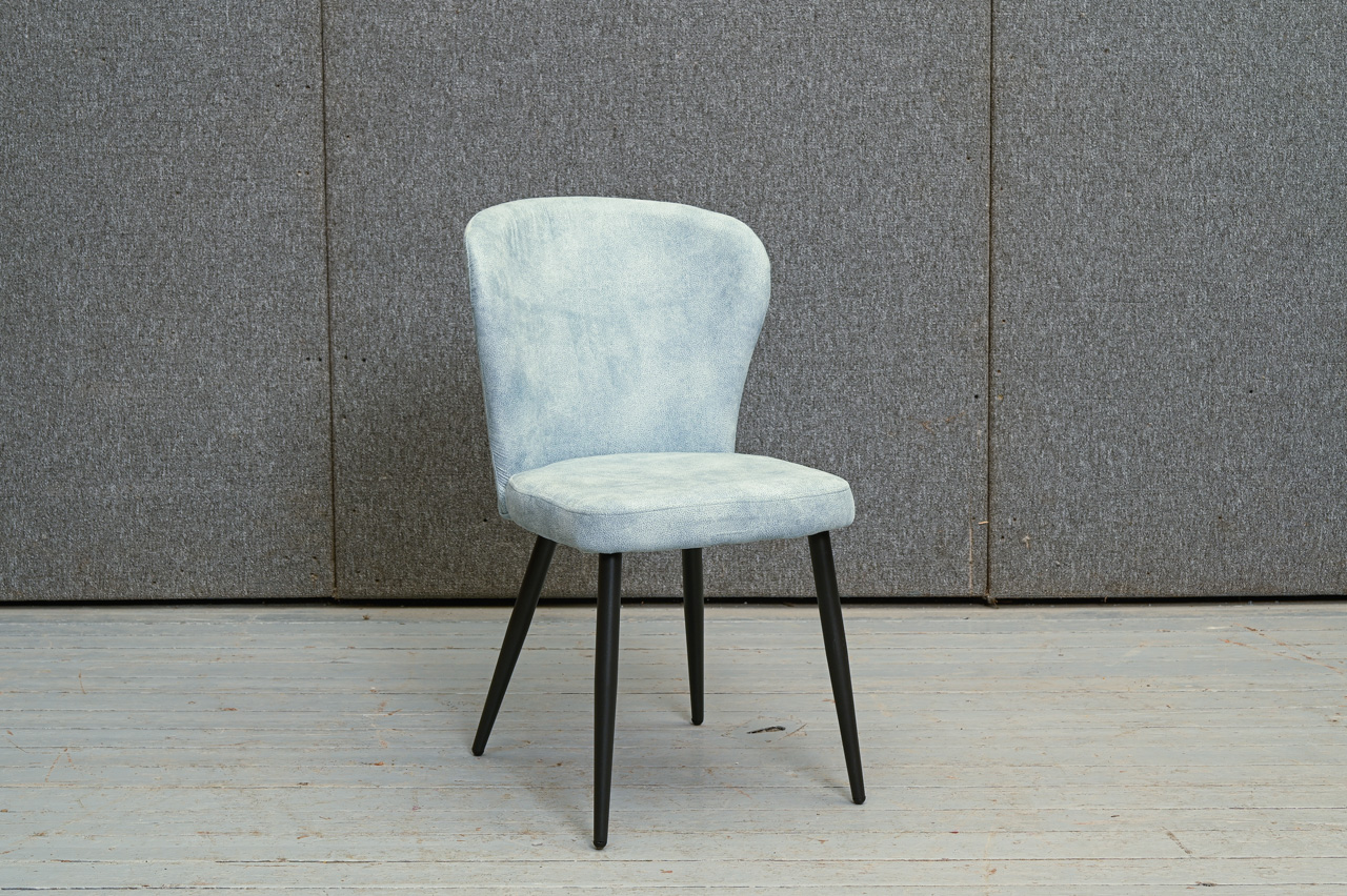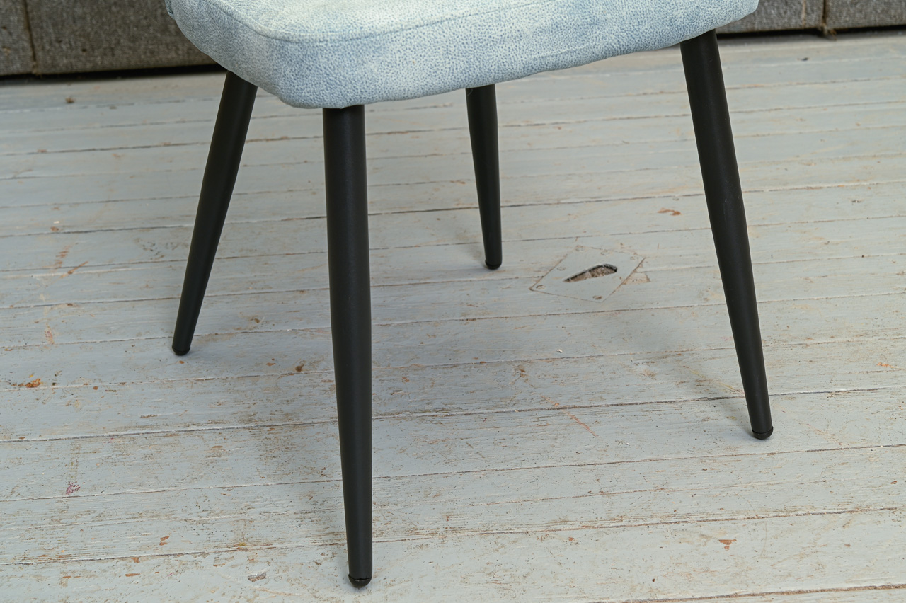 Krēsls uz melnām metāla kājiņām, tapsēts ar zilu mēbeļu audumu. Nelietots, salikts. Kods 108365. Pieejams šāds pats krēsls ar tumši dzeltena/sinepju krāsas auduma tapsējumu, kods 108344.