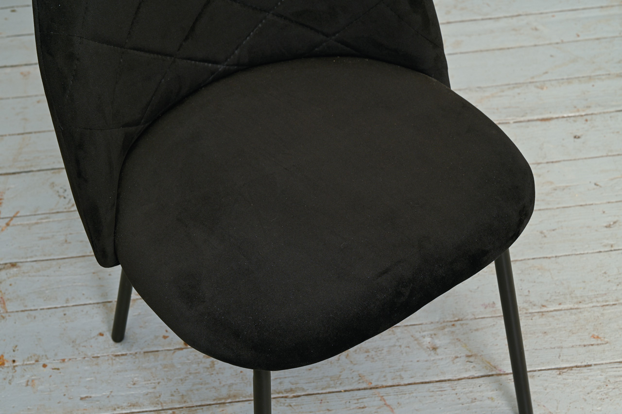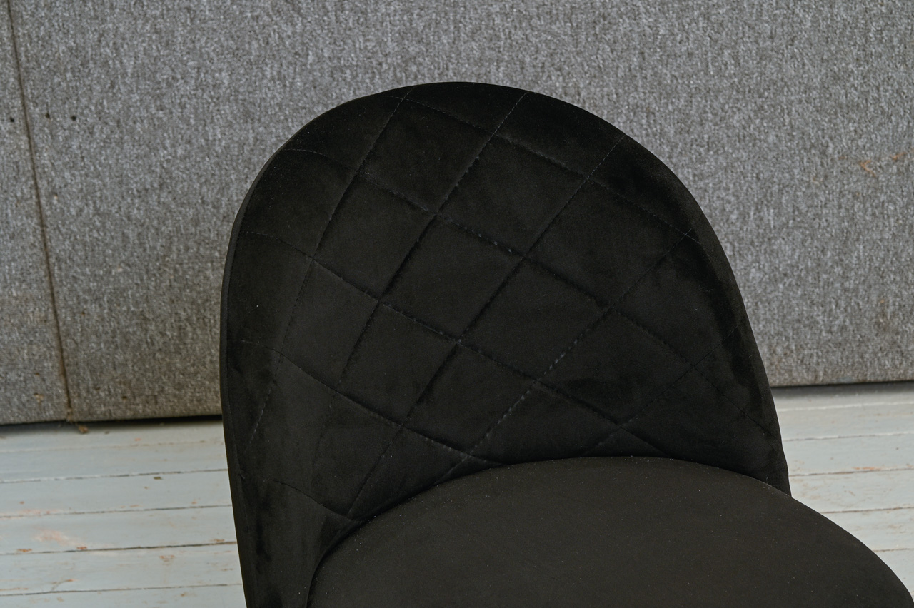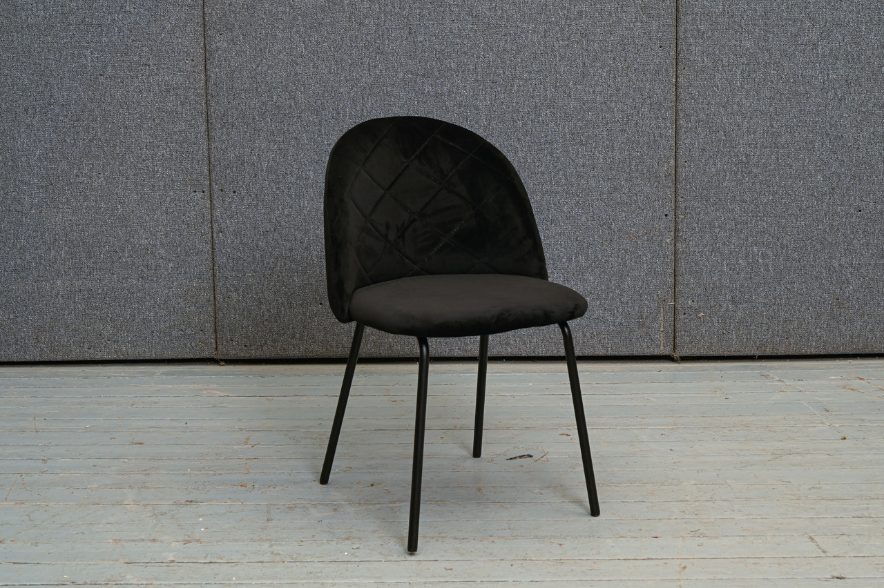 Krēsls uz melnām metāla kājiņām, tapsēts ar melnu samtainu mēbeļu audumu. Nelietots, salikts. Kods 108366.
