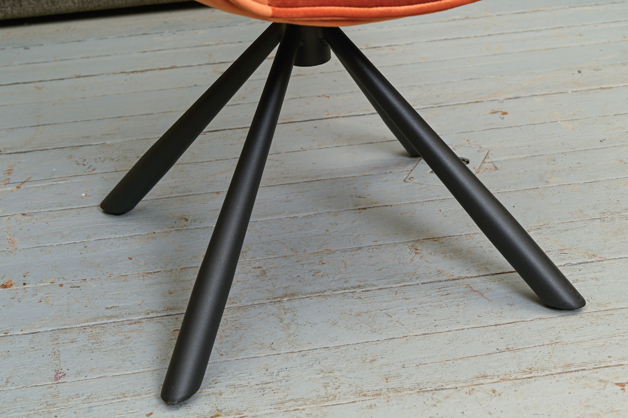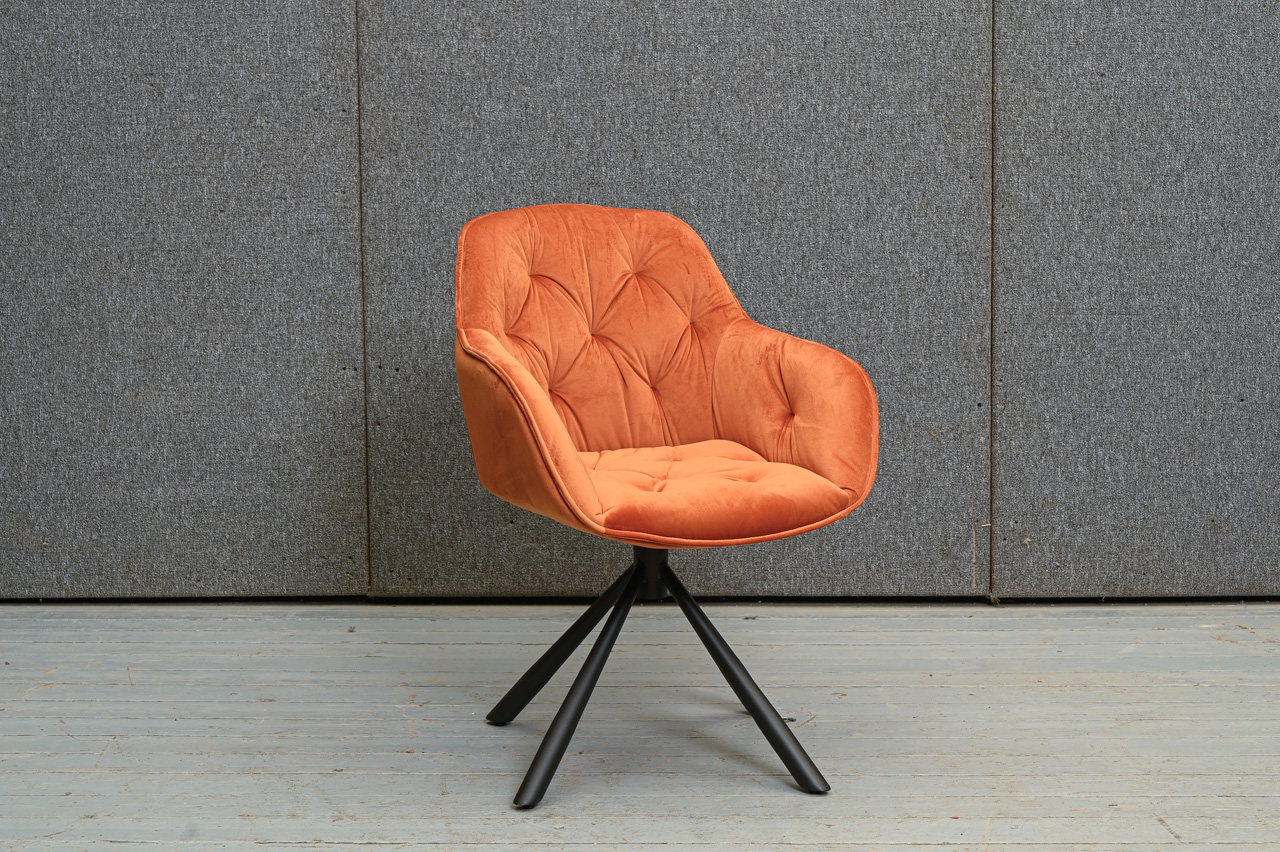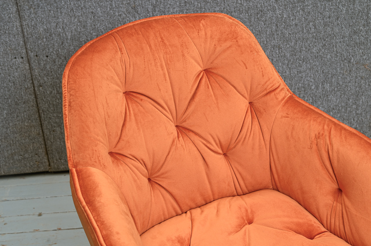 Krēsls ar paroceņiem, tapsēts ar stepētu, samtainu, oranžu mēbeļu audumu. Sēdvirsma pagriežama 360 grādos ap kāju. Nelietots, salikts. Kods 108375. Pieejams šāds pats krēsls ar pelēka auduma tapsējumu, kods 108326.