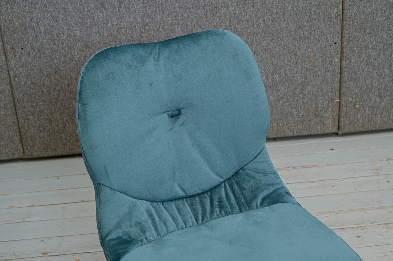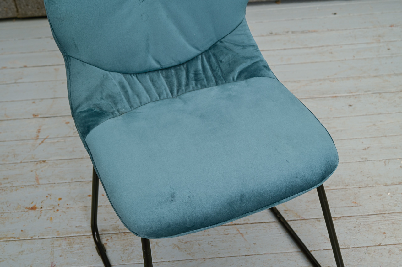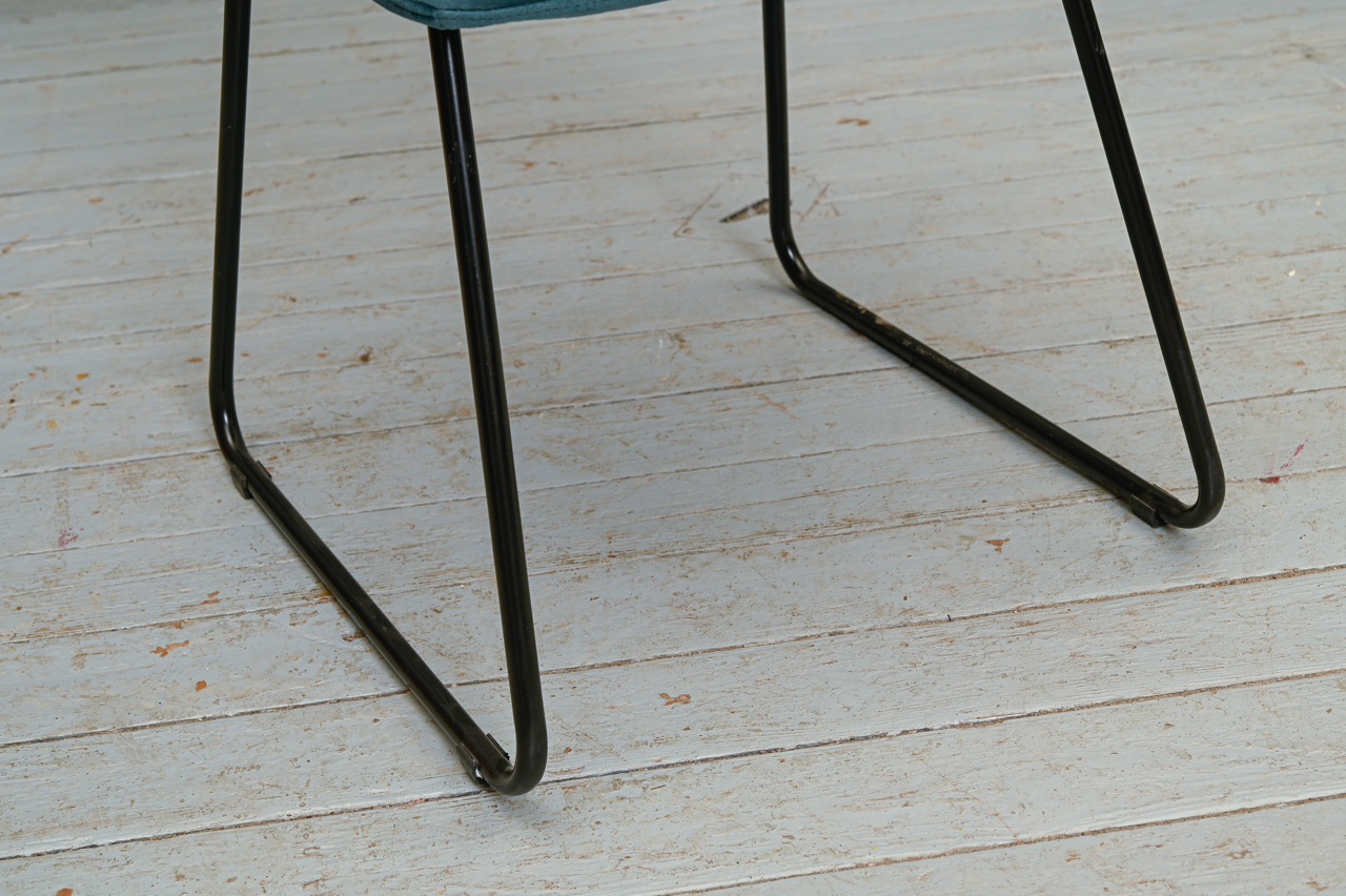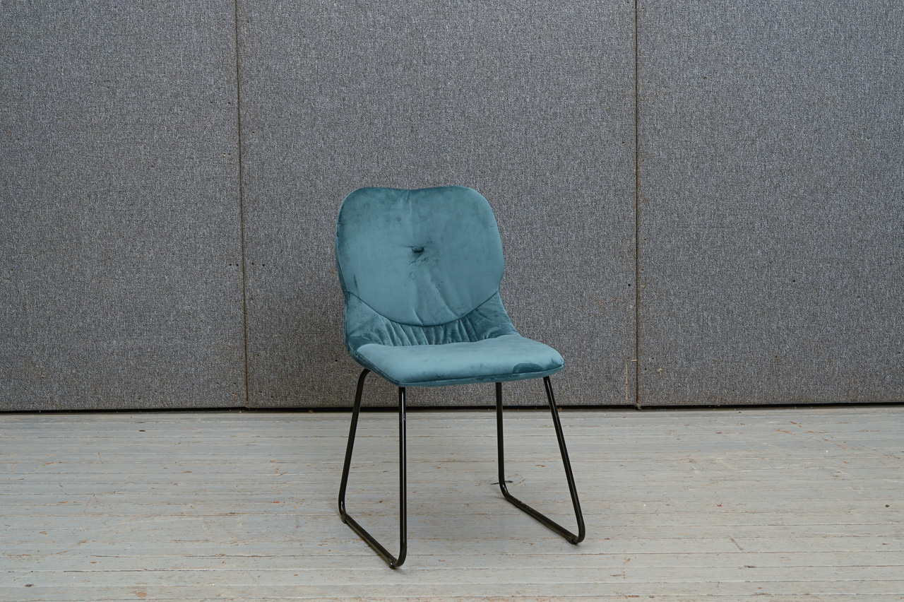 Krēsls uz melnām metāla kājiņām, tapsēts ar zilu, samtainu mēbeļu audumu. Kods 108382.