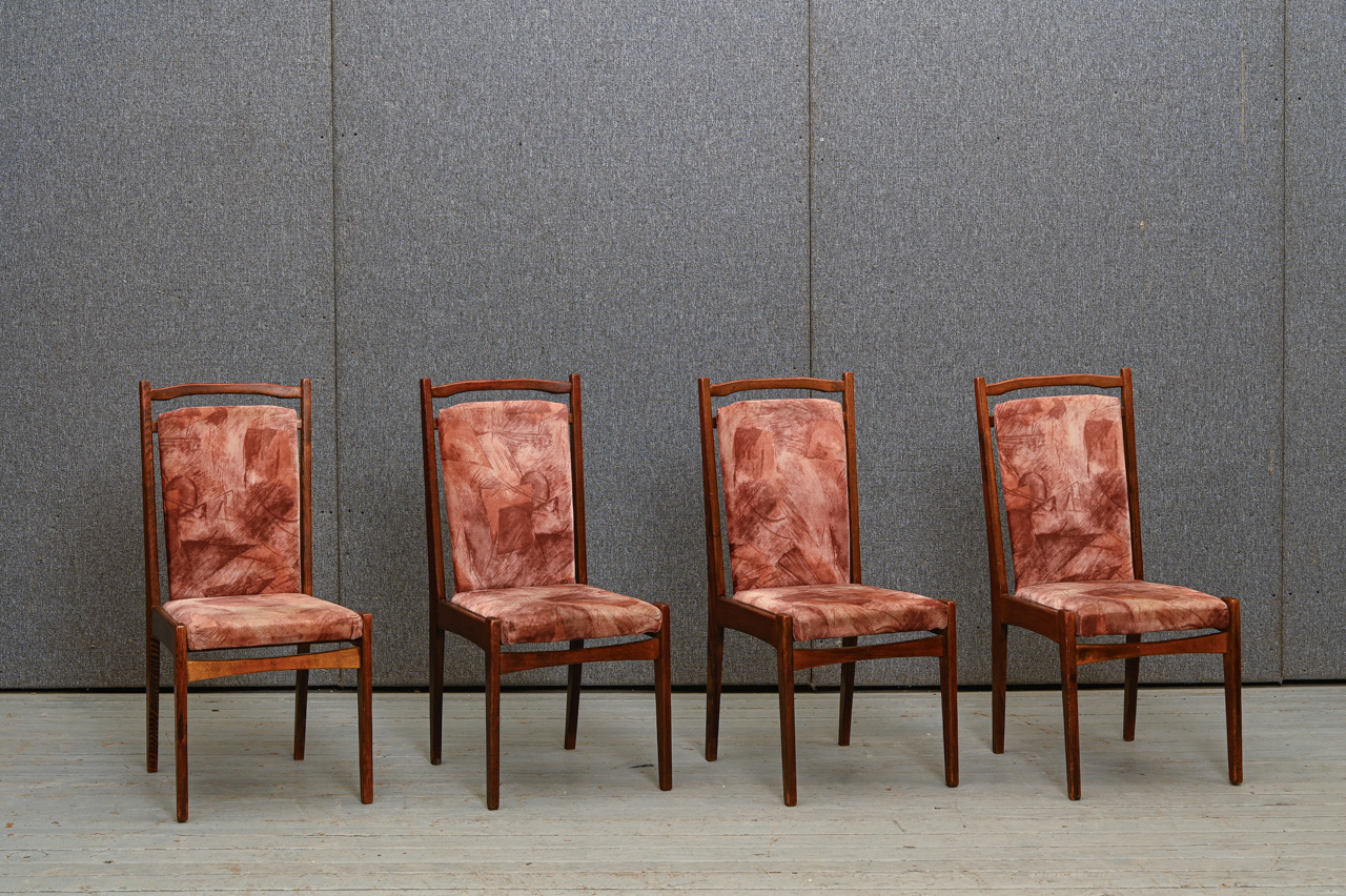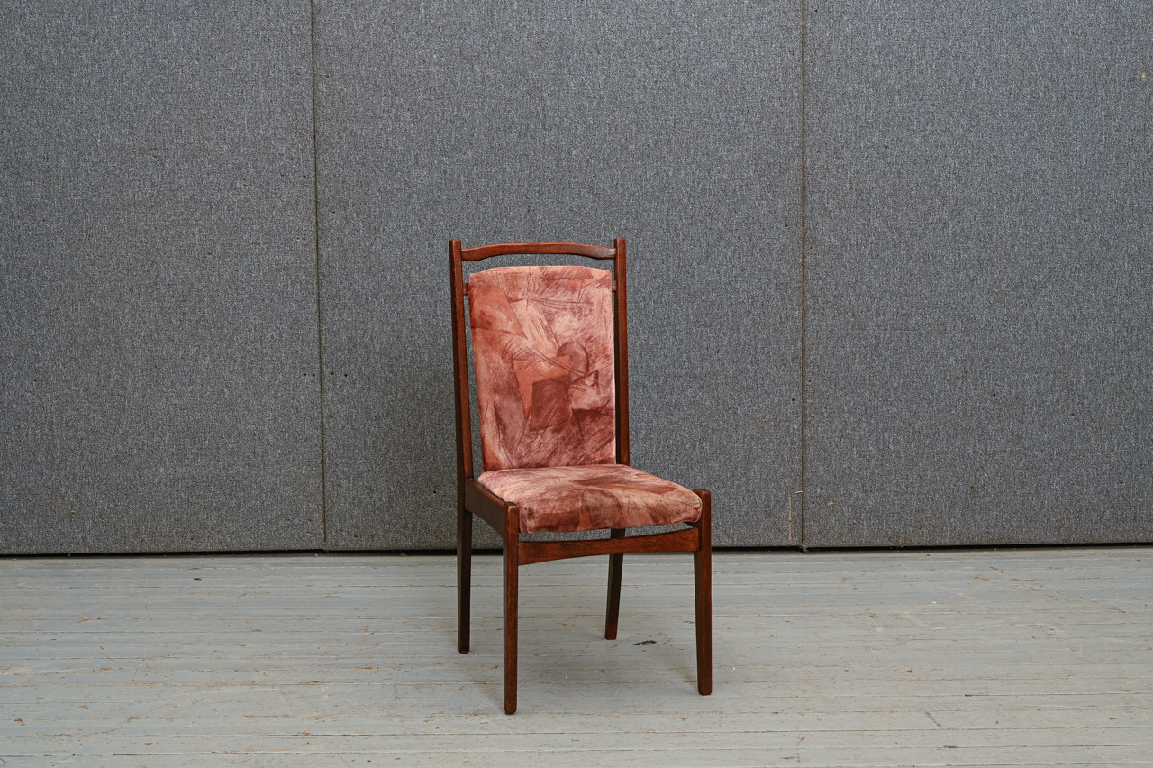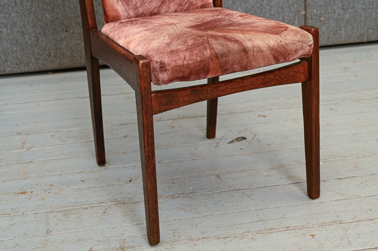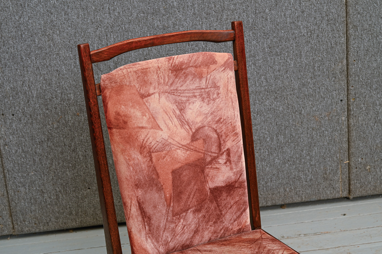 Padomju laika ozolkoka krēsls ar raiba mēbeļu auduma sēdvirsmas un atzveltnes tapsējumu. Kods 160117. Cena norādīta vienam krēslam. Pieejami 4 šādi krēsli. Pērkot 4 krēslu komplektu - atlaide. Lai saņemtu komplekta atlaidi, lūdzu, mūsu mājaslapā izvēlēties preci ar kodu 160117k.