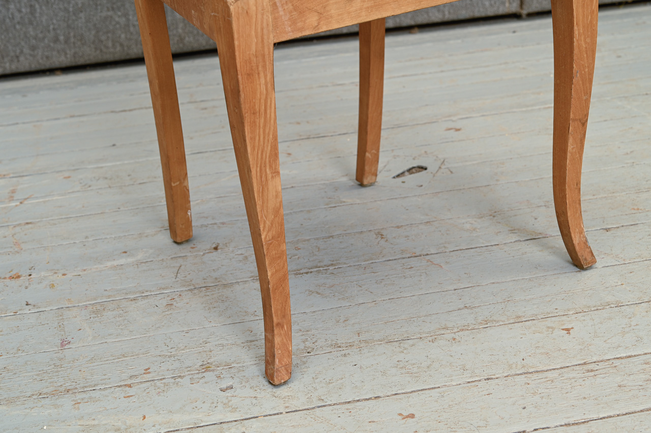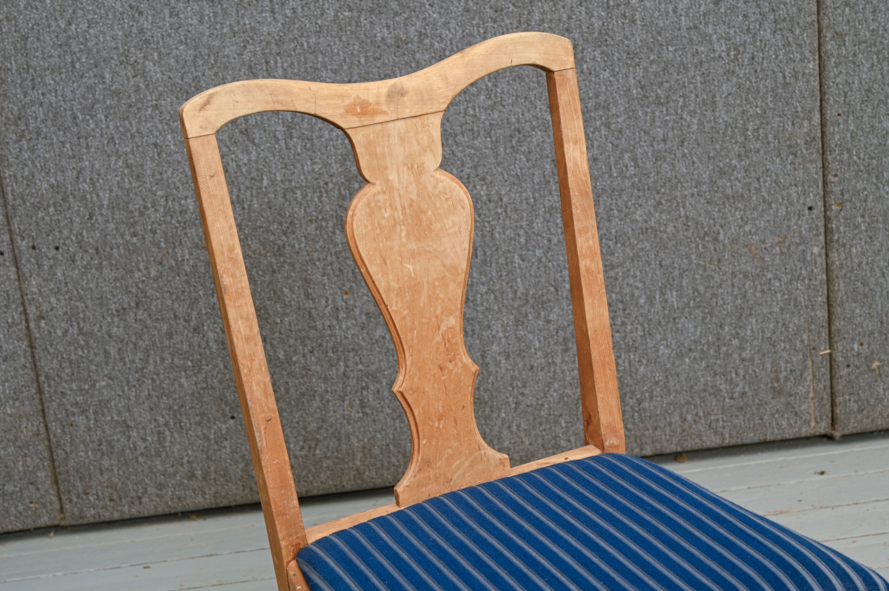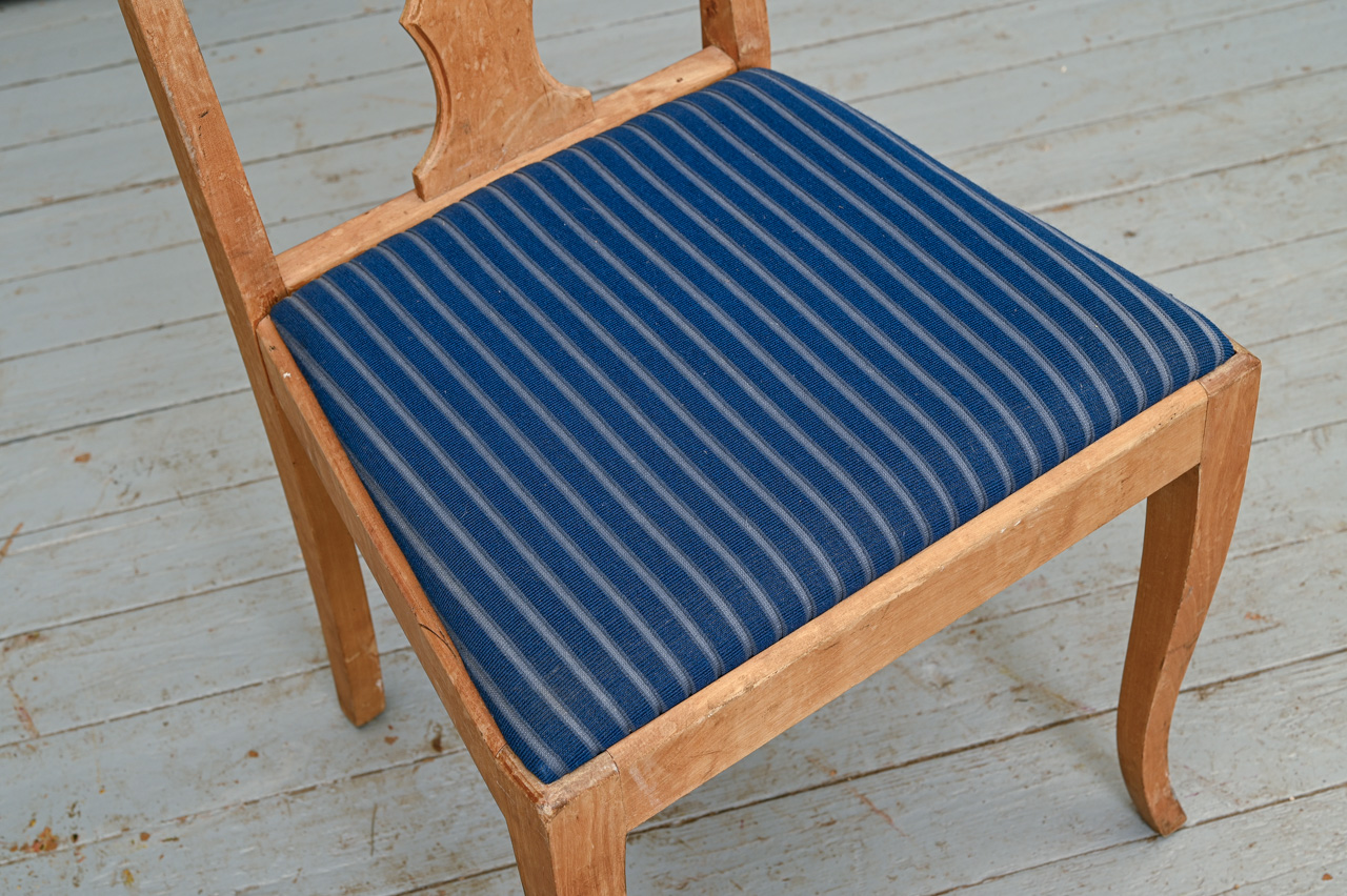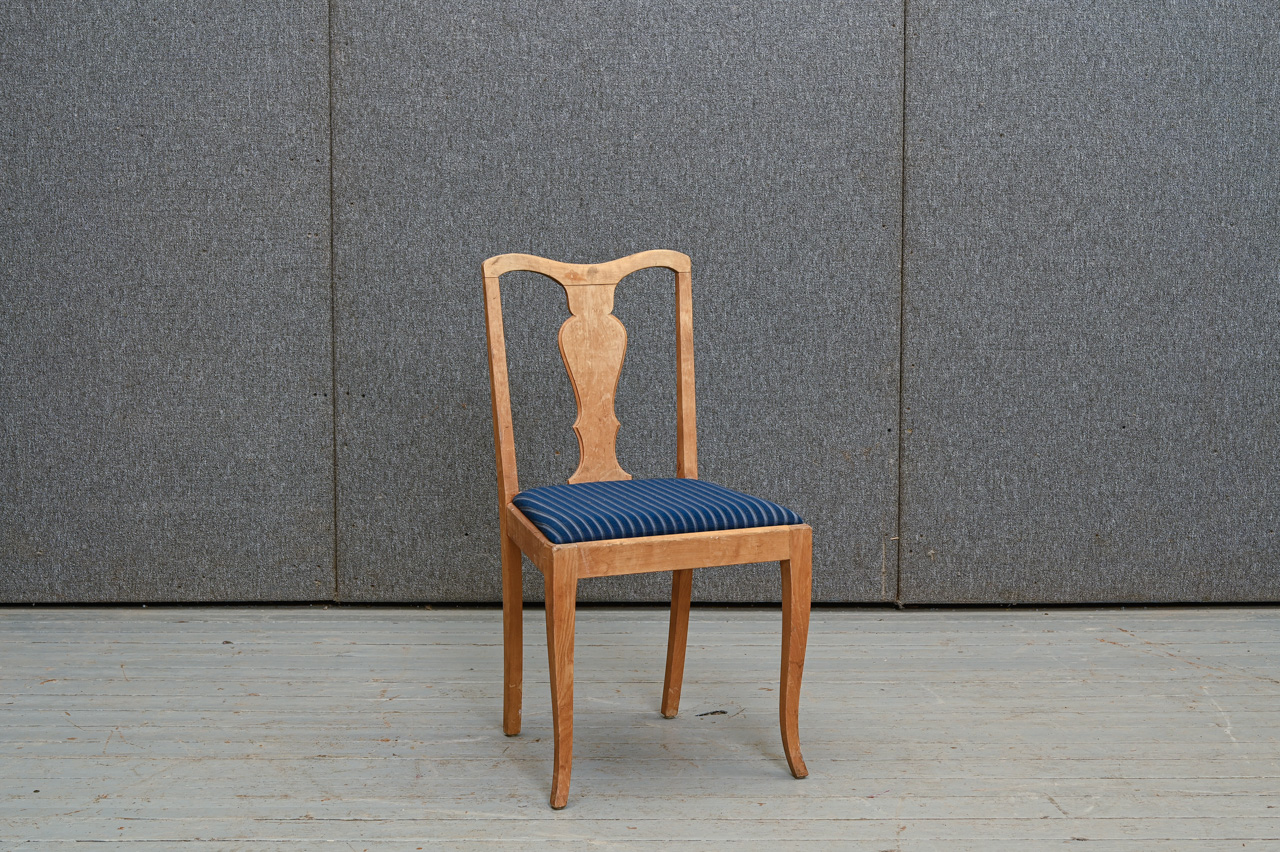 Masīvkoka krēsls ar noņemtu finierējumu, sēdvirsma ar zila mēbeļu auduma tapsējumu. Kods 160127.