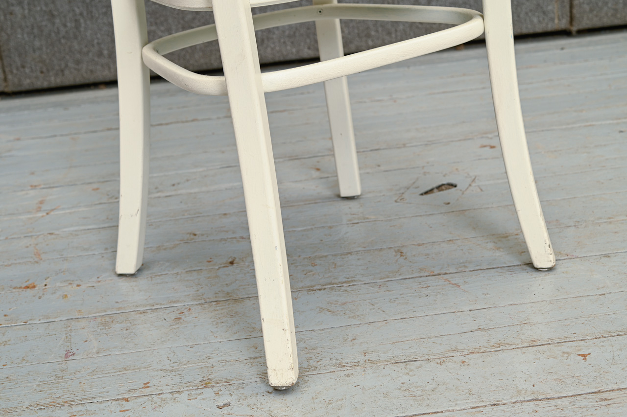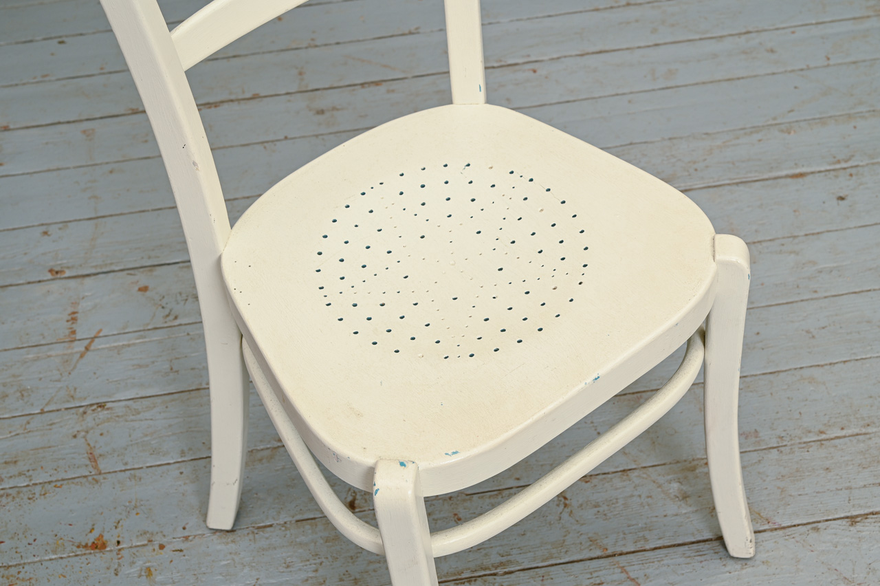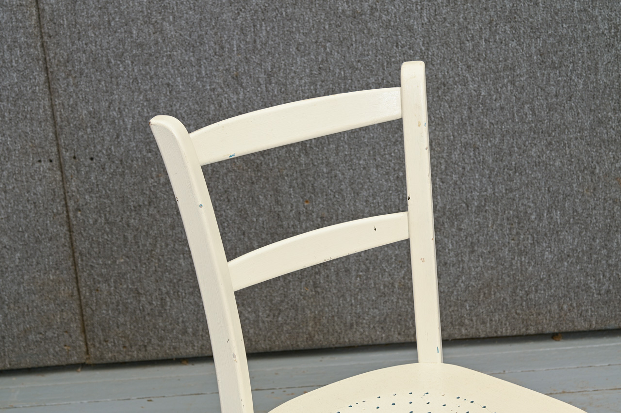 Balti krāsots masīvkoka krēsls ar dekoratīvu saplākšņa sēdvirsmu. Kods 160128. Pieejams krēsls ar līdzīgu sēdvirsmu, kods 102111.