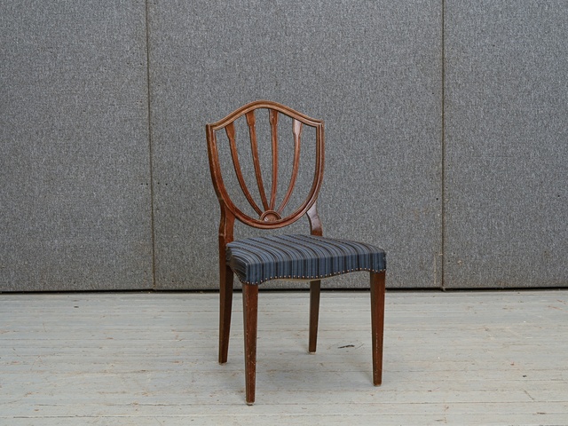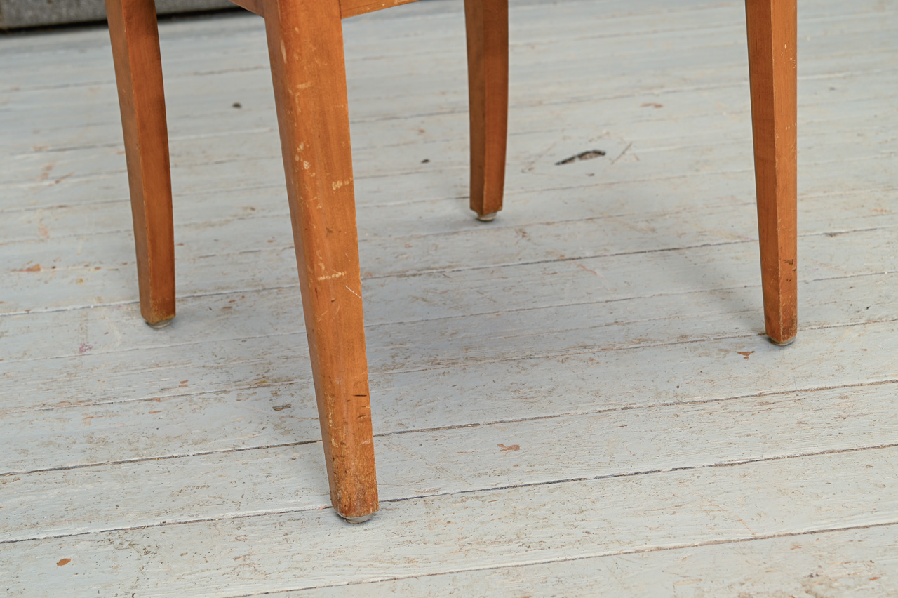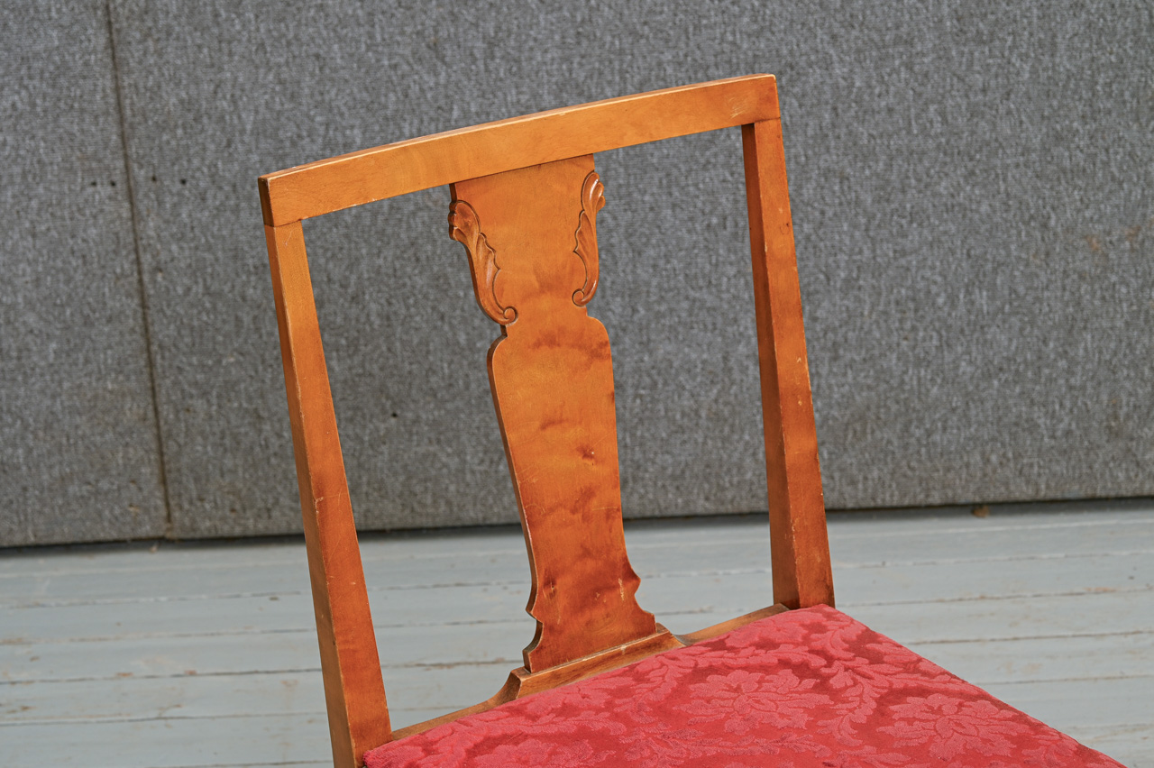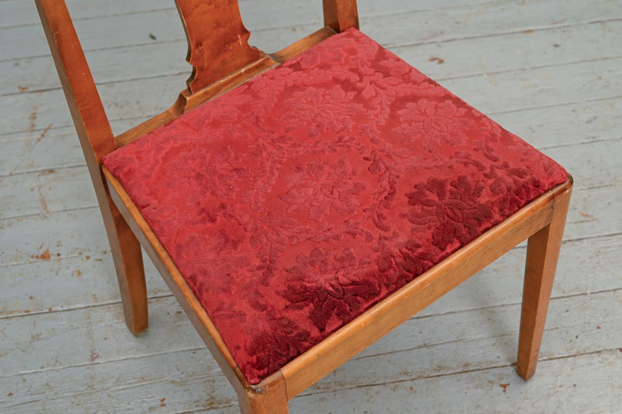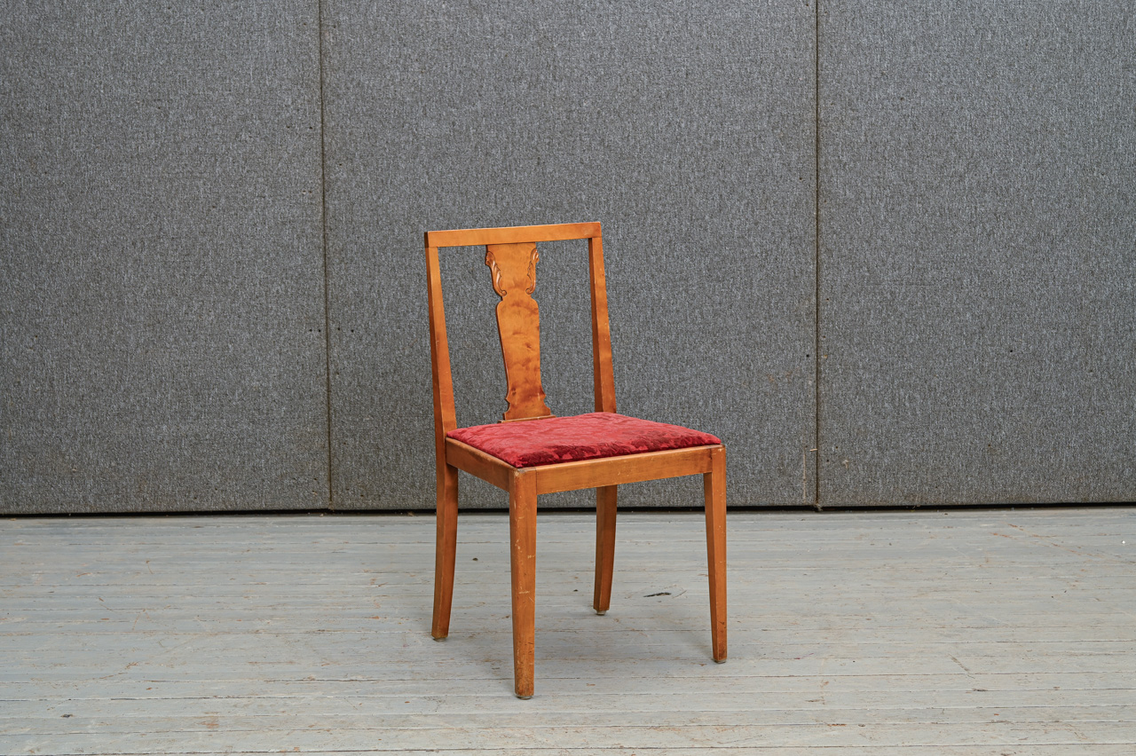 Masīvkoka krēsls ar cēlkoka finierējumu, sēdvirsma ar sarkana, samtaina mēbeļu auduma tapsējumu. Kods 160130.