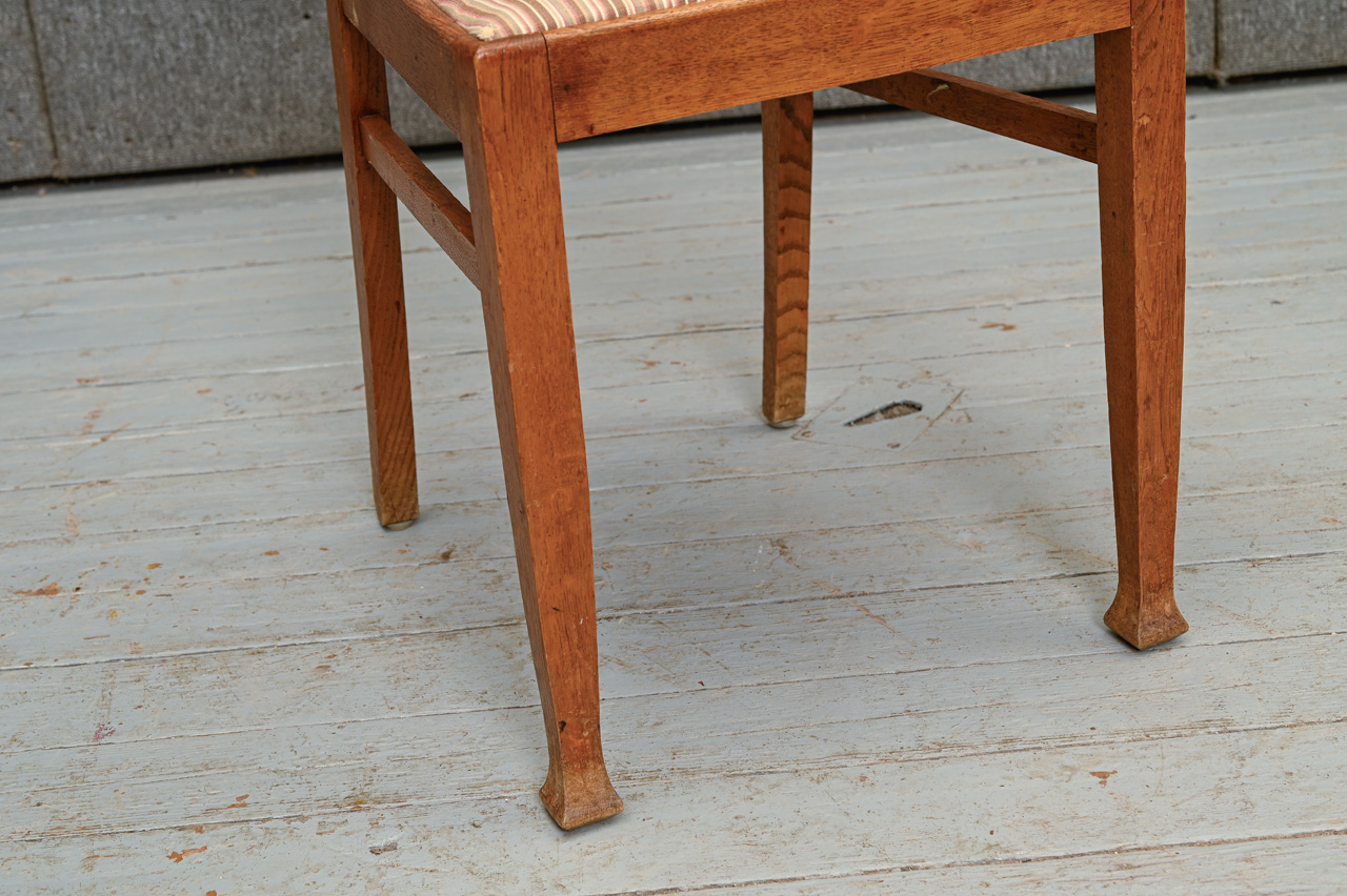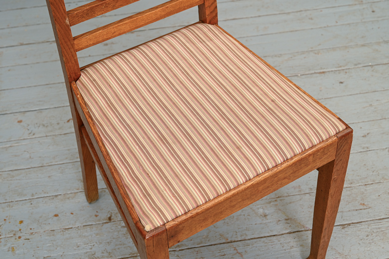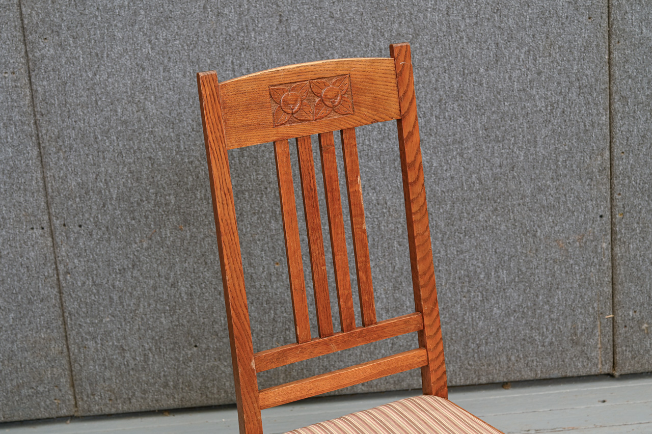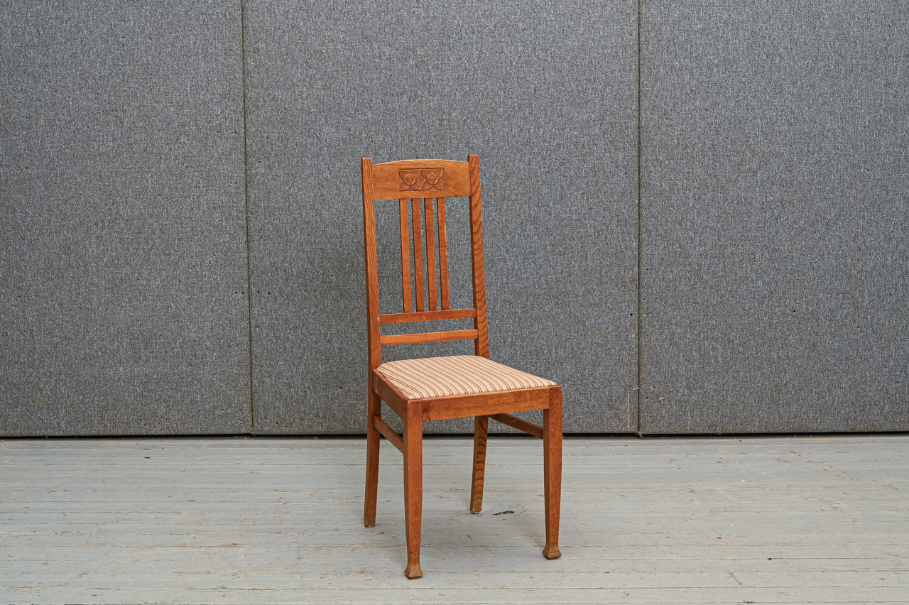 Ozolkoka krēsls ar dekoratīvu kokgrebumu atzveltnes daļā. Sēdvirsma ar svītraina mēbeļu auduma tapsējumu. Kods 160134.