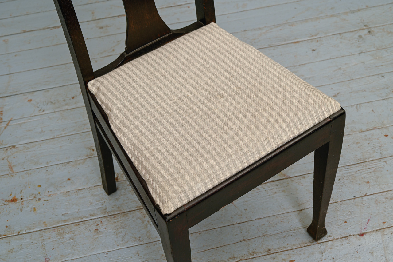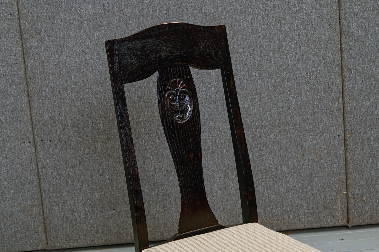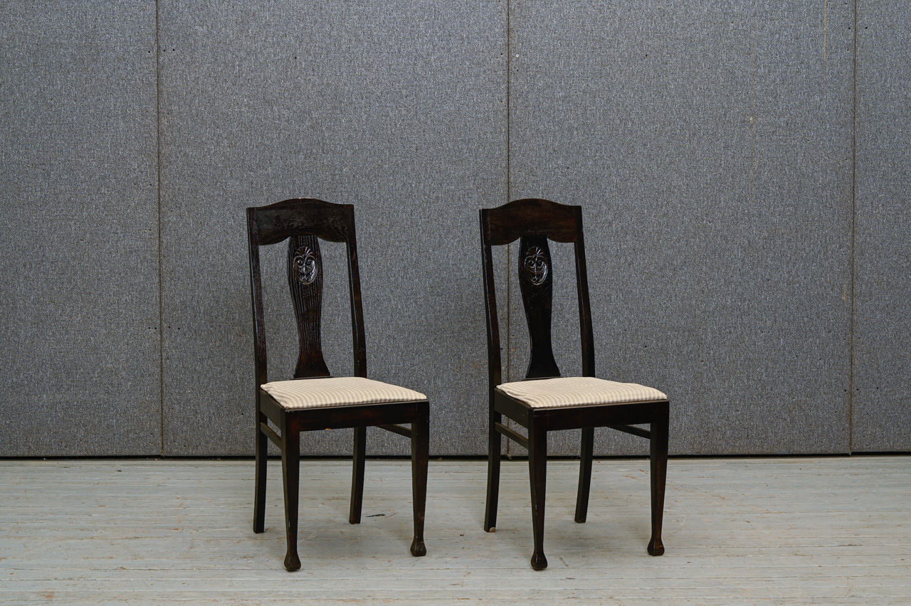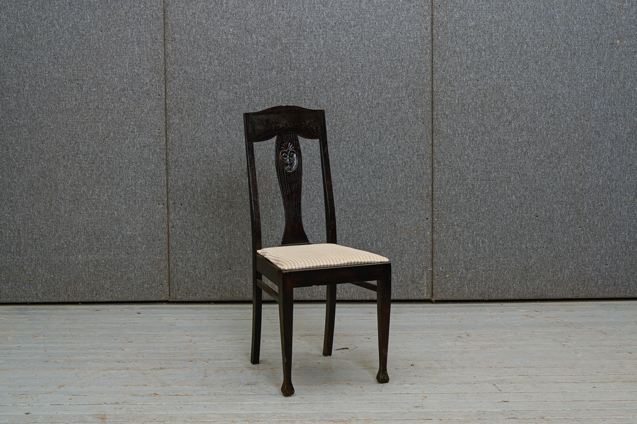 Melni krāsots masīvkoka krēsls ar dekoratīvu kokgrebumu atveltnes daļā. Sēdvirsma tapsēta ar strīpainu, pelēku mēbeļu audumu. Kods 160135. Cena norādīta vienam krēslam. Pieejami 2 šādi krēsli. Pērkot 2 krēslu komplektu - atlaide. Lai saņemtu komplekta atlaidi, lūdzu, mūsu mājaslapā izvēlēties preci ar kodu 160135k.