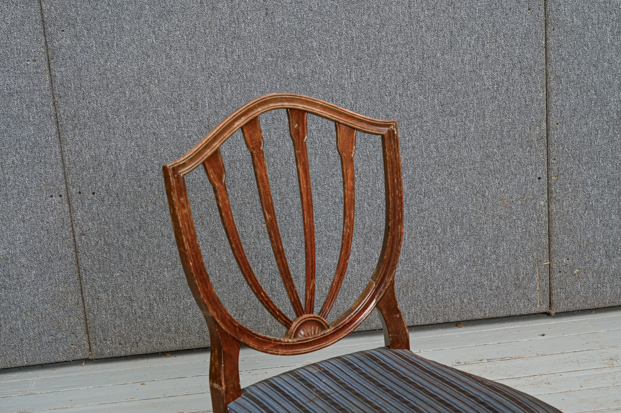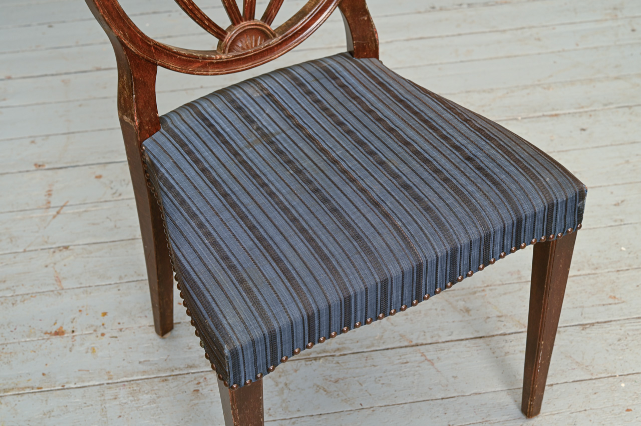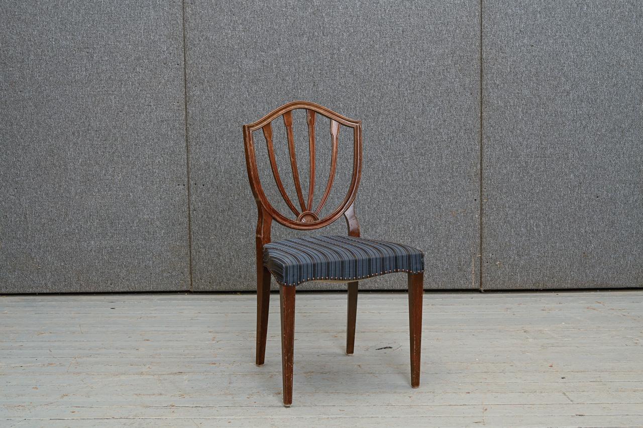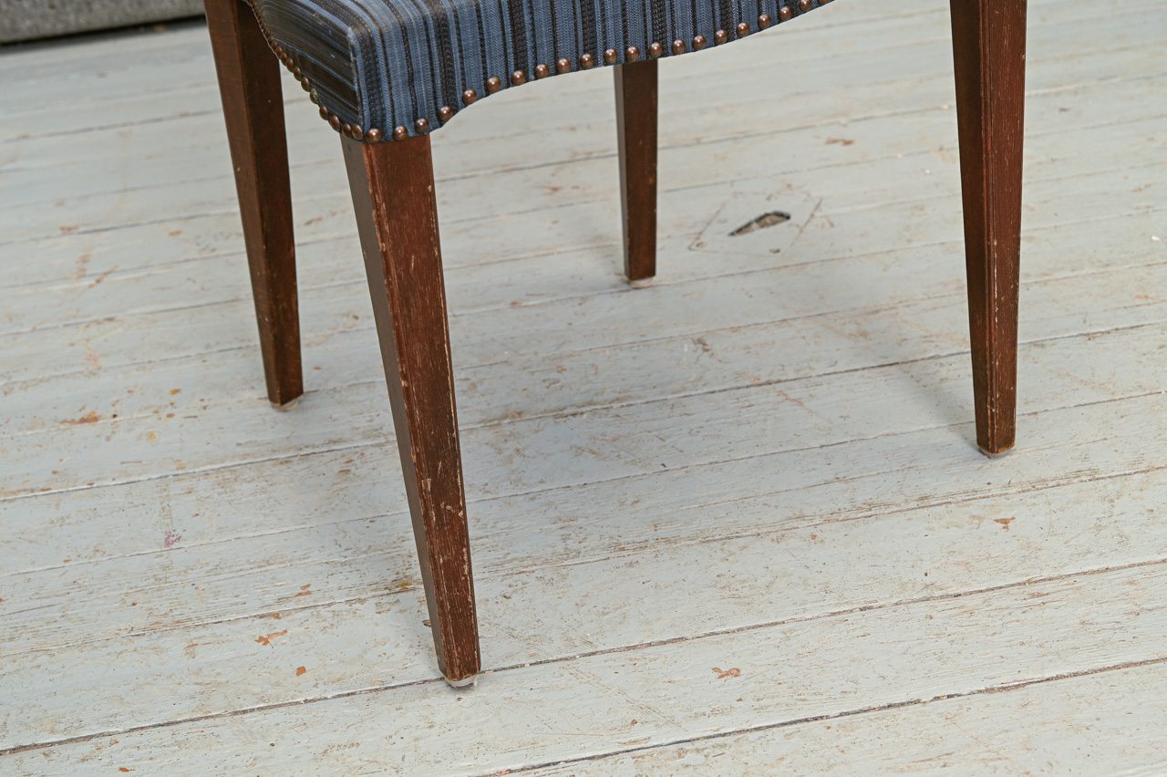 Masīvkoka krēsls ar tumši zila, svītraina mēbeļu auduma un dekoratīvu naglu sēdvirsmas tapsējumu. Kods 160140.