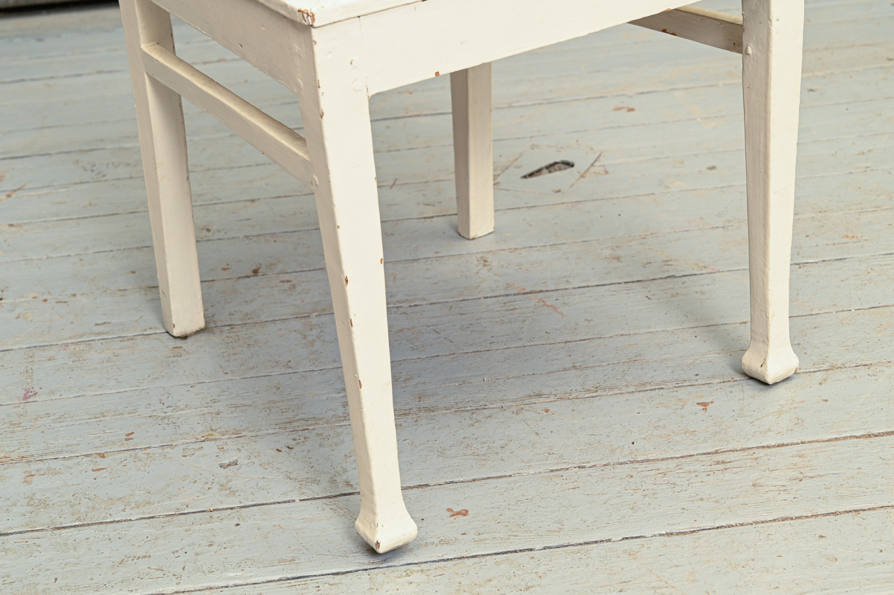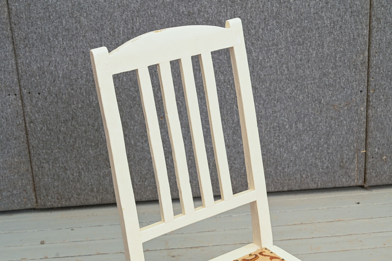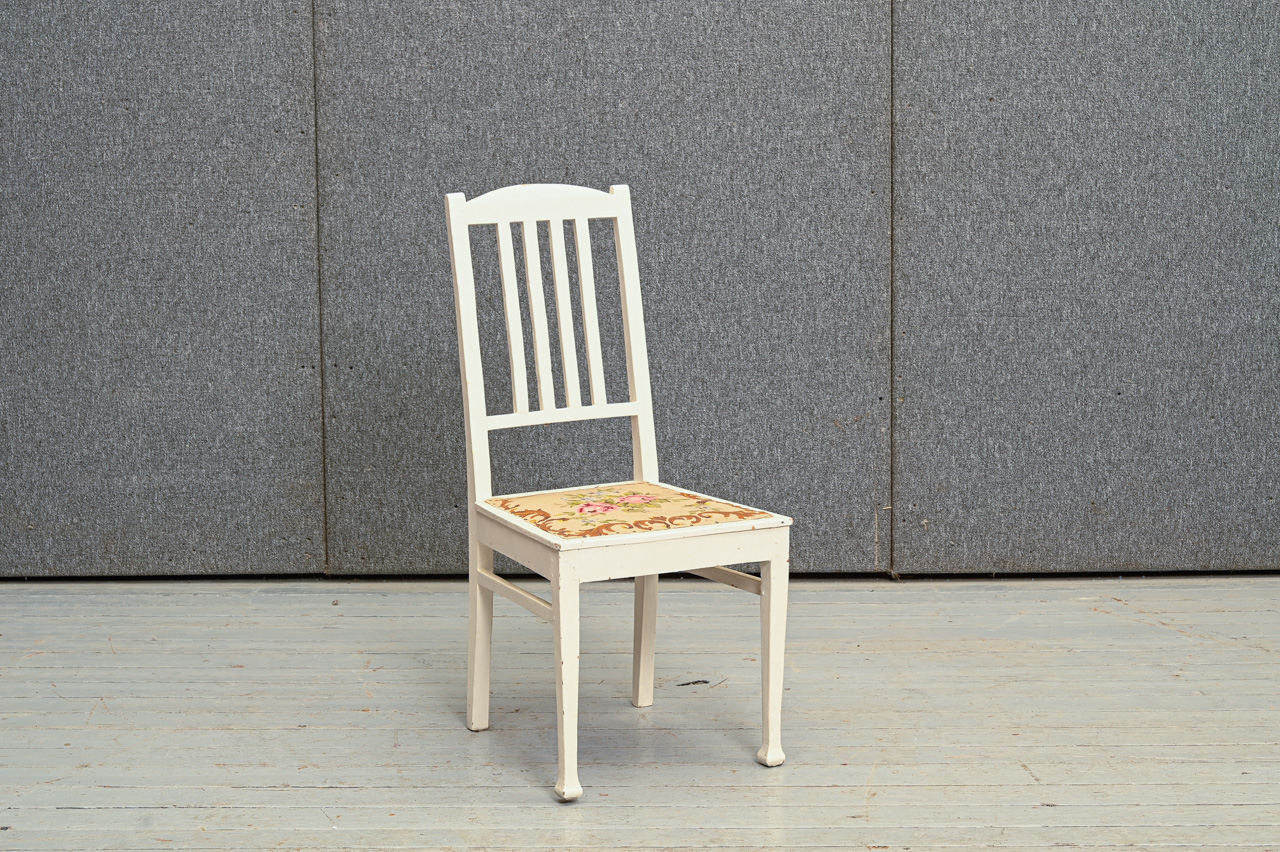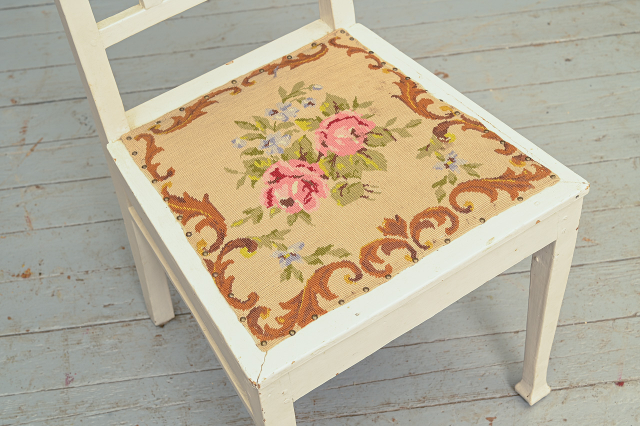 Balti krāsots masīvkoka krēsls. Sēdvirsma ar roku izšūtu tapsējumu un dekoratīvu naglojumu. Kods 160143.