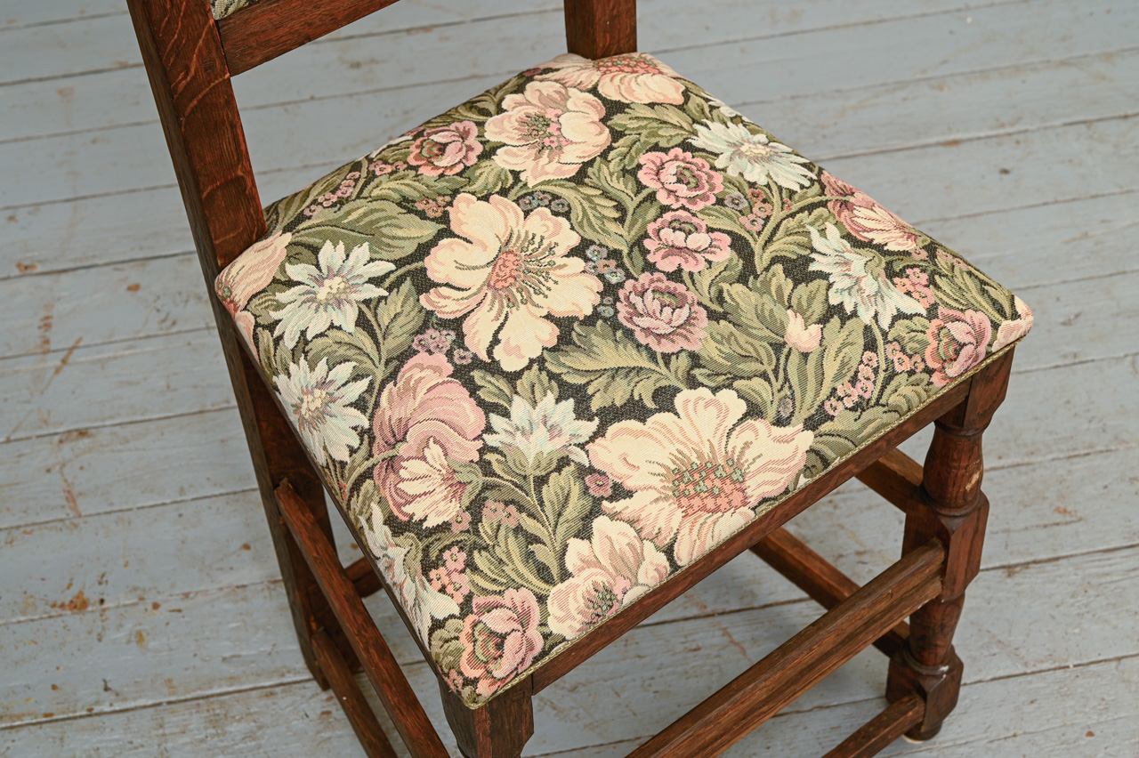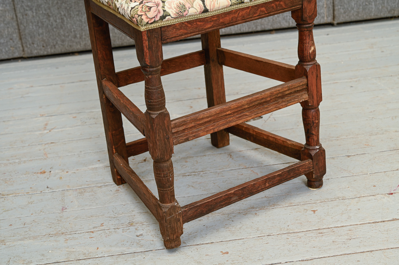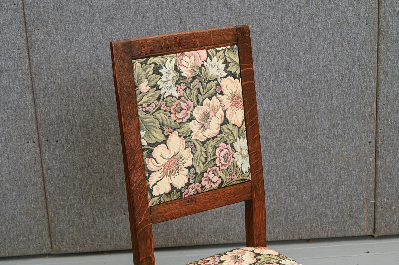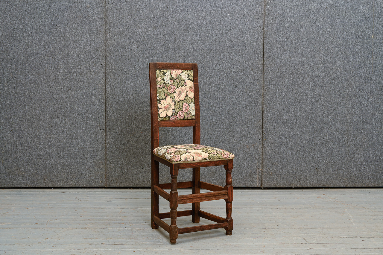 Sens, brūni beicēts ozola masīvkoka krēsls. Sēdvirsma un atzveltne ar ziedu raksta mēbeļu auduma tapsējumu. Kods 160144.
