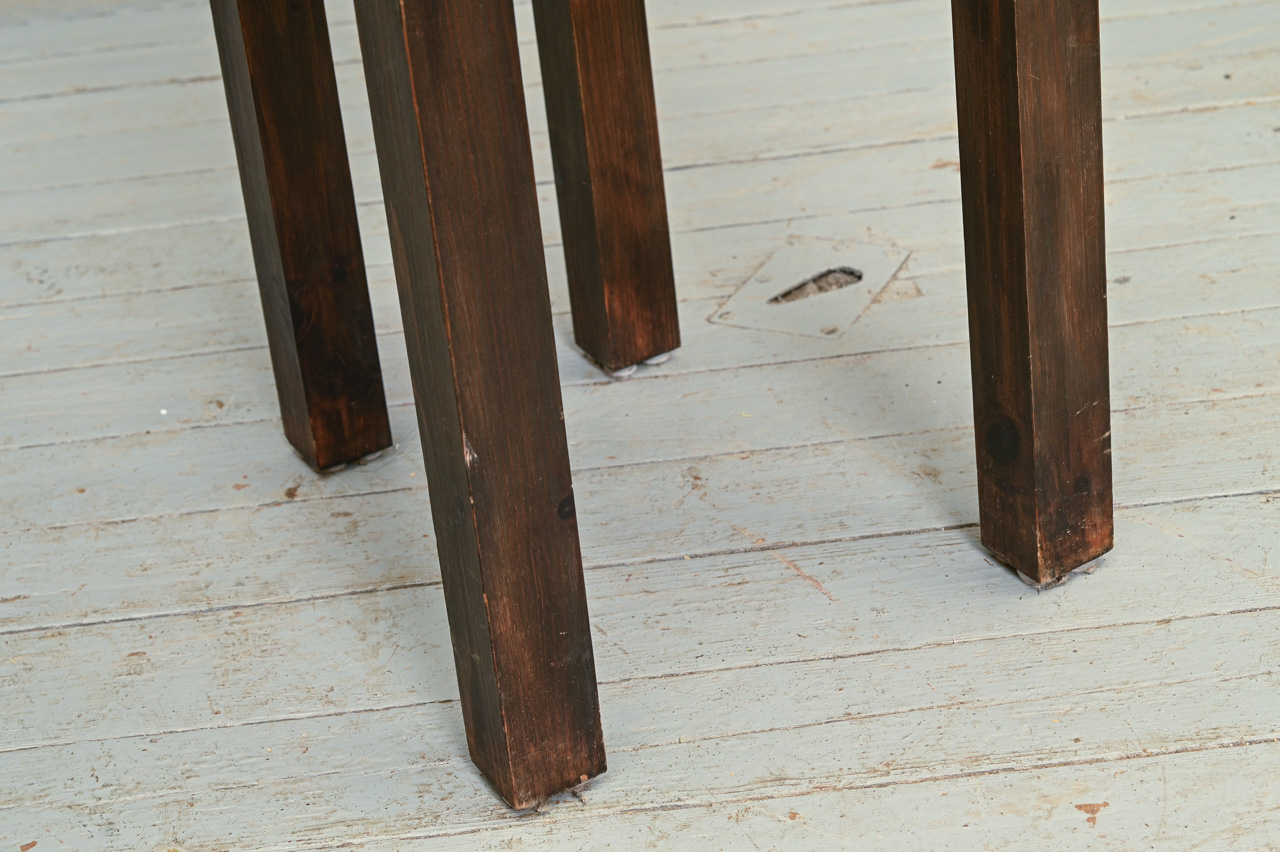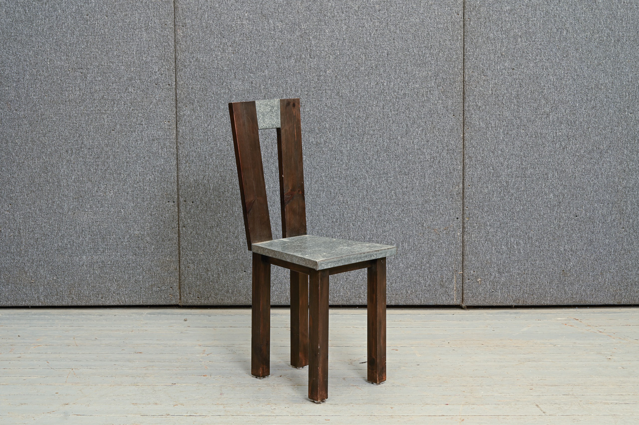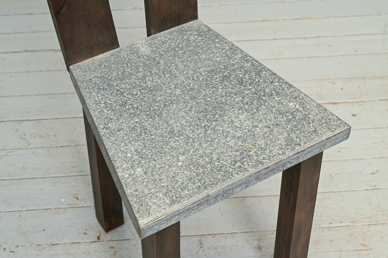 Tumši brūns priedes koka krēsls ar cinkotu sēdvirsmu. Kods 160146.