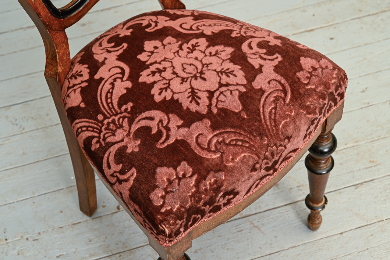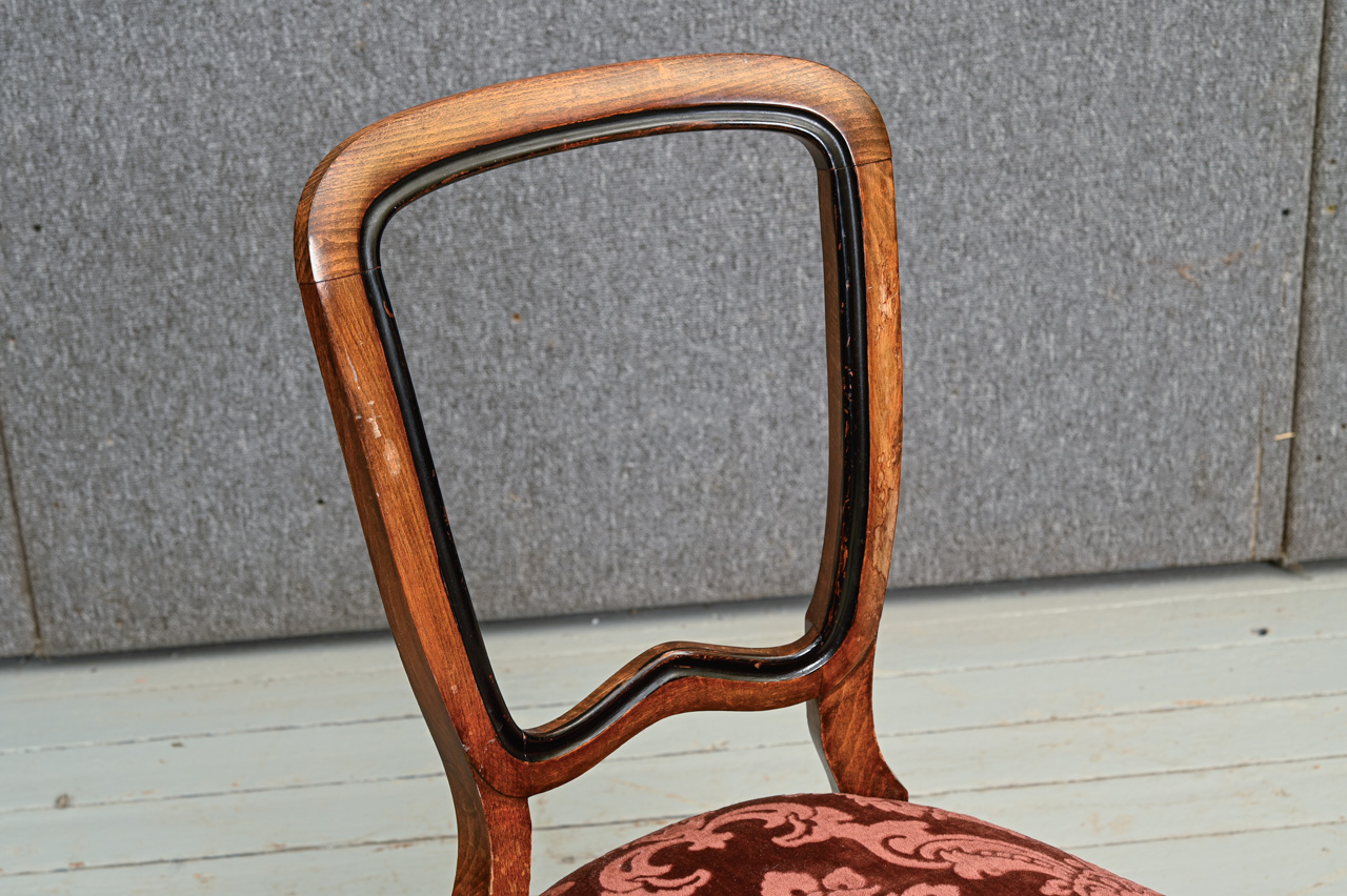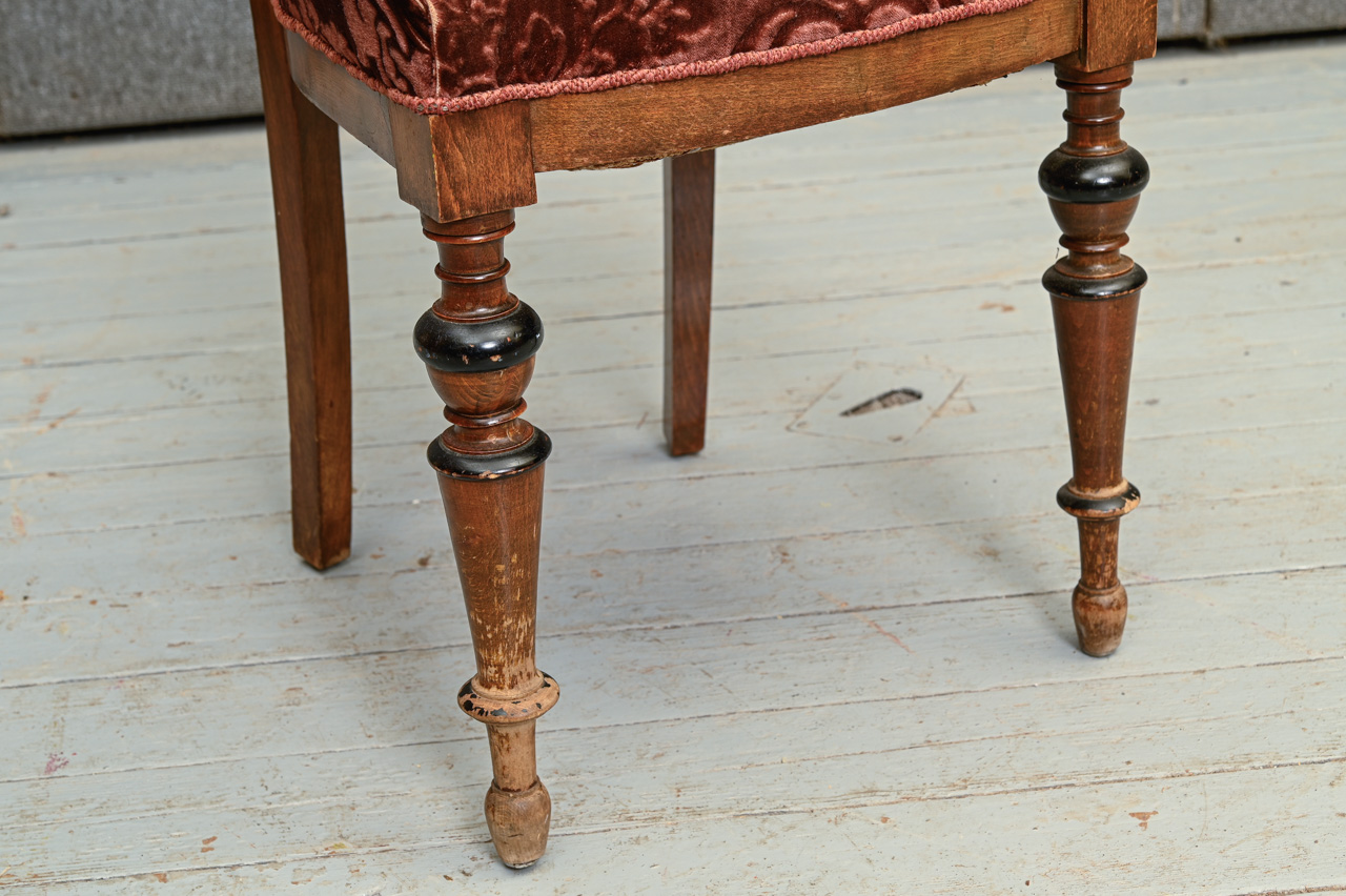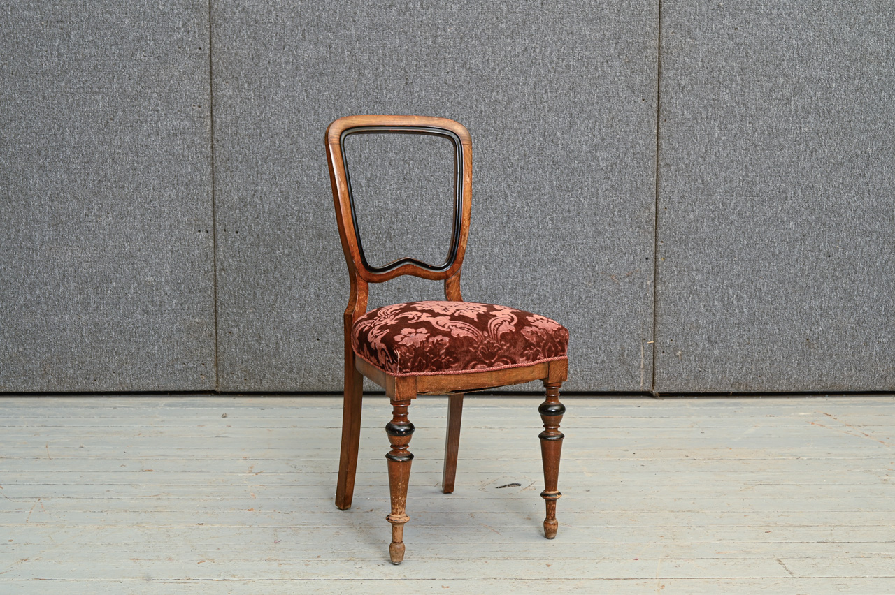 Masīvkoka krēsls ar atsperu sēdvirsmu, tapsētu ar brūngadi bordo krāsas samtainu audumu ar ornamentu. Kods 160147.