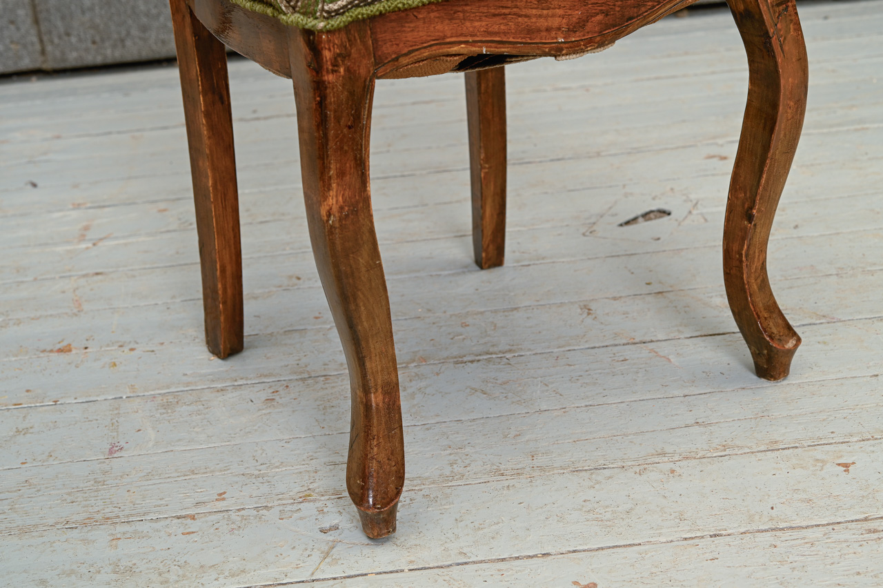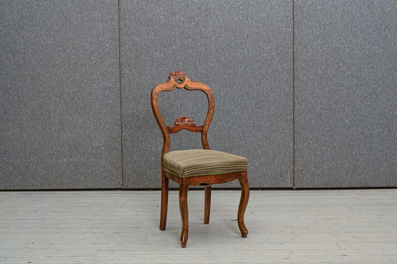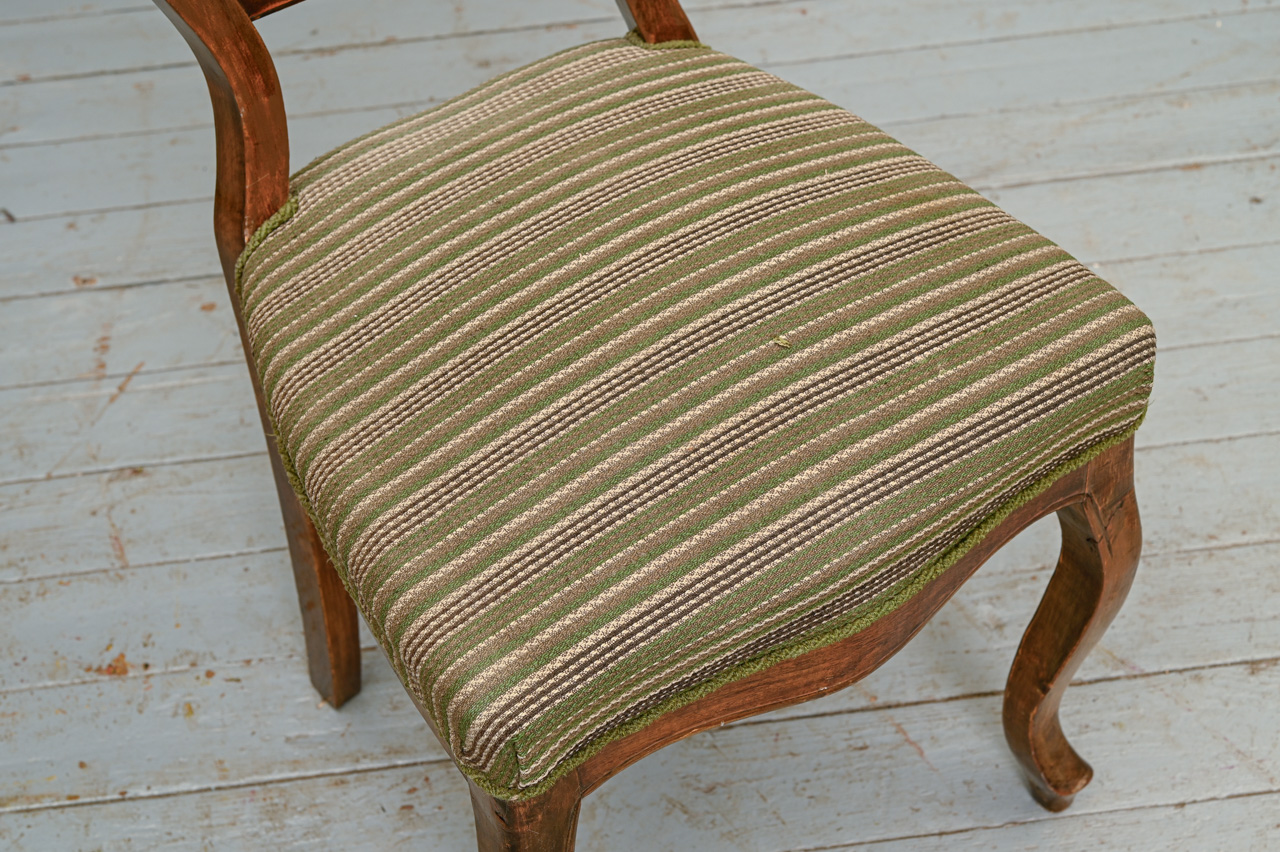 Masīvkoka krēsls ar kokgrebtām detaļām. Sēdvirdma ar zaļa mēbeļu auduma tapsējumu. Kods 160151.