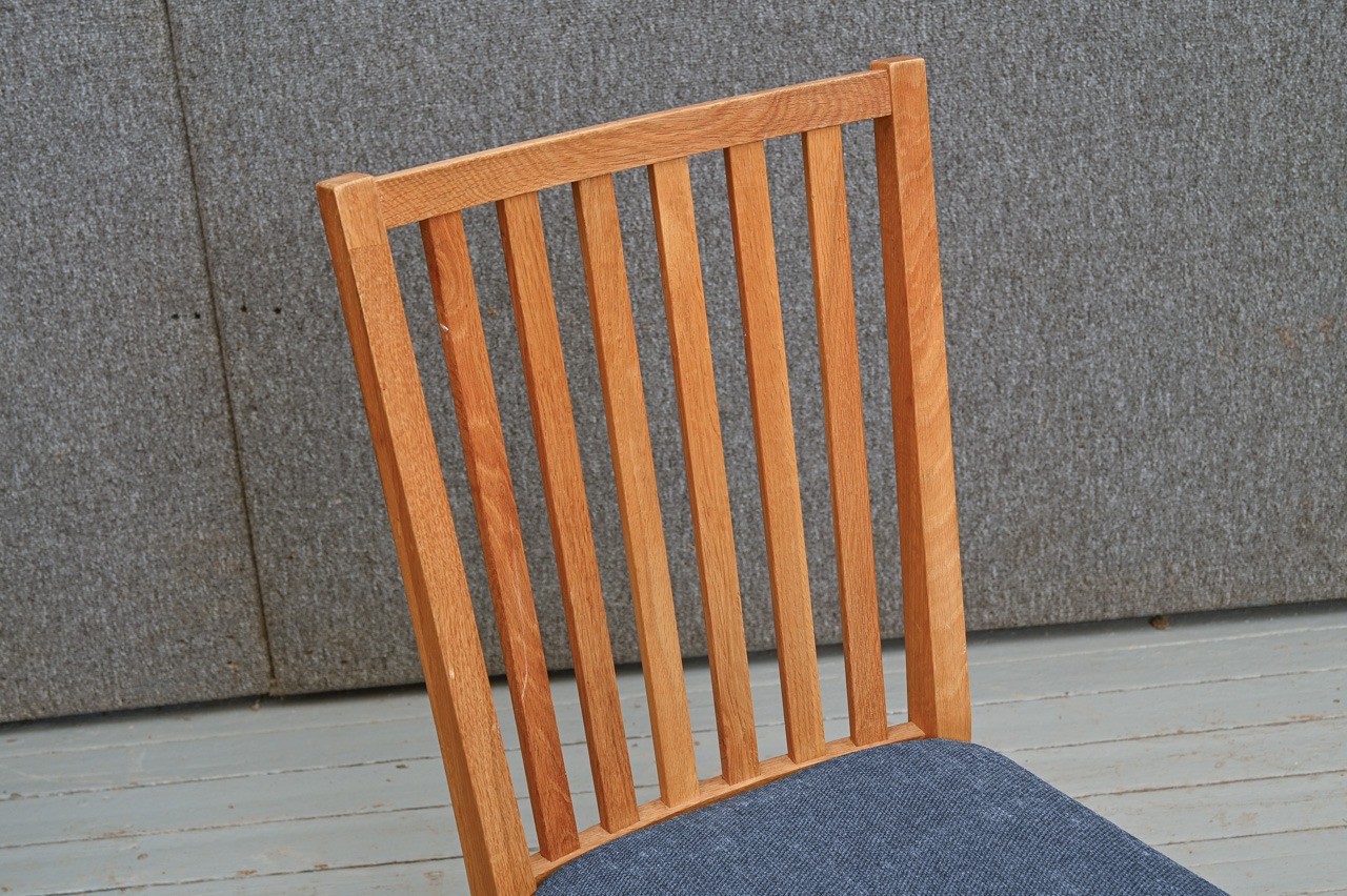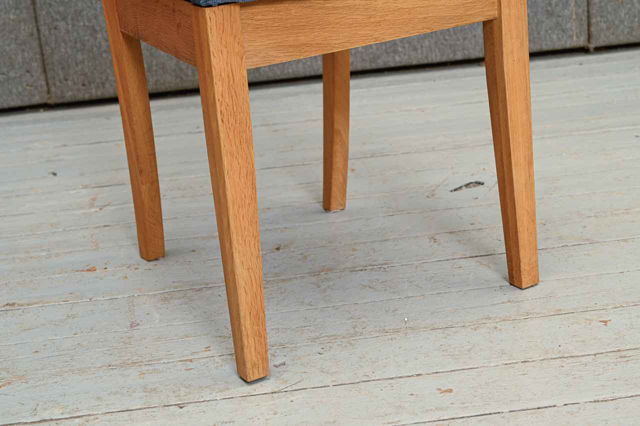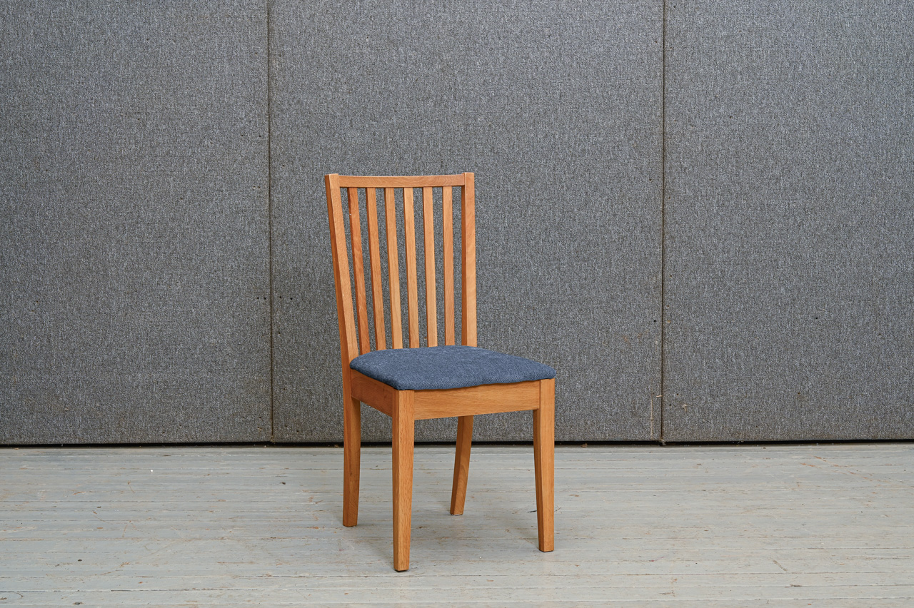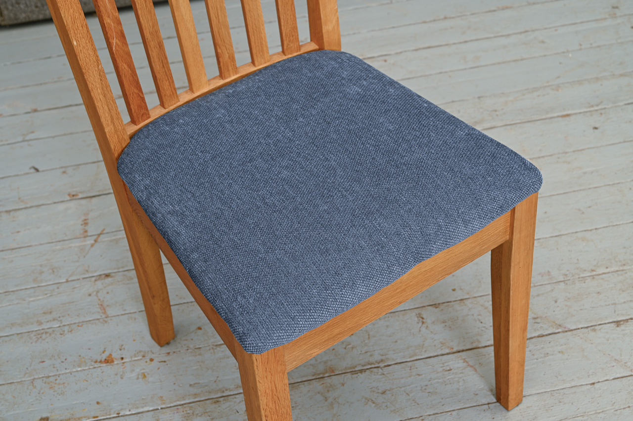 Masīvkoka krēsls ar jaunu, zilas krāsas auduma sēdvirsmas tapsējumu. Kods 160159.