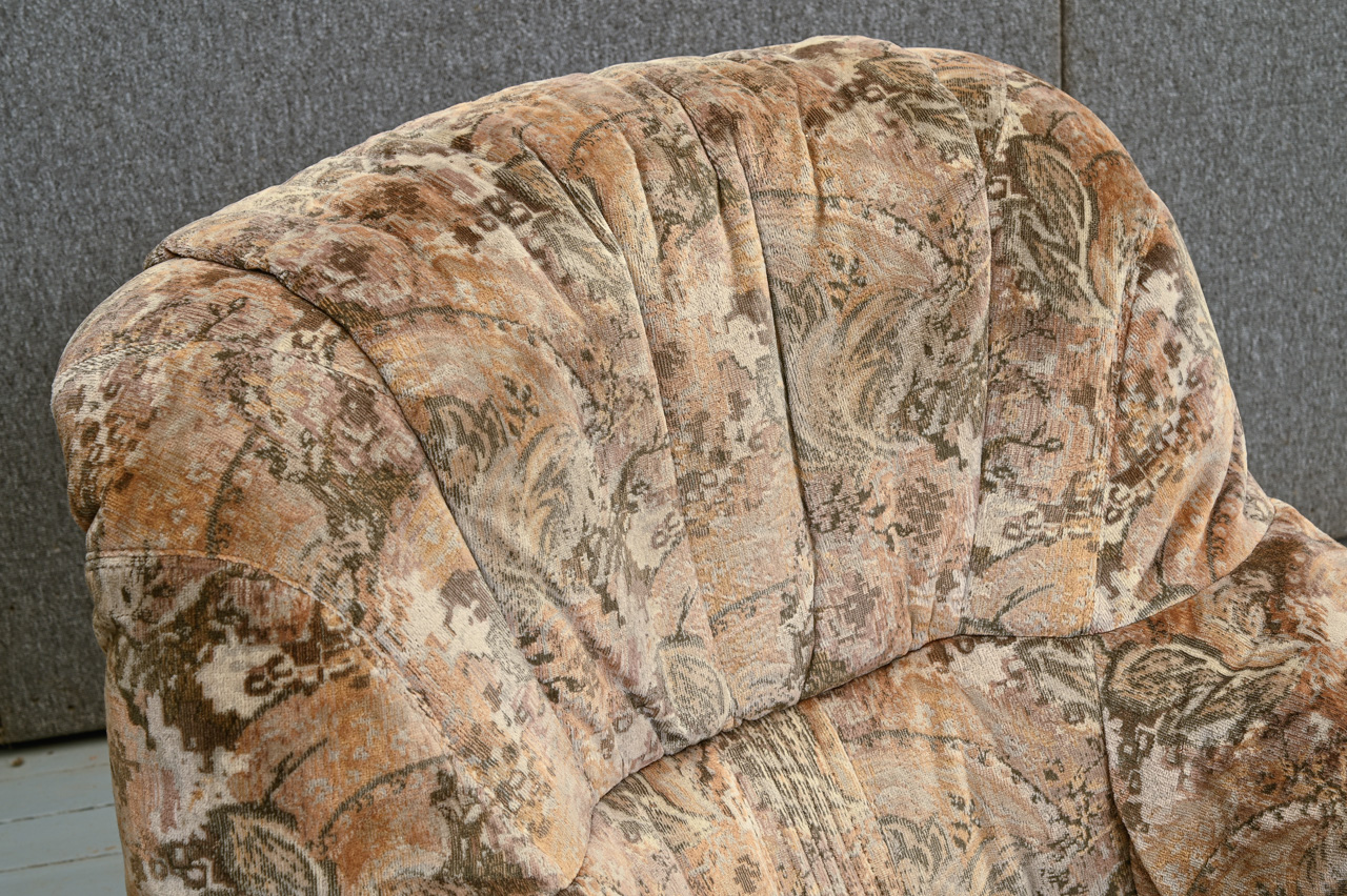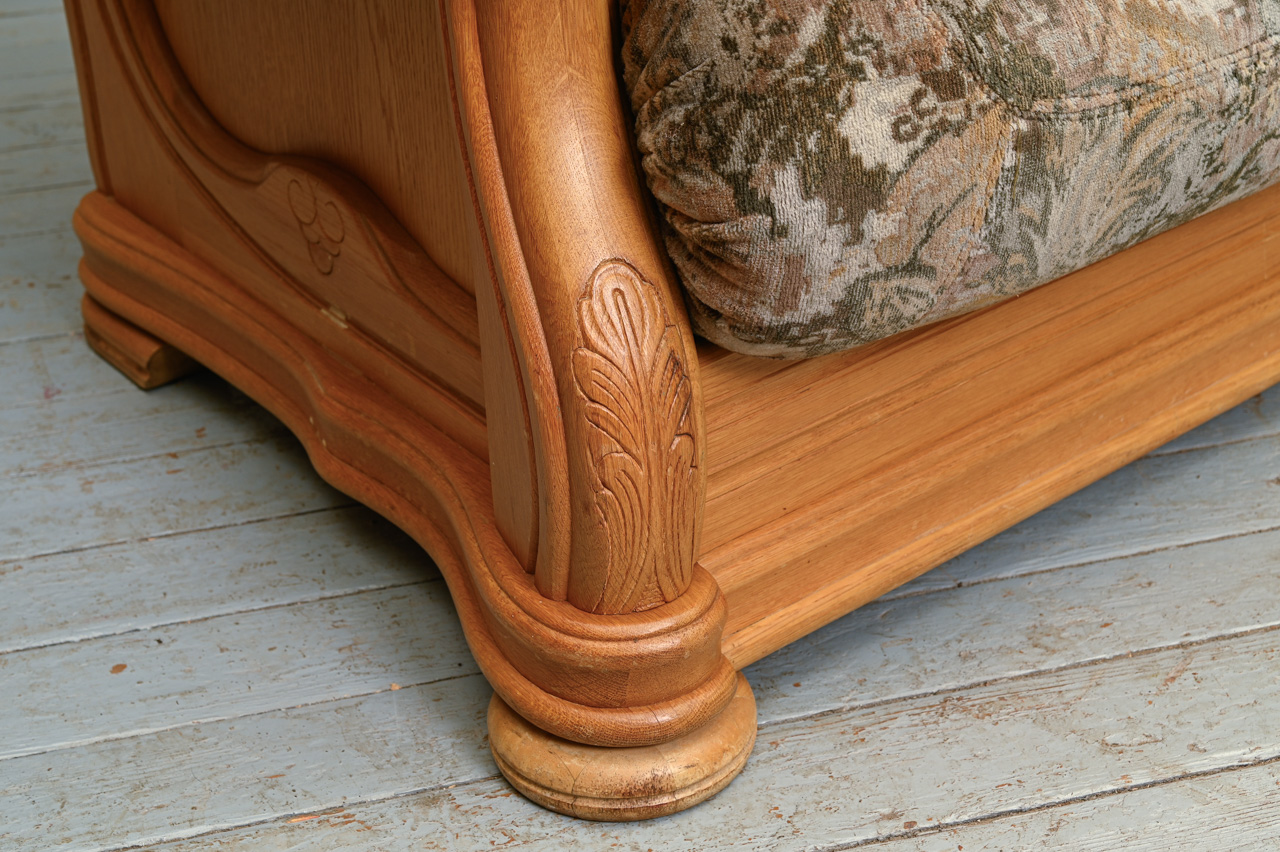 Mīkstais krēsls masīvkoka rāmī, tapsēts ar raibu mēbeļu audumu. Kods 260035.