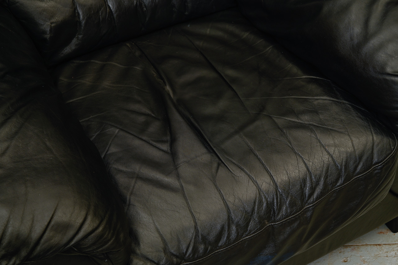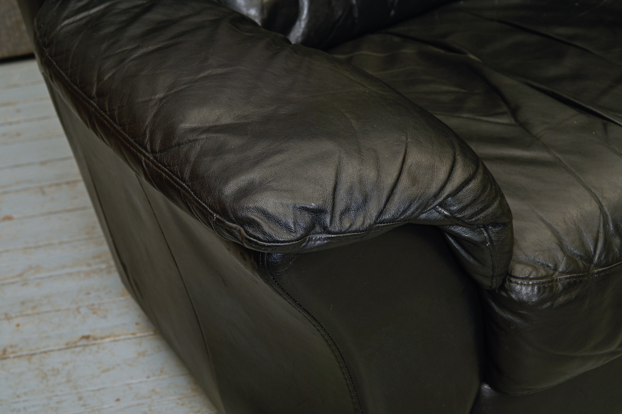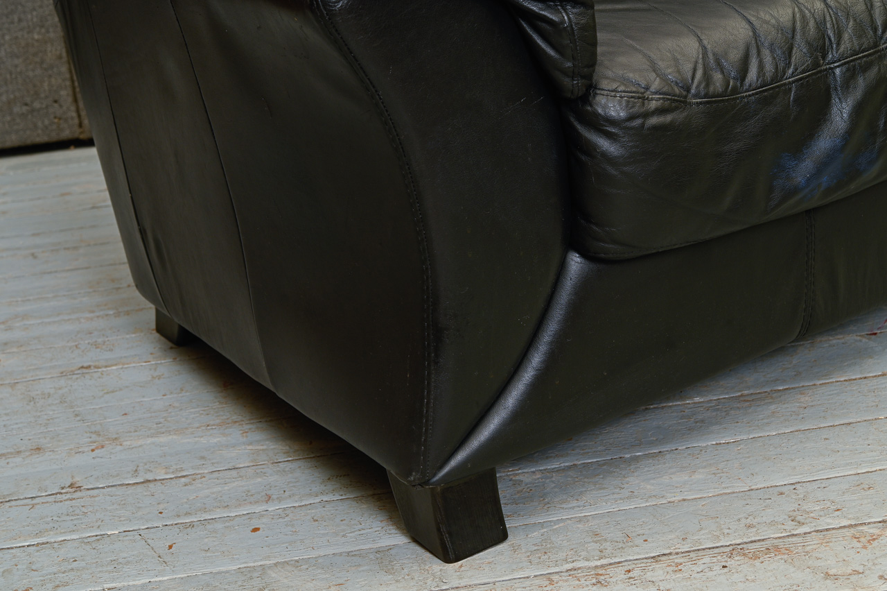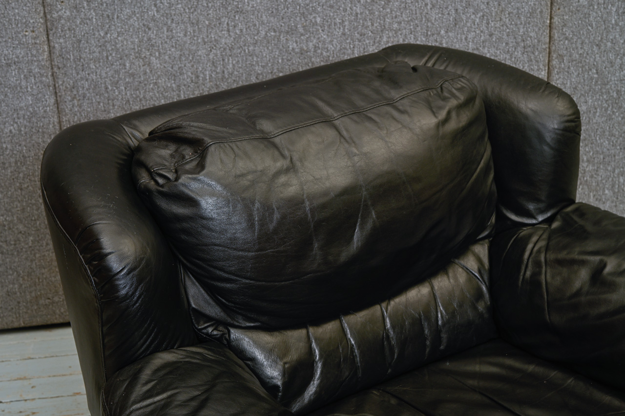 Mīkstais krēsls, tapsēts ar melnu dabīgo ādu. Ādas imitācijas tapsējums fasādes daļā zem sēdvirsmas, sānos un aizmugurē. Kods 260045.