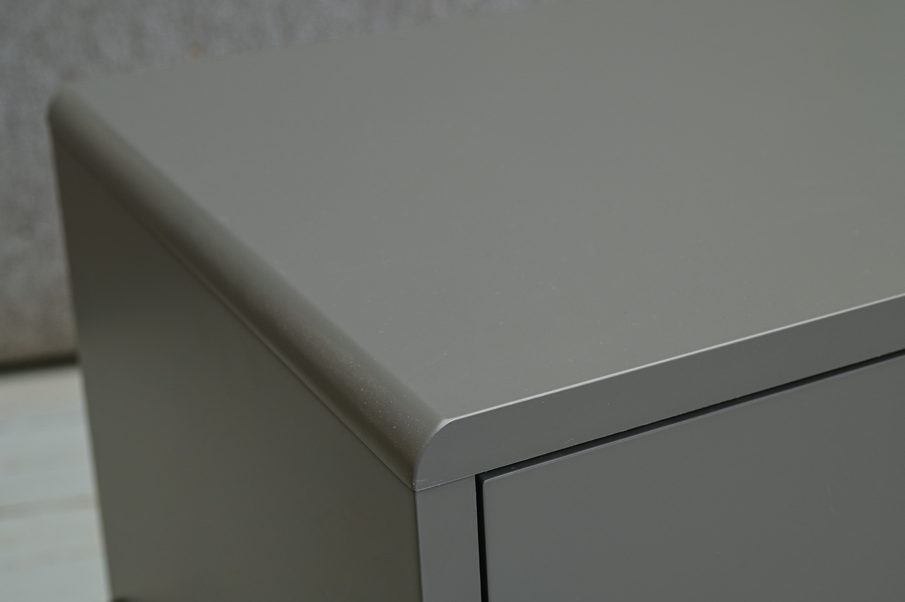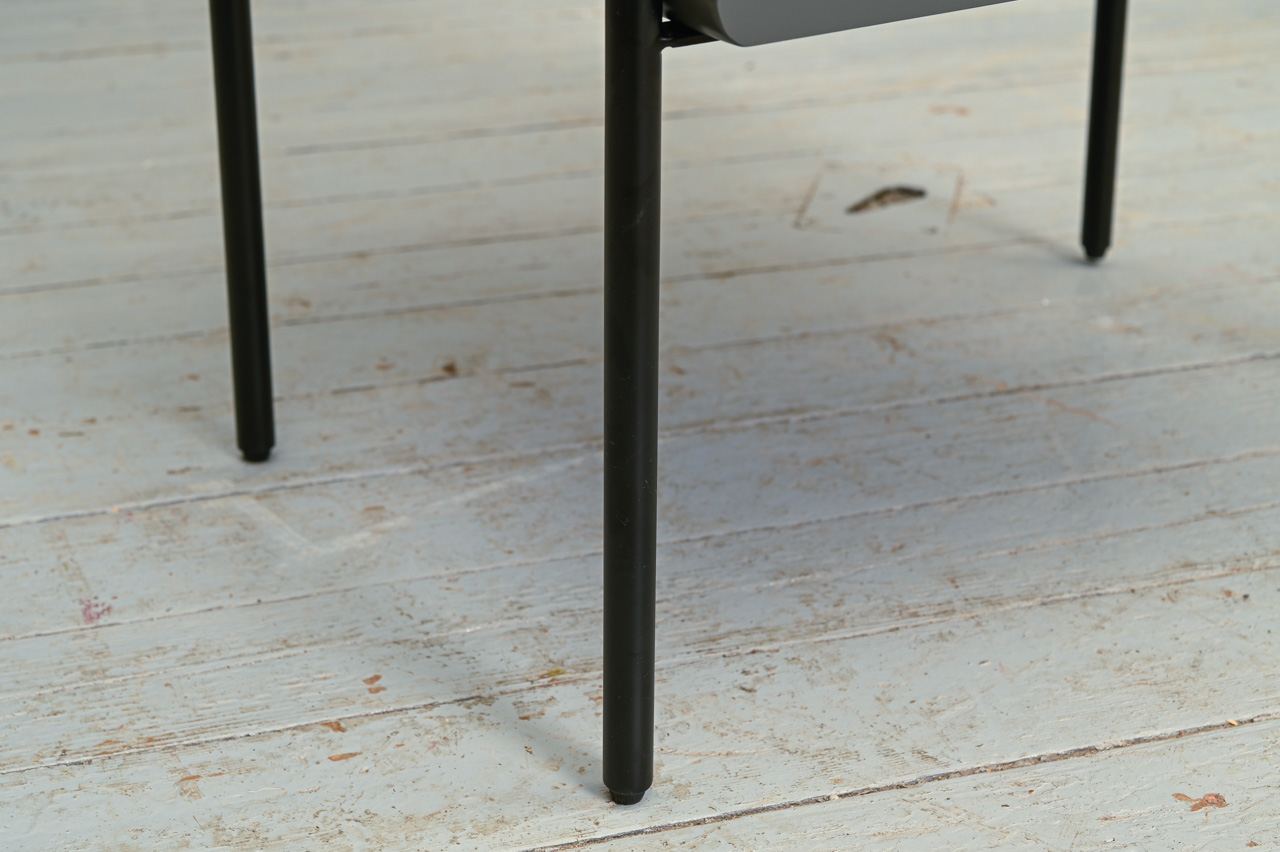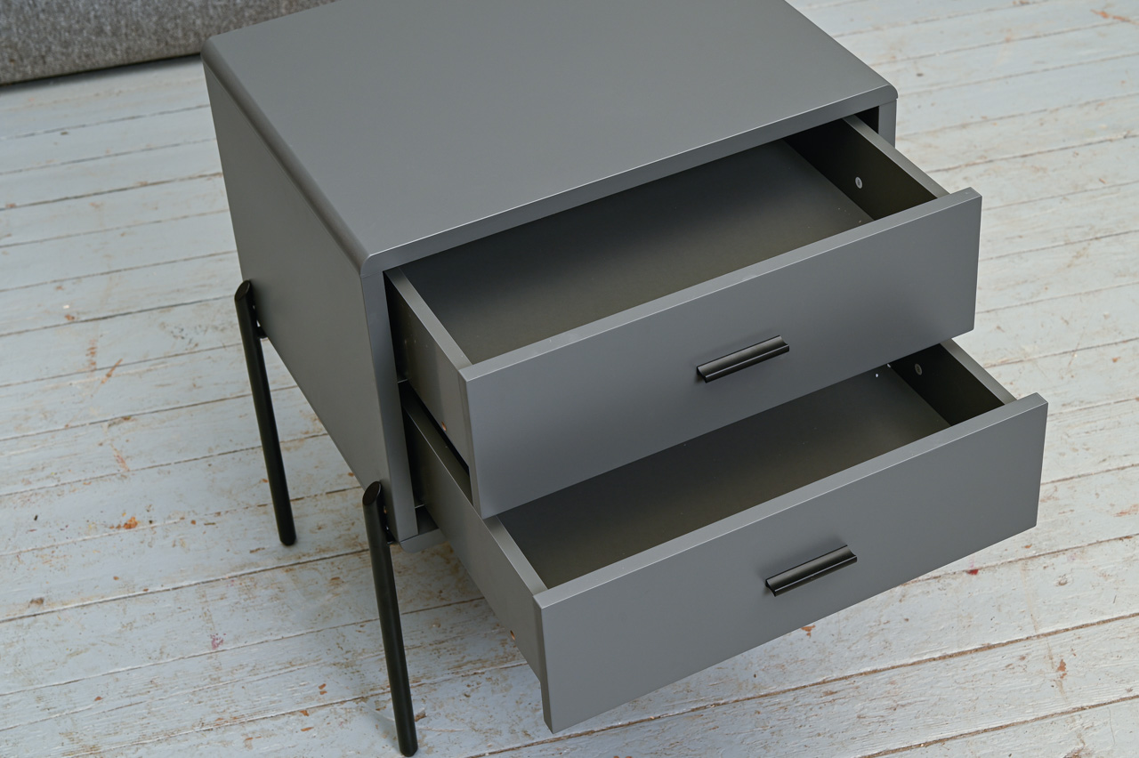 Pelēks MDF naktsskapītis uz melnām metāla kājiņām. 2 atvilktnes ar soft close mehānismu. Nelietots, salikts. Kods 408307.