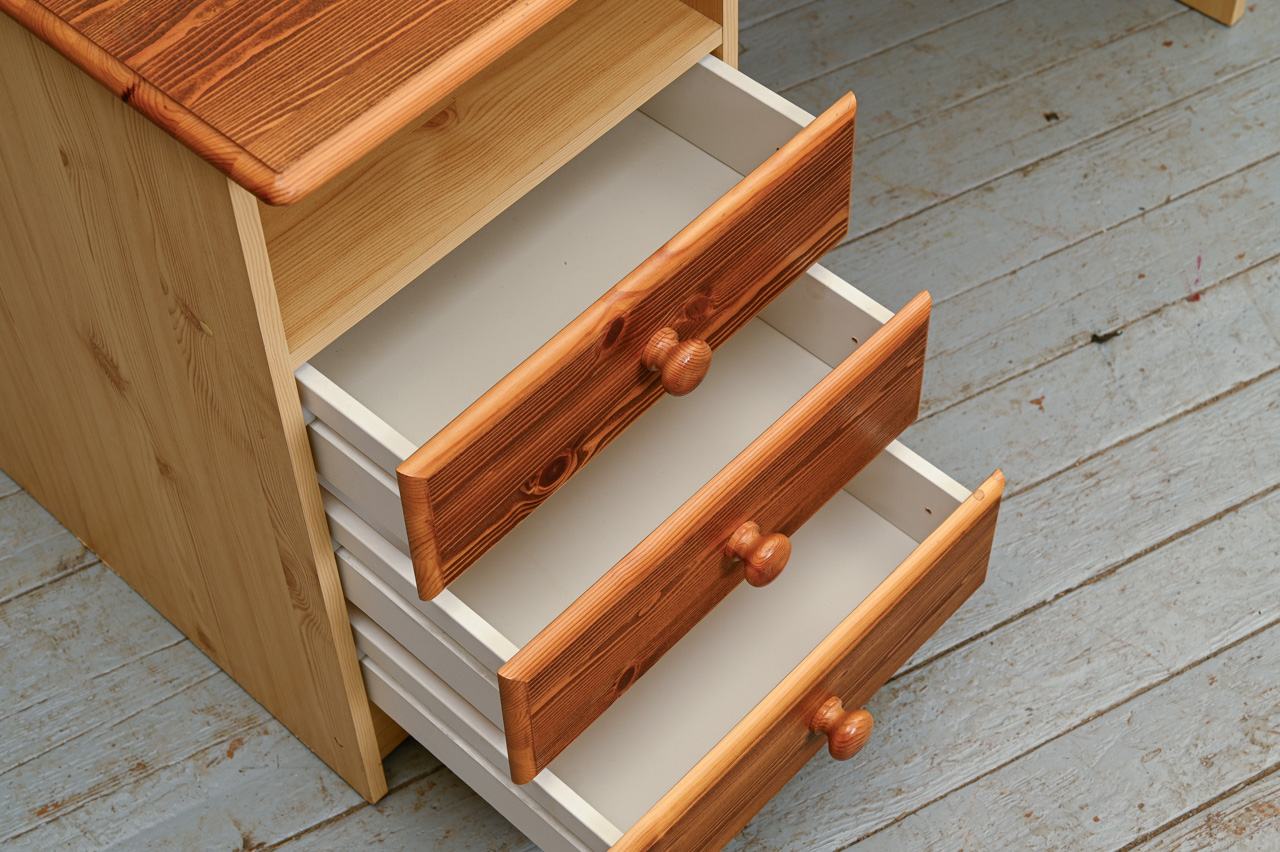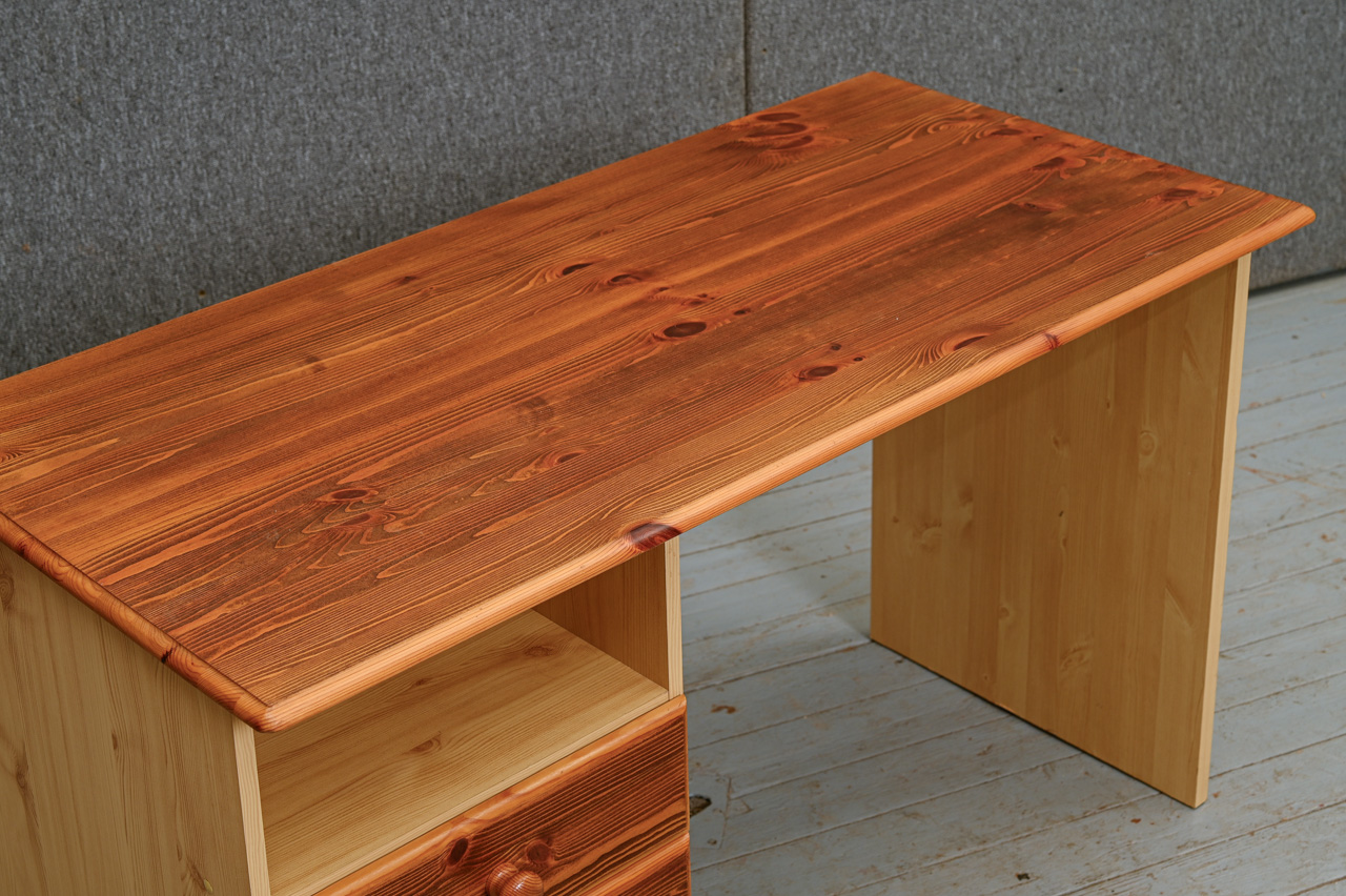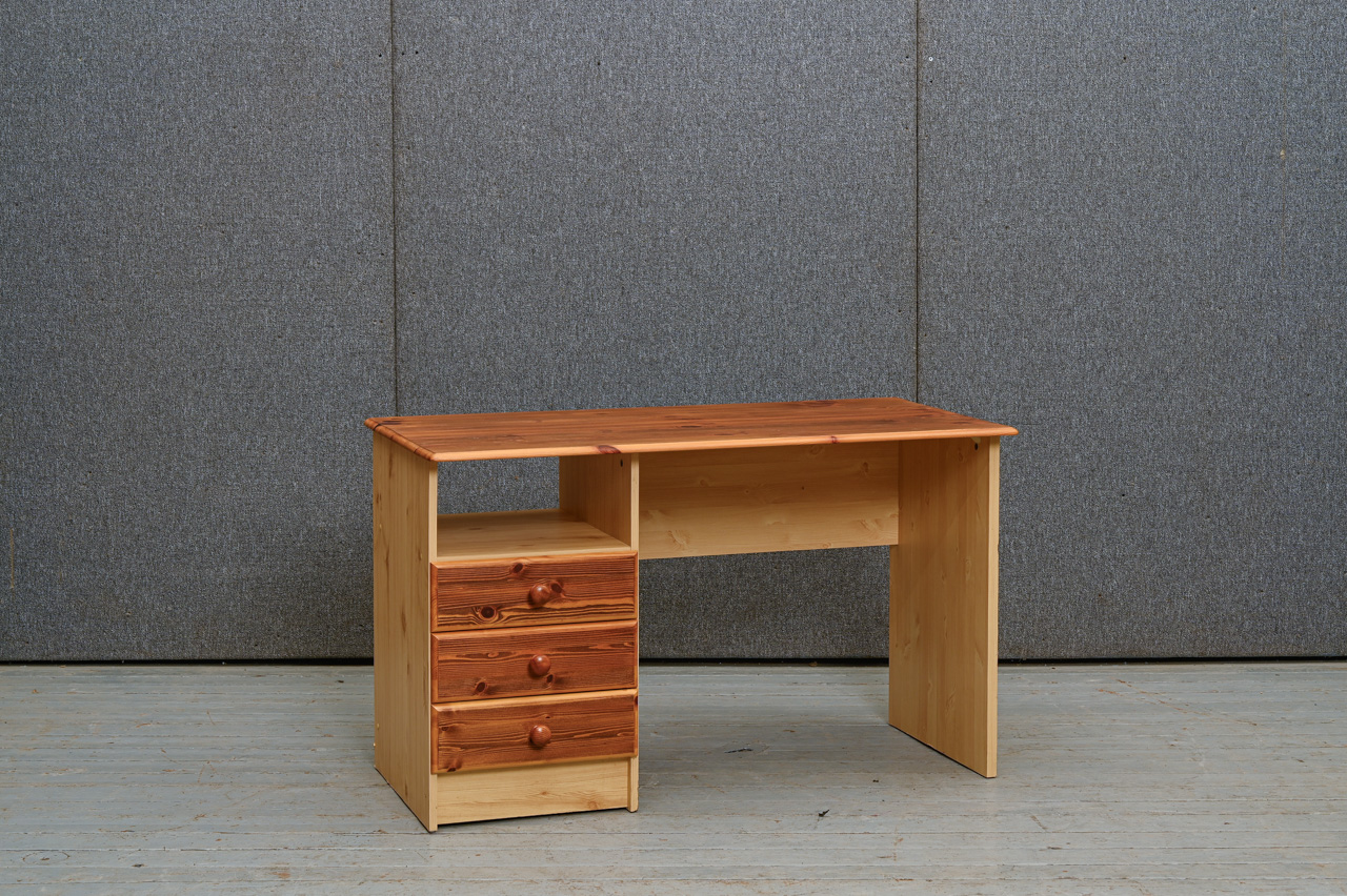 Kokskaidu plātnes rakstāmgalds ar beicētas un eļļotas priedes koka virsmu un atvilktņu fasādi. Kods 360127.