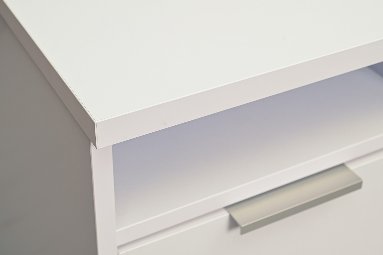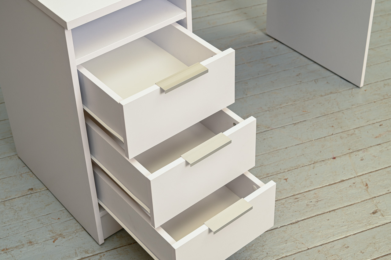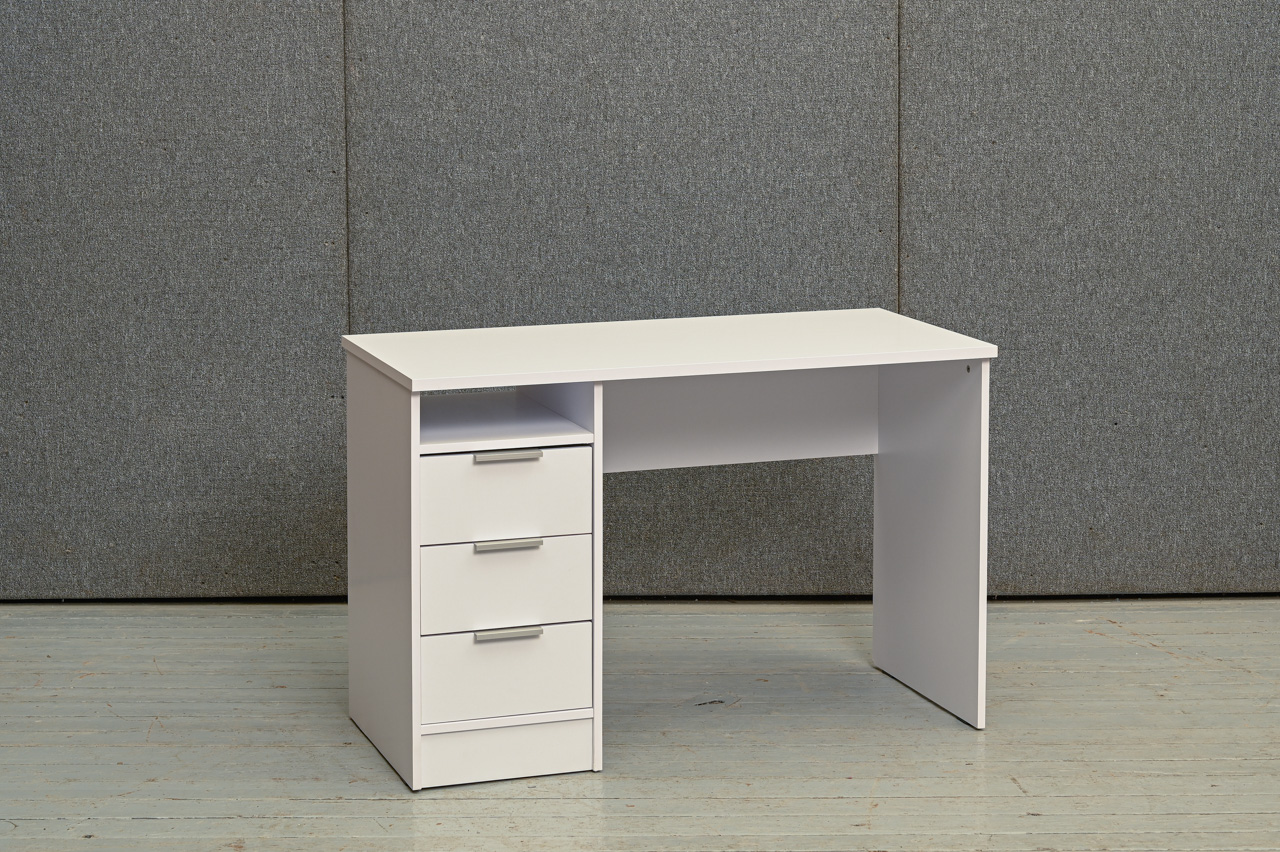 Balti laminēts kokskaidu plātnes rakstāmgalds ar 3 atvilktnēm. Nelietots, salikts. Kods 308319B. Pieejams šāds pats galds ar 120cm garu galda virsmu, kods 308319.
