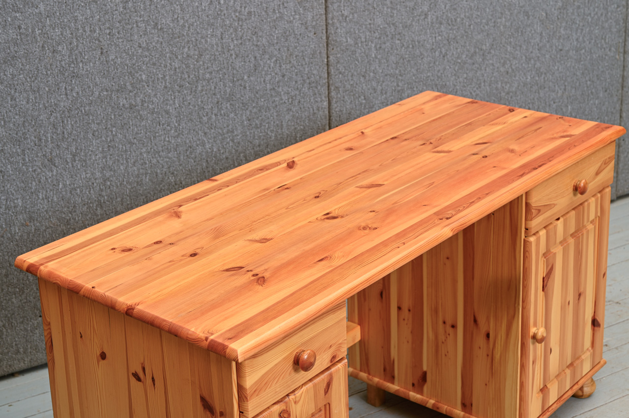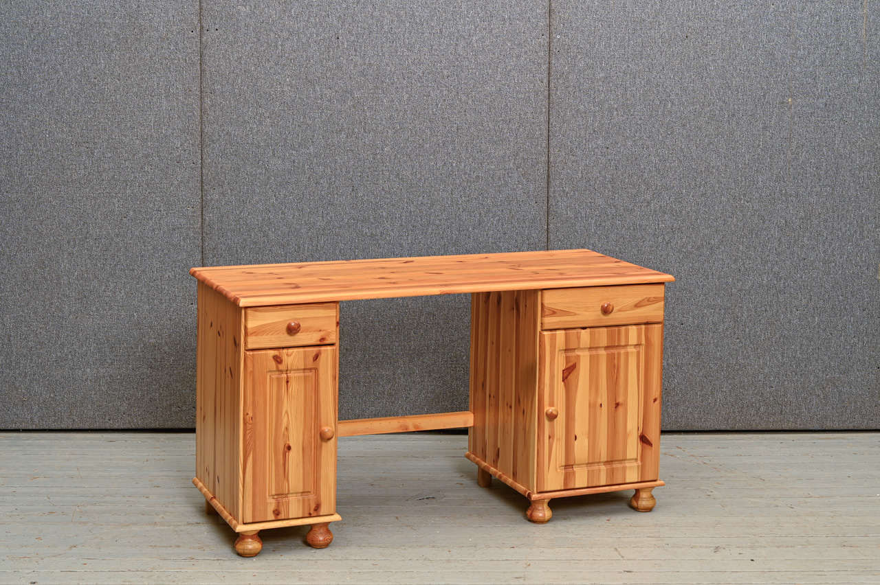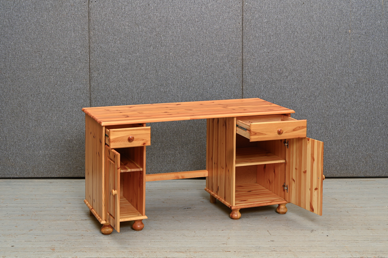 Priedes koka rakstāmgalds ar 2 skapīšiem. Gaiši beicēts, lakots. Kods 360115.