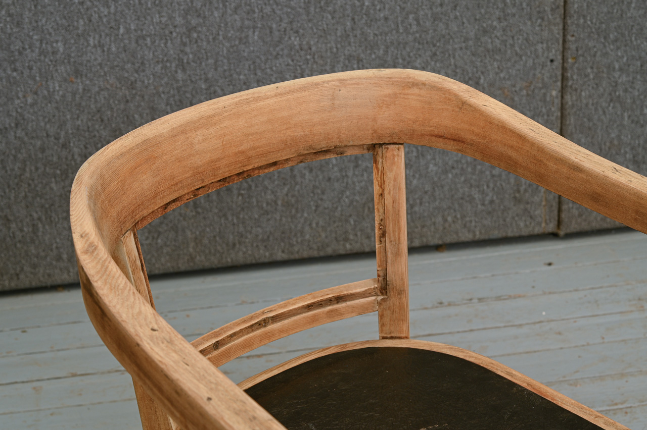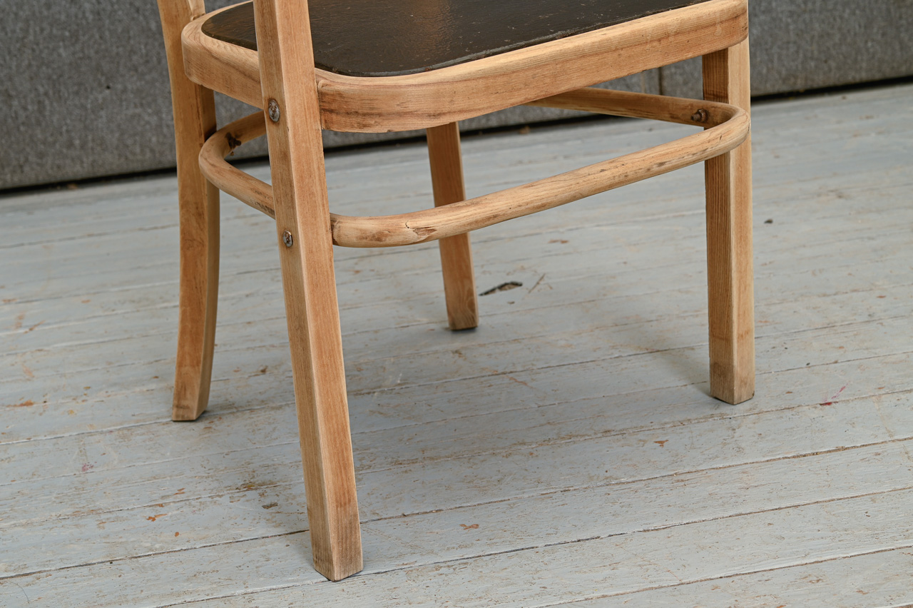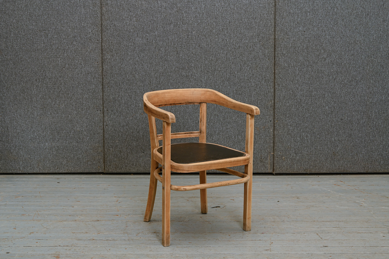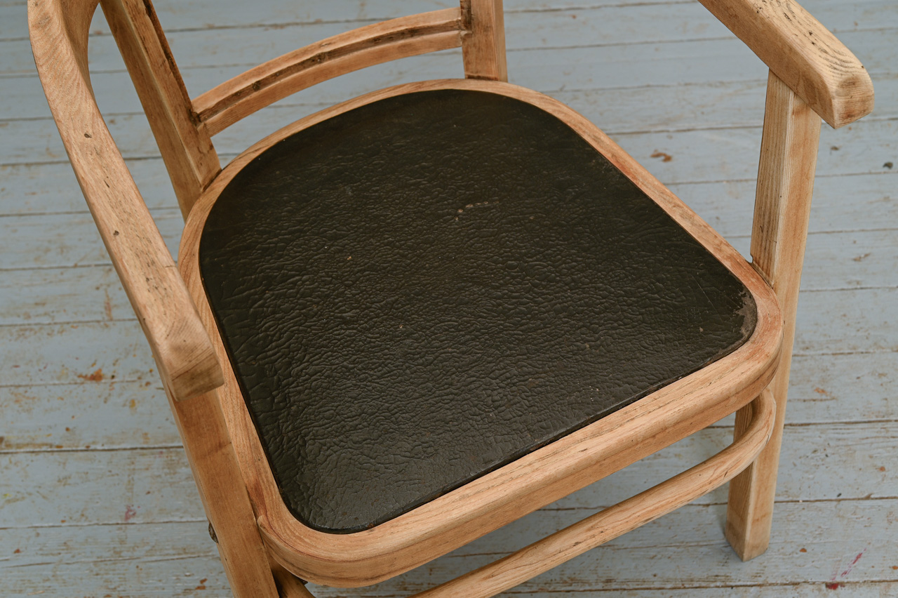 Sens masīvkoka krēsls ar paroceņiem, bez atzveltnes pildiņa. Sēdvirsma ar melnas ādas imitācijas tapsējumu. Krēsls ir noslīpēts un gatavs tālākai apstrādei. Kods 160175.