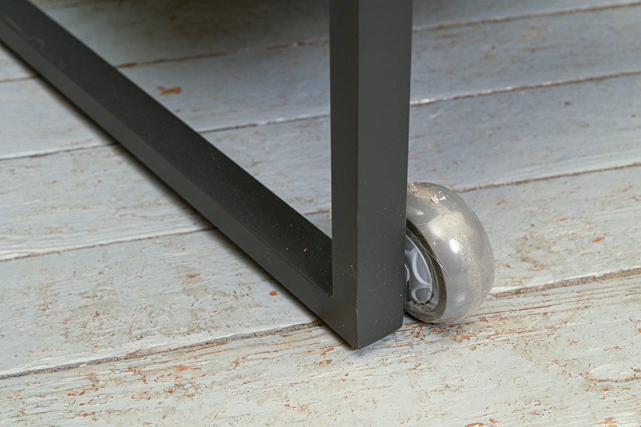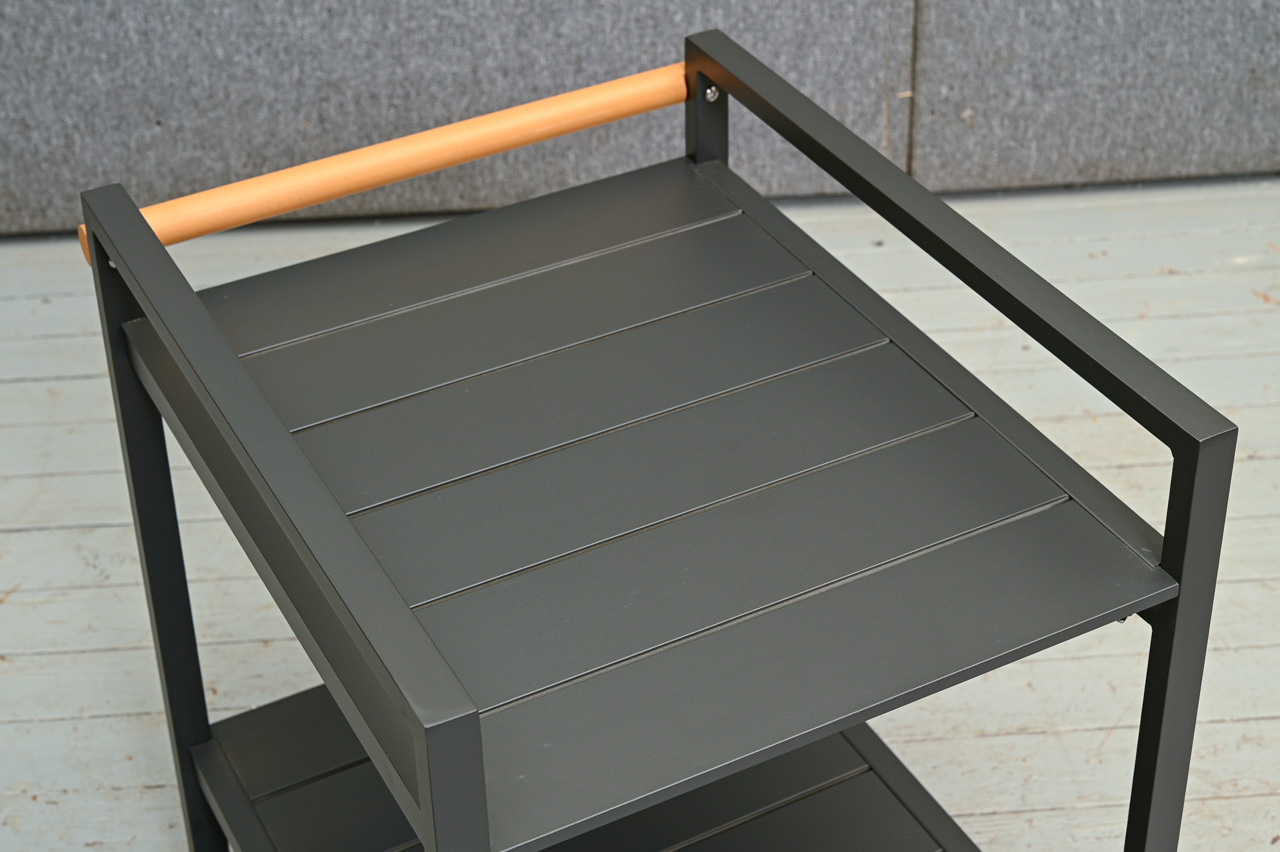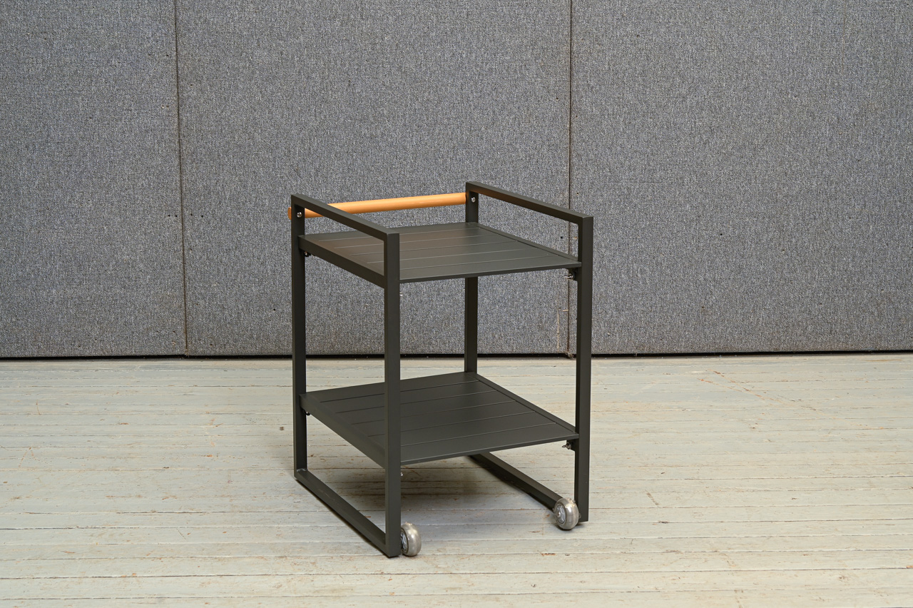 Alumīnija servēšanas ratiņi ar koka rokturi un plastmasa ritentiņiem vieglai pārvietošanai. Nelietots, salikts. Kods 808356.