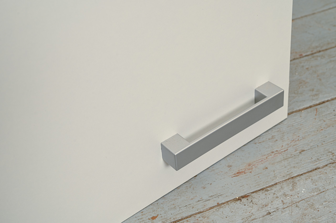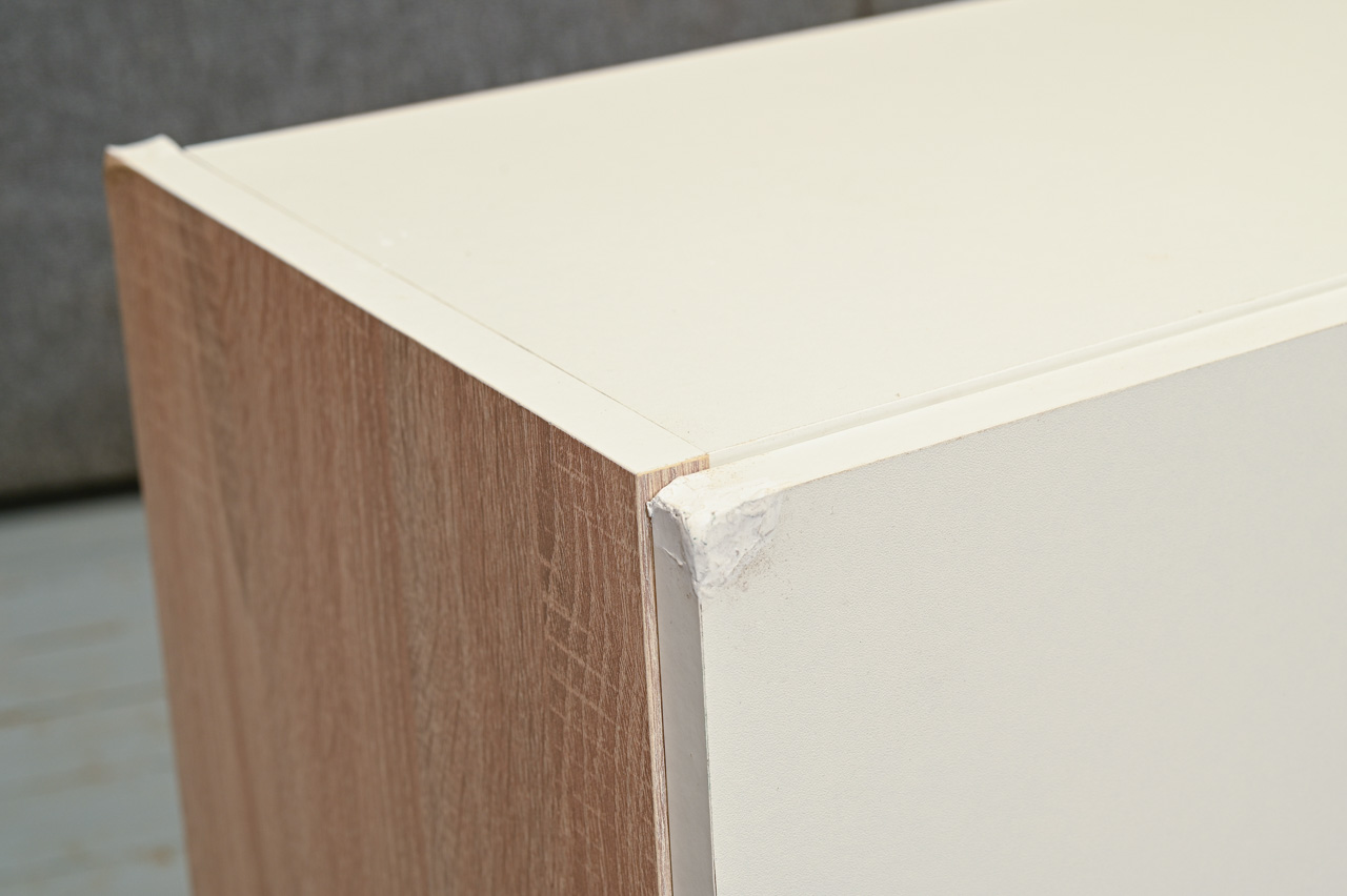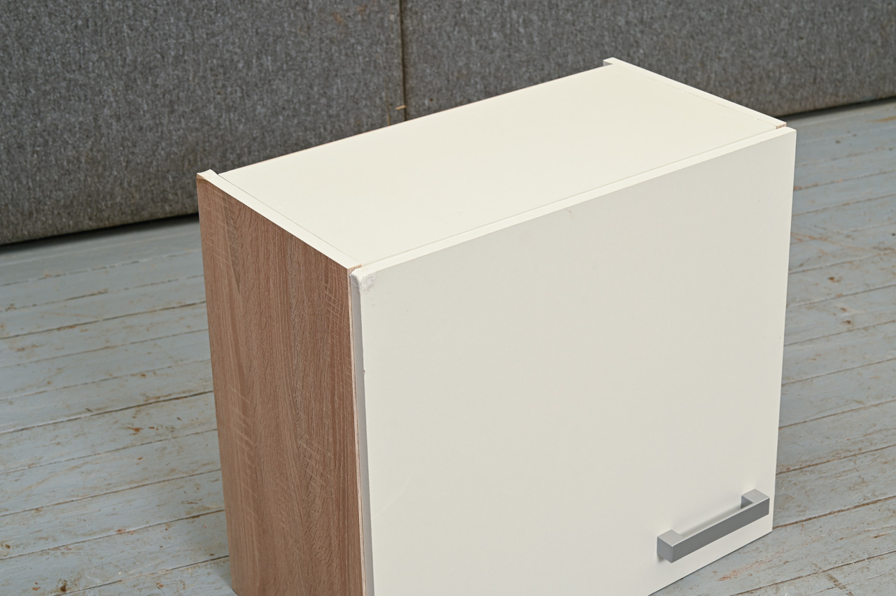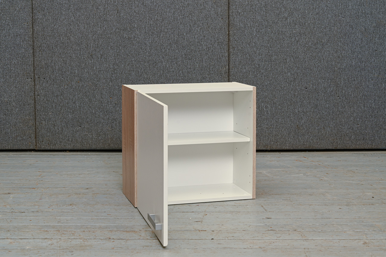 Kokskaidu plātnes sienas skapītis ar baltu fasādi un koka imitācijas pārklājumu sānos. Sienas stiprinājums un montāžas komplekts nav iekļauts komplektā. Nelietots, salikts. Kods 408343.