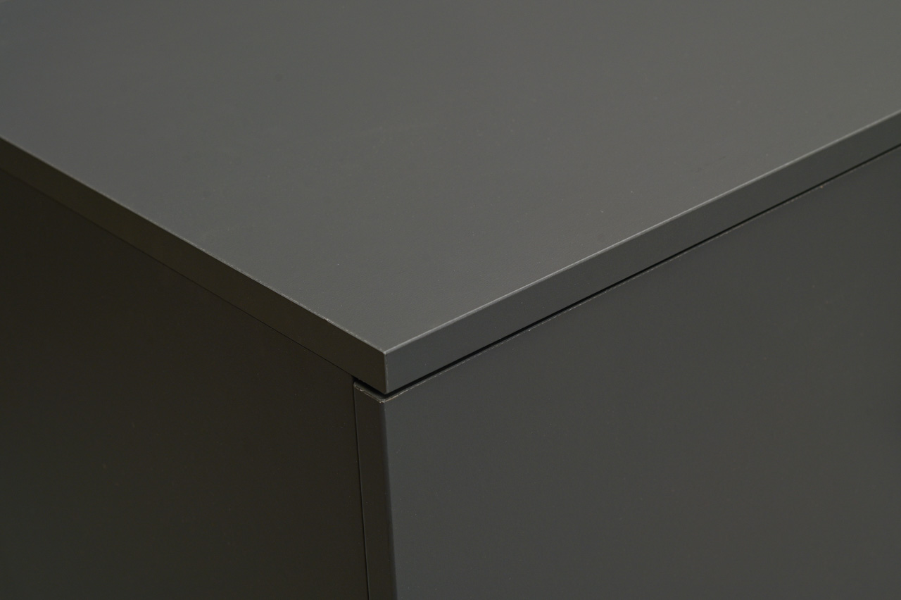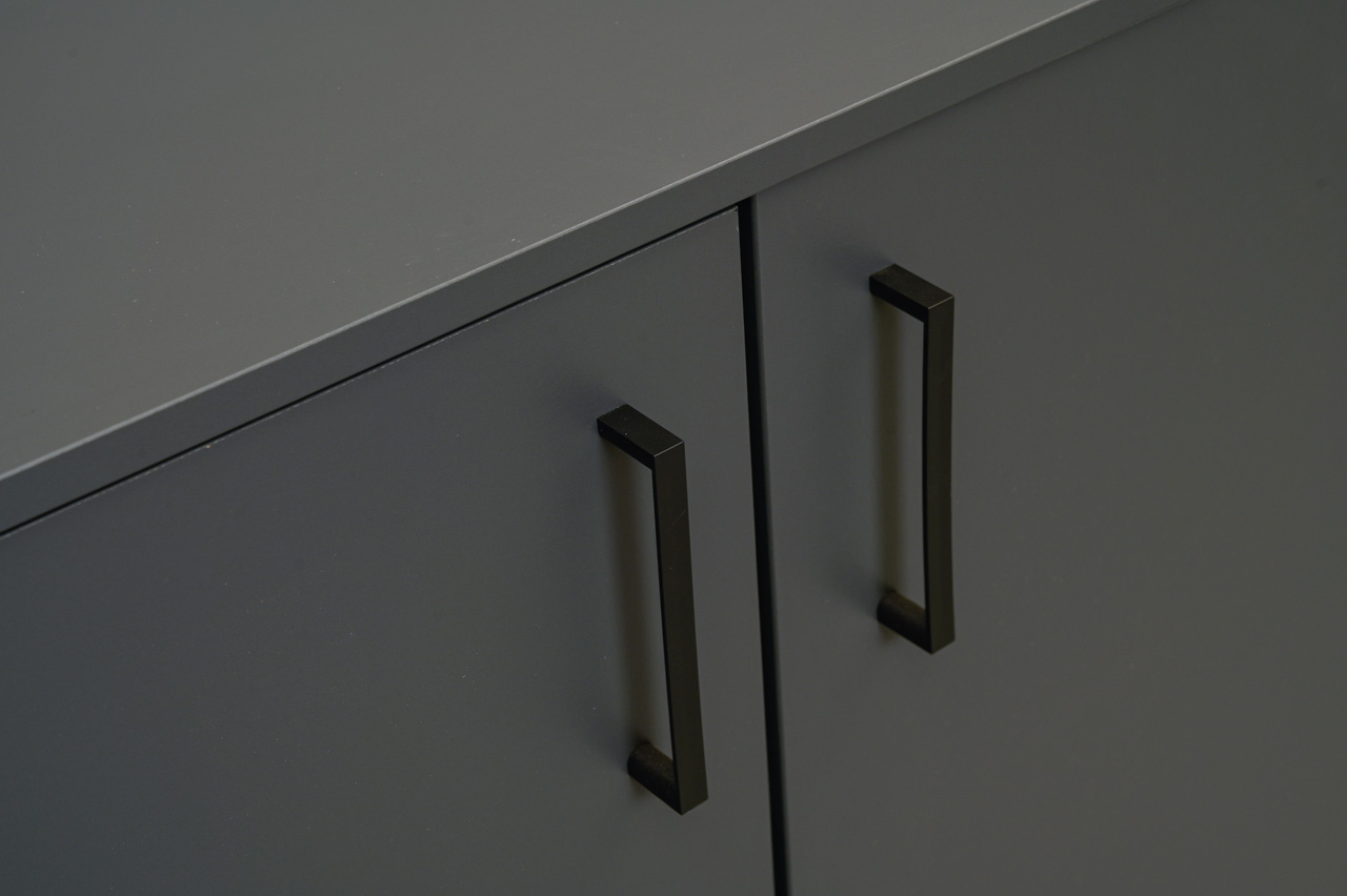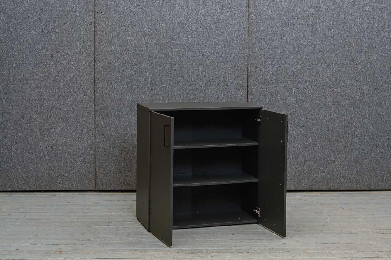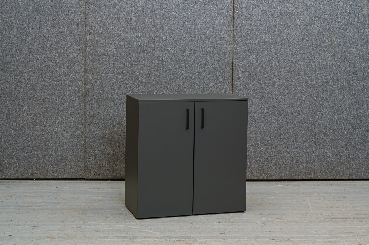 Pelēki laminēts koksaidu plātnes skapītis ar melniem, matētiem plastmasa rokturiem. 2 austumā regulējami plaukti. Nelietots, salikts. Kods 408318.