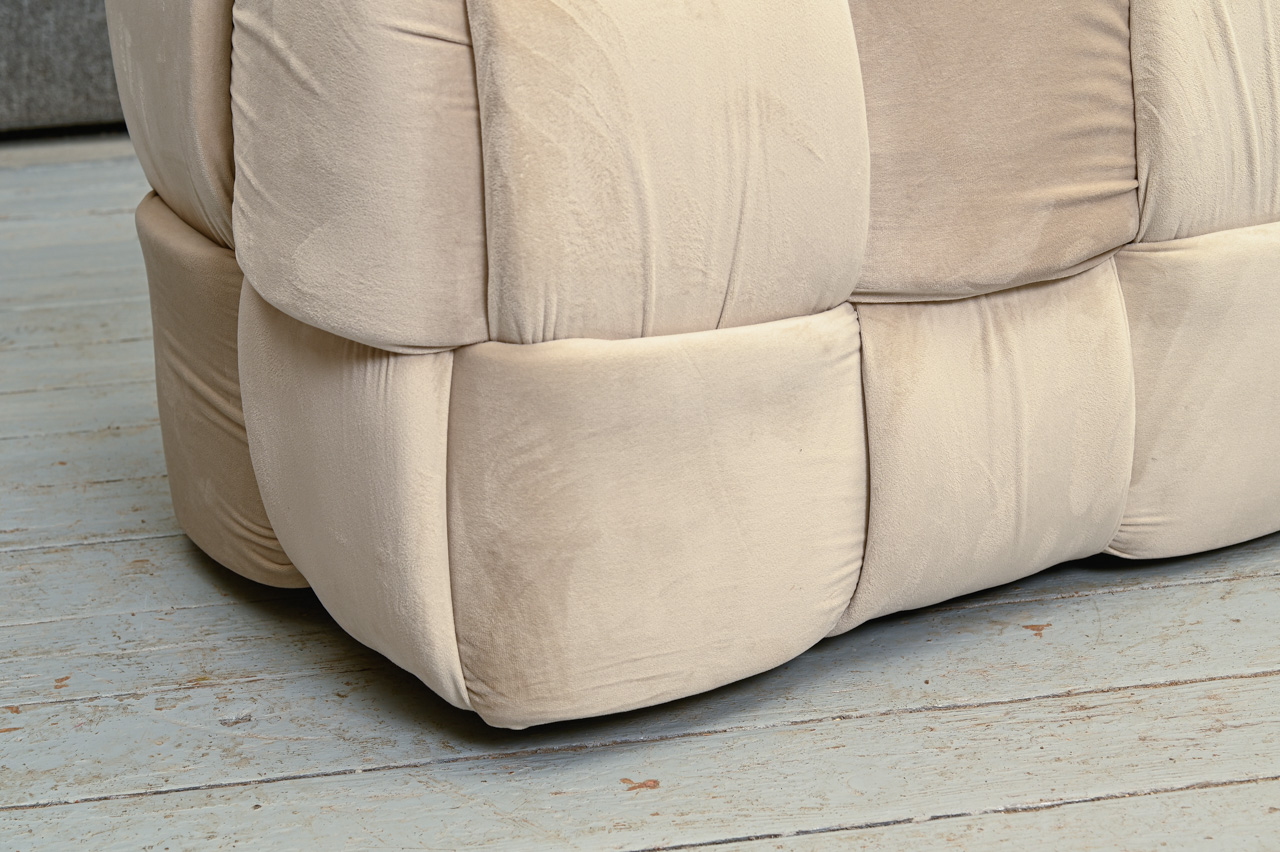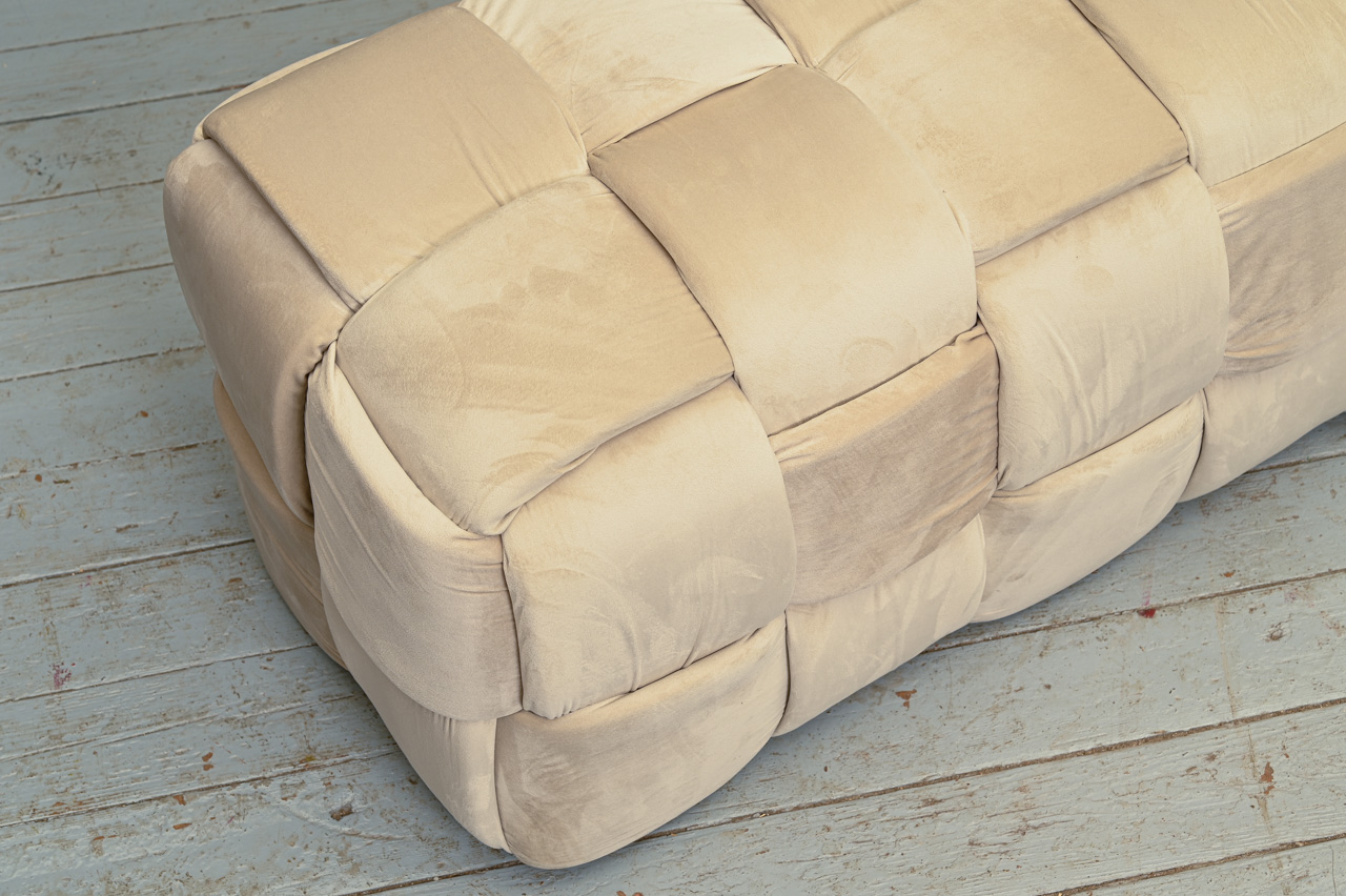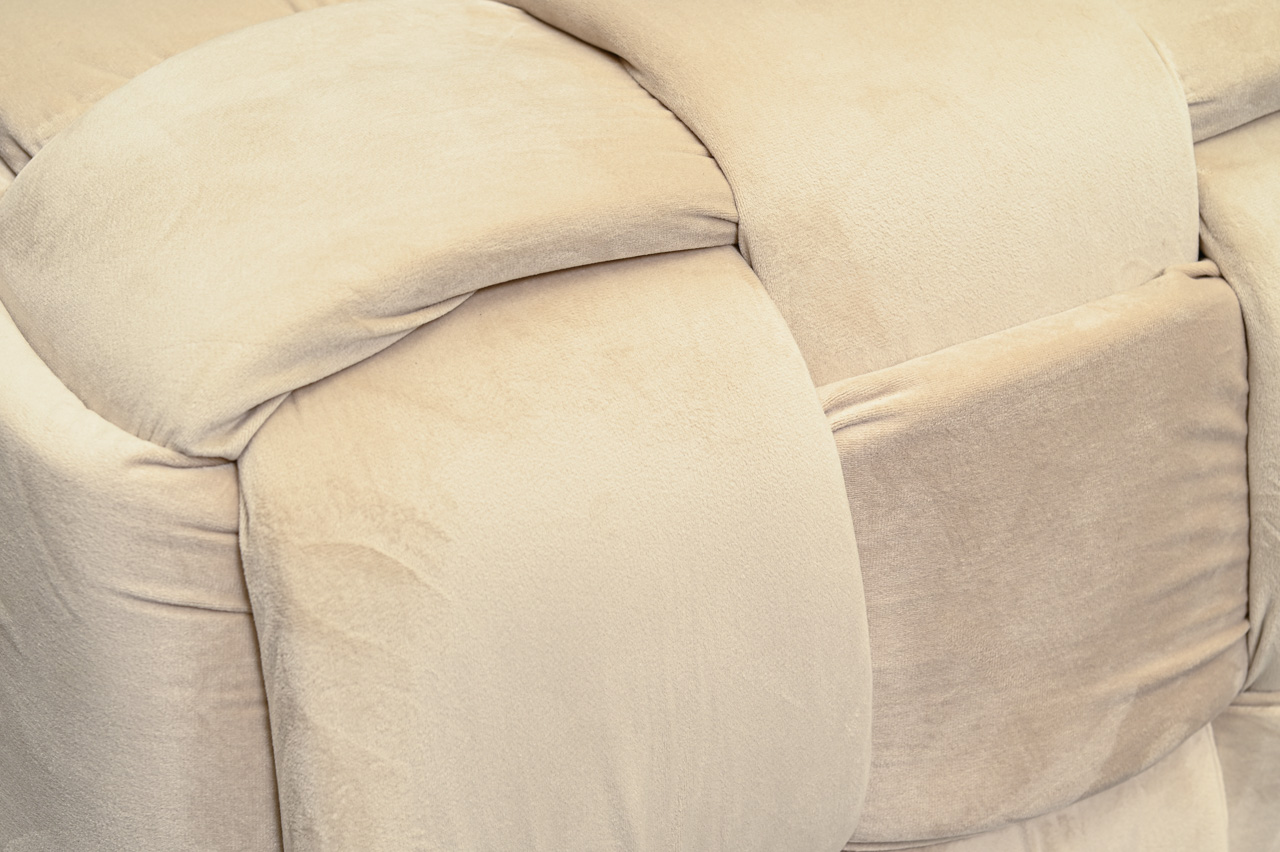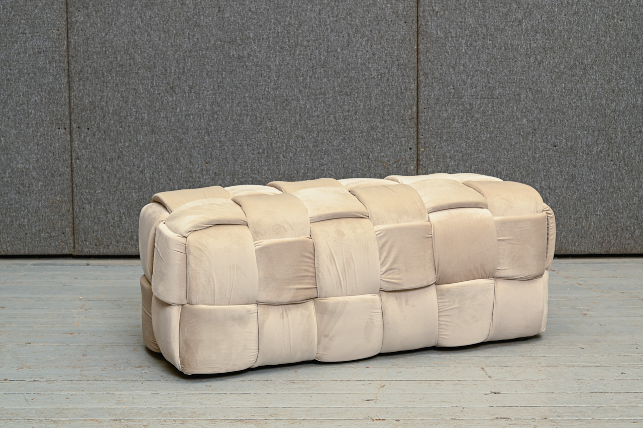 Soliņš - pufs, tapsēts ar bēšu, samtainu mēbeļu audumu. Nelietots, salikts. Kods 808355.
