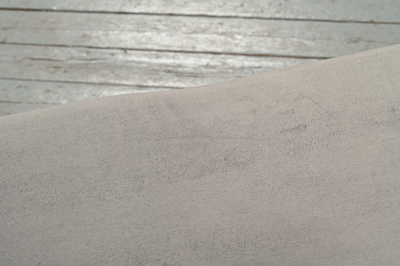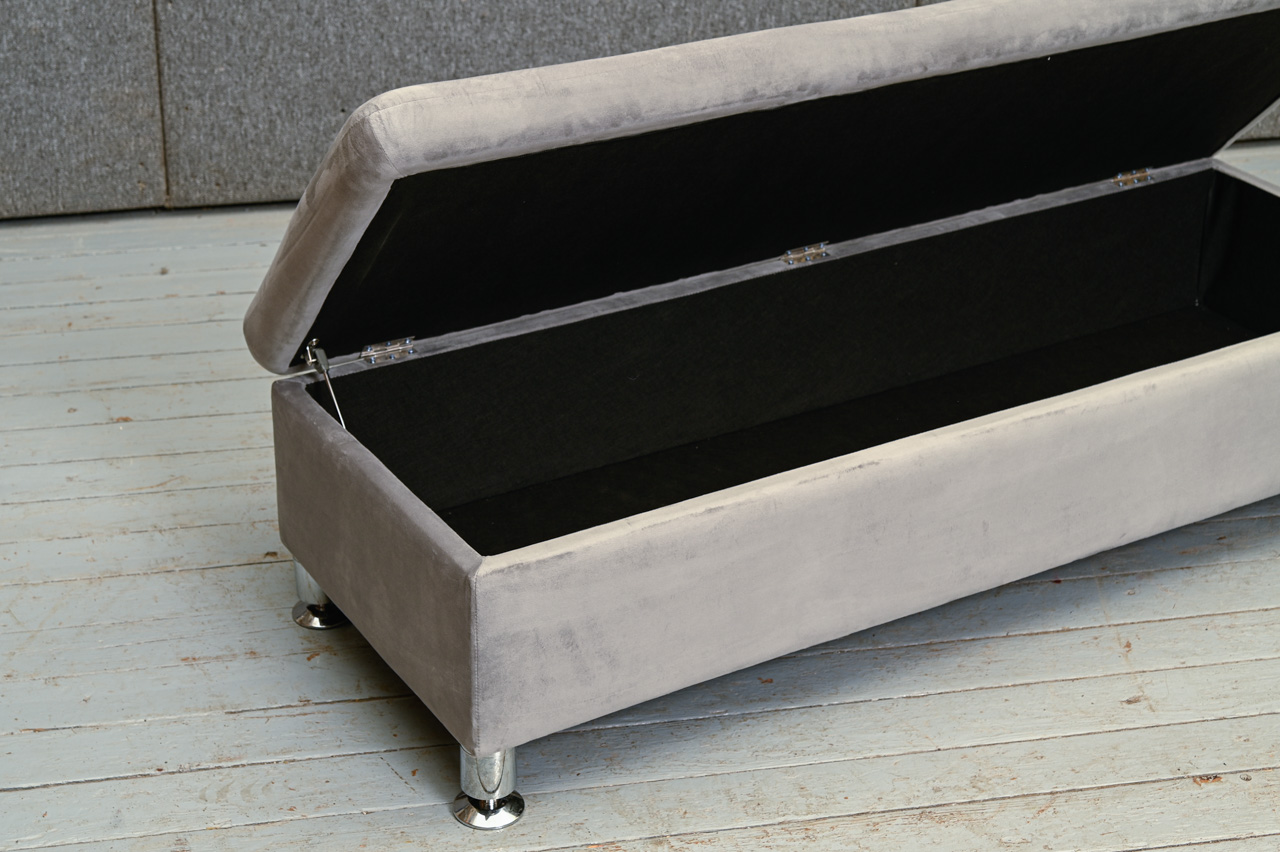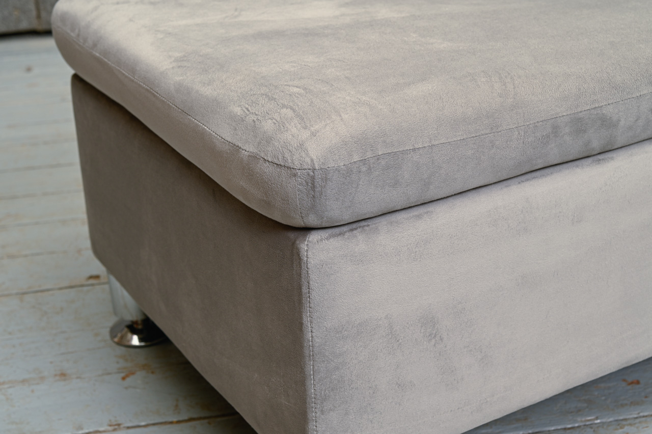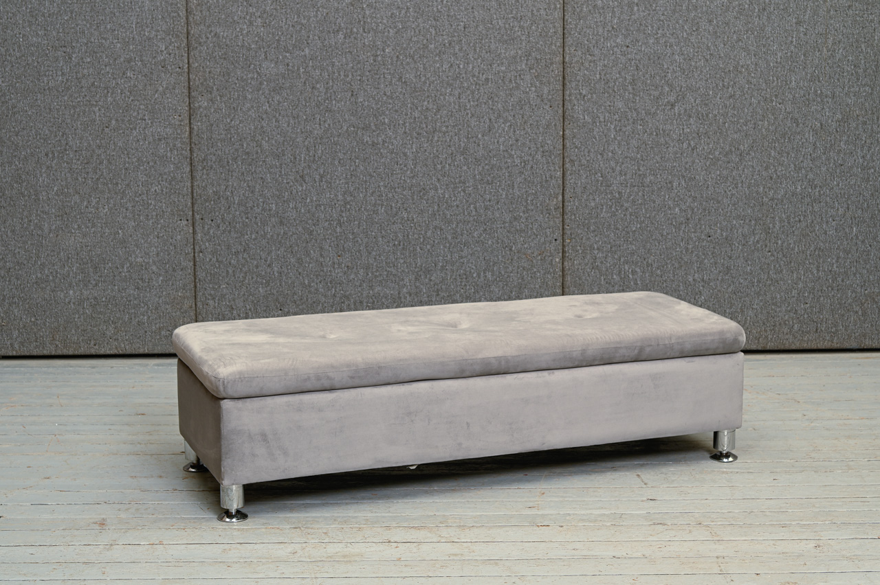 Soliņš uz hromētām metāla kājiņām, tapsēts ar pelēku, samtainu mēbeļu audumu. Zem paceļama sēdvirsmas vāka uzglabāšanas nodalījums. Sēdvirsmas malā putu pildījuma defekts, skatīt attēlā. Nelietots, salikts. Kods 808342.