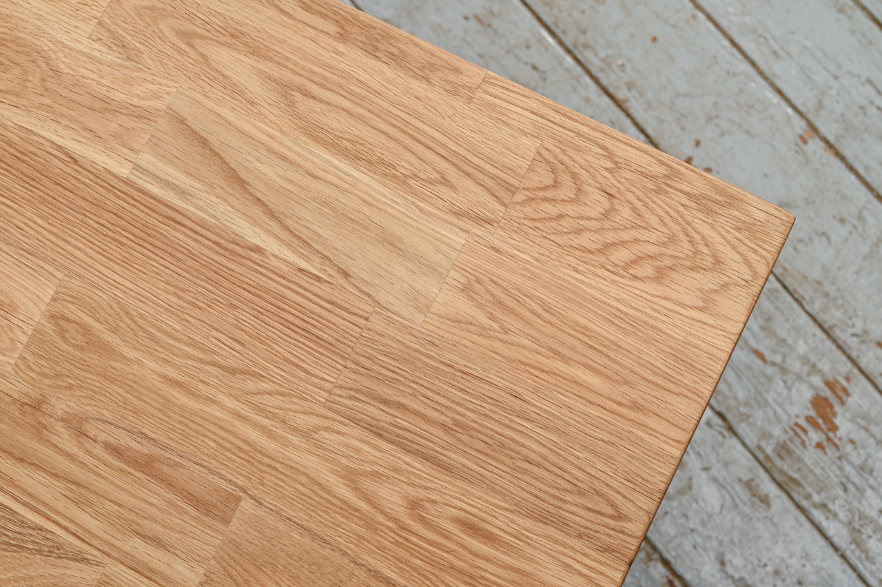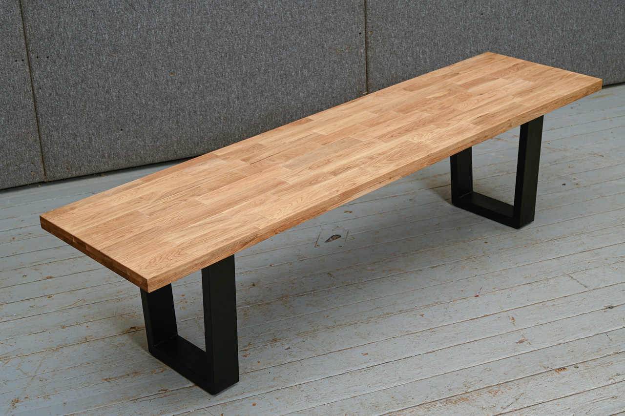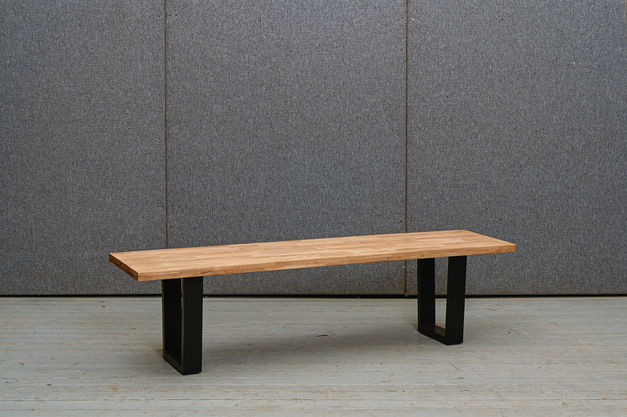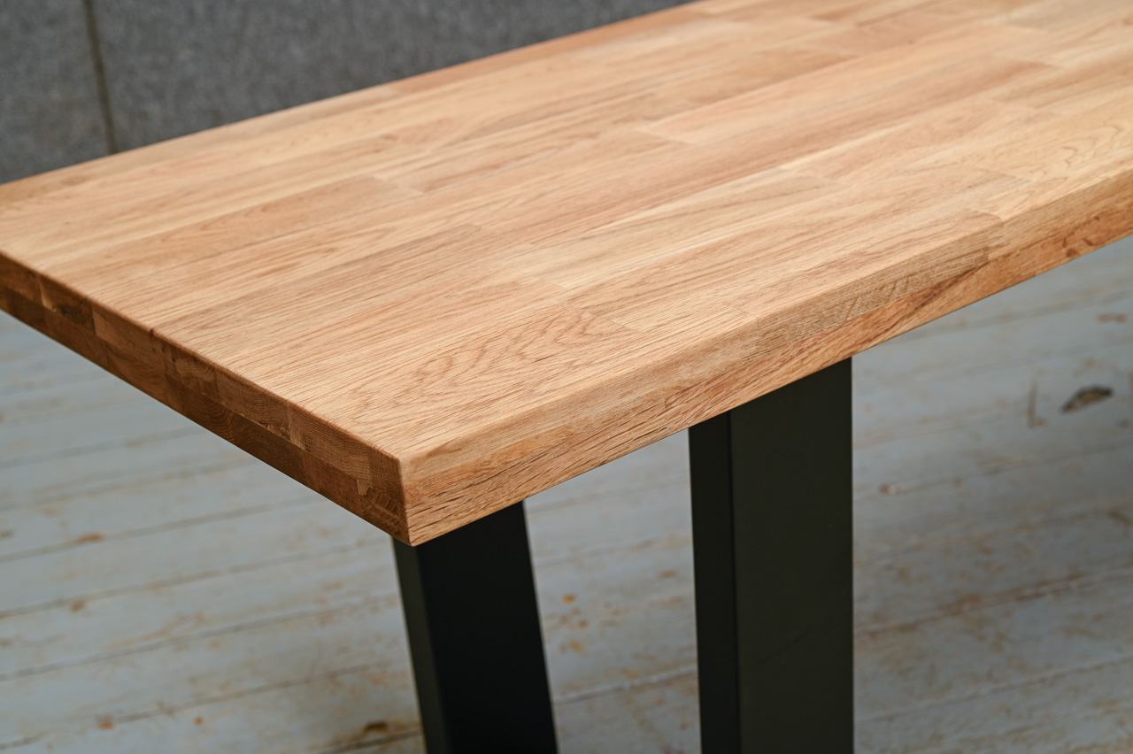 Līmēta ozola masīvkoka sols uz melnām, matētām U veida metāla kājām. Nelietots, salikts. Kods 808363.