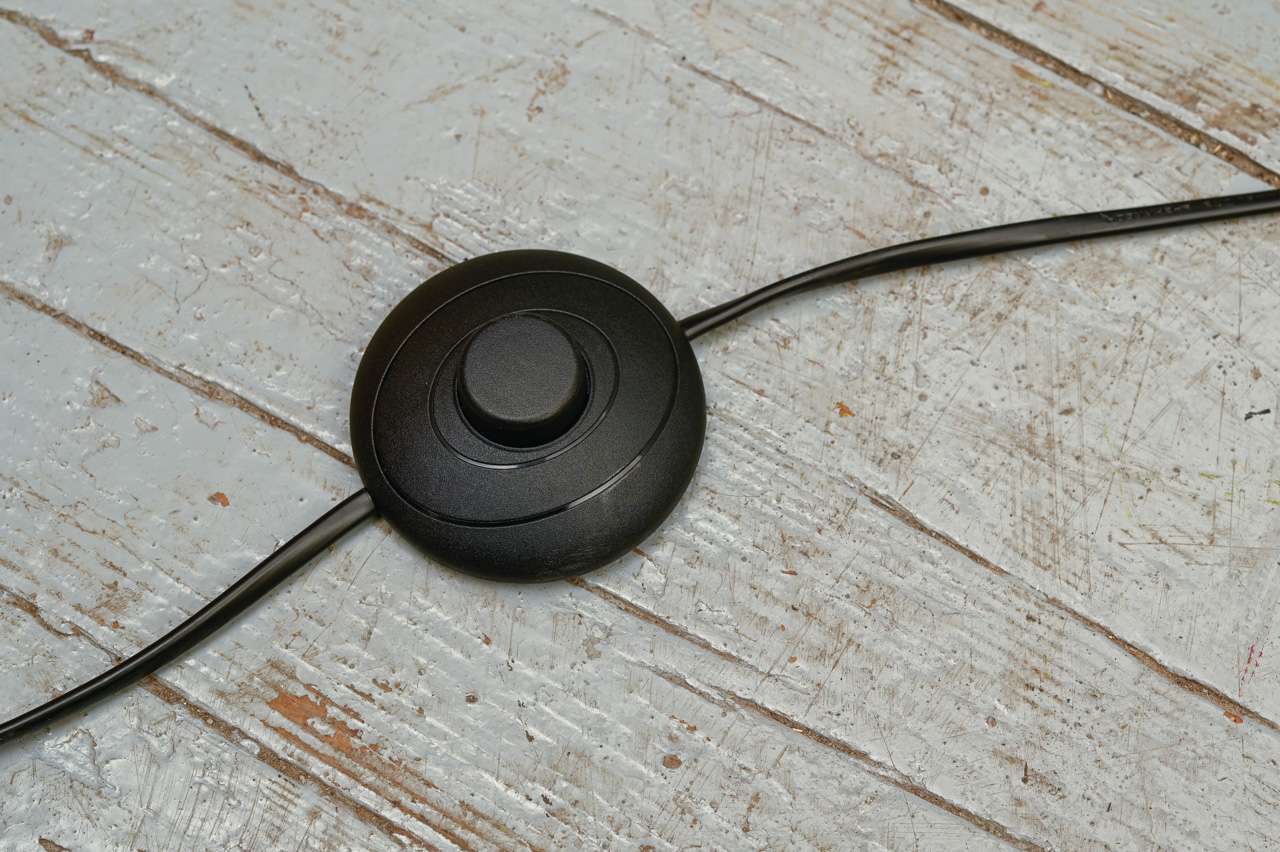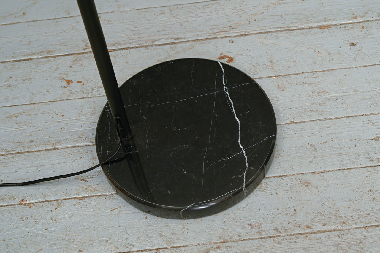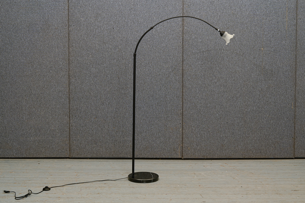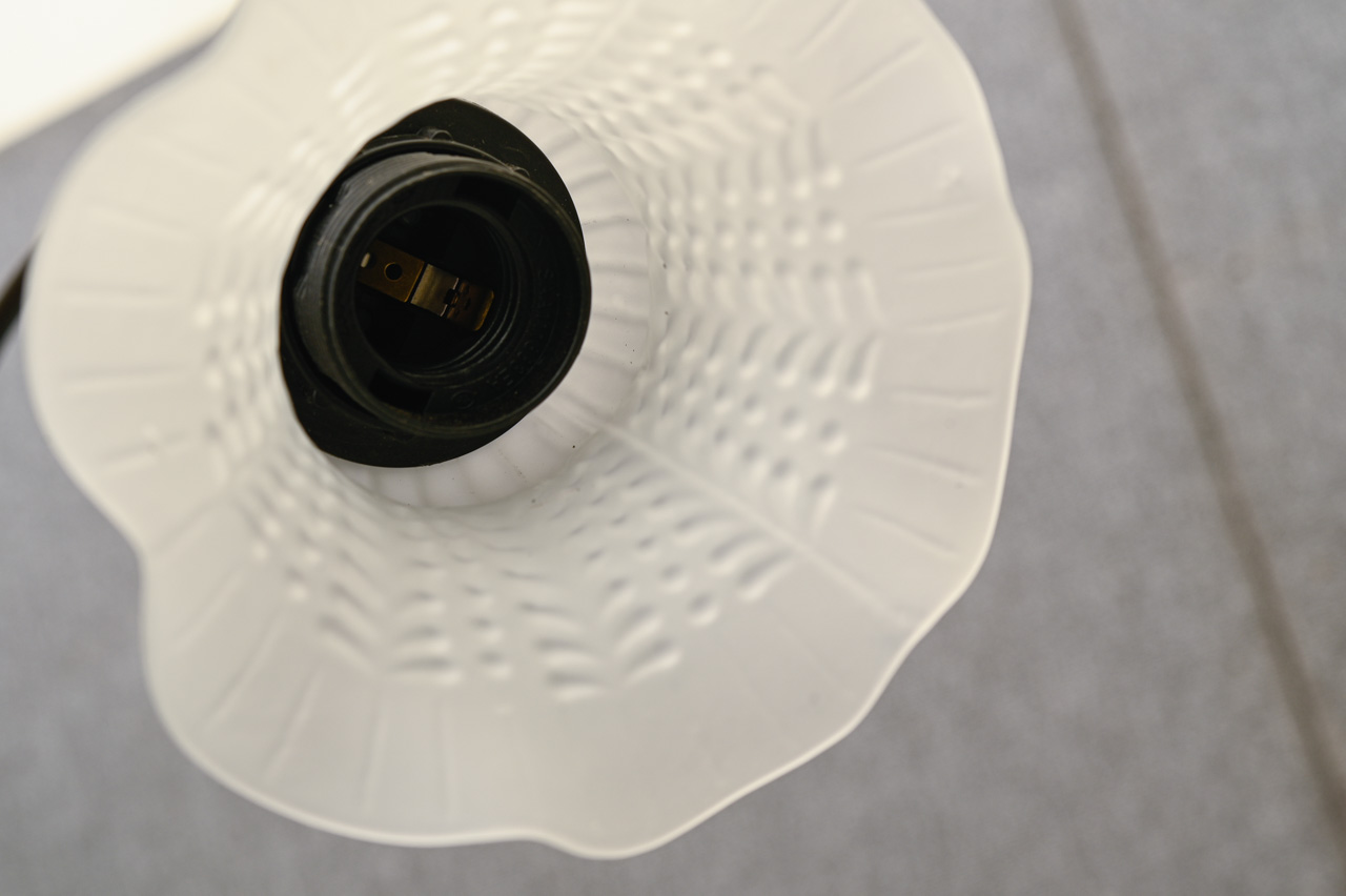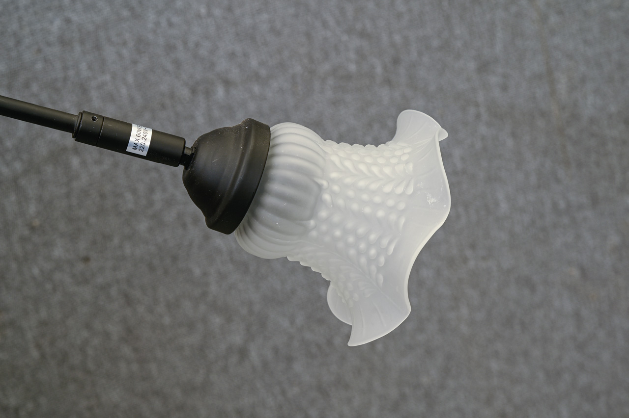 Grīdas lampa uz apaļas akmens imitācijas pamatnes. Lampas kāta augstums ir regulējams 51cm robežās. Lampai trūkst oriģinālais plafons, tā vietā ir uzstādīts matēta stikla ziedu formas plafons. Kods 708394.