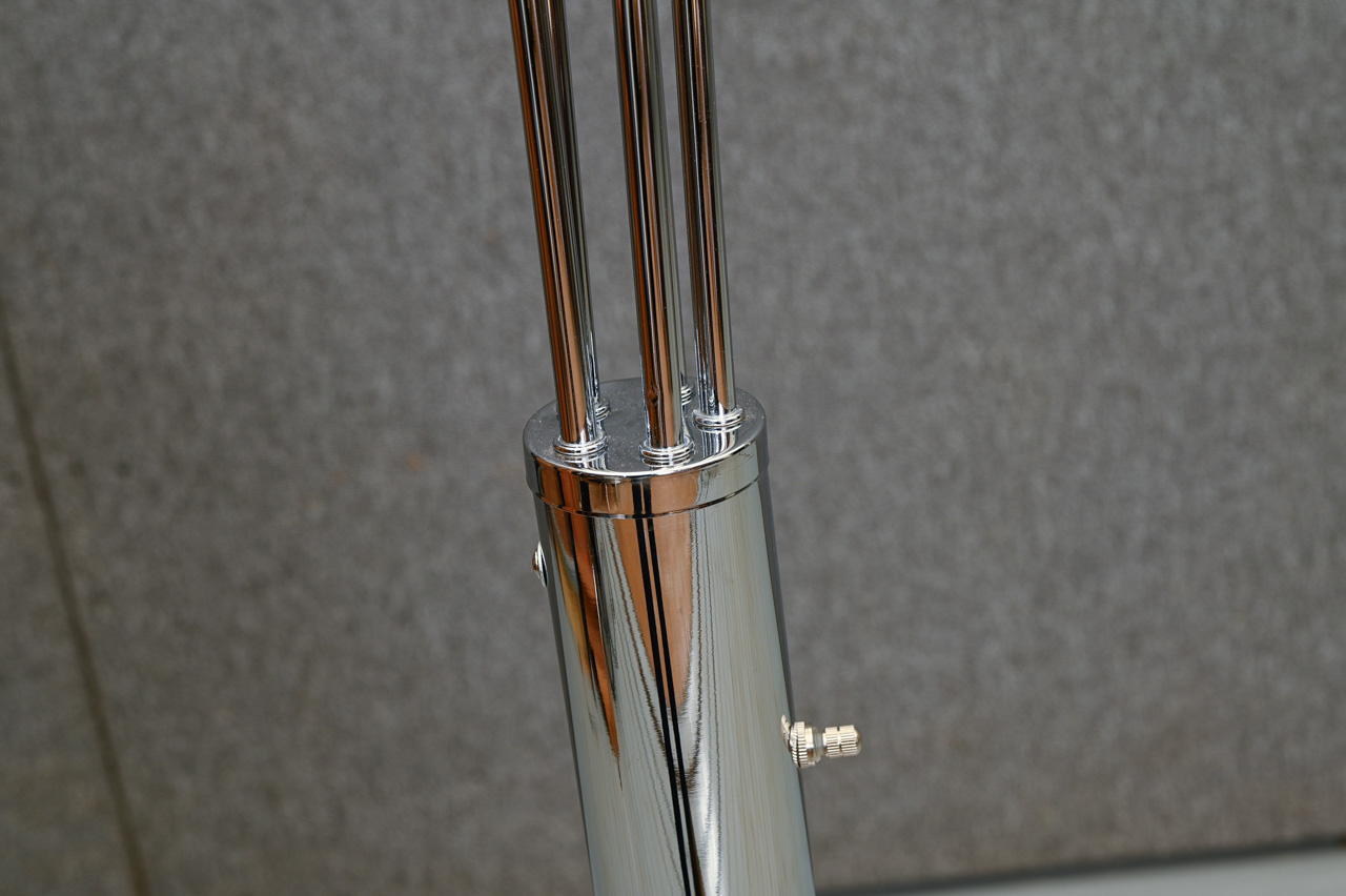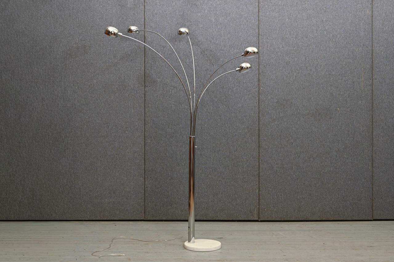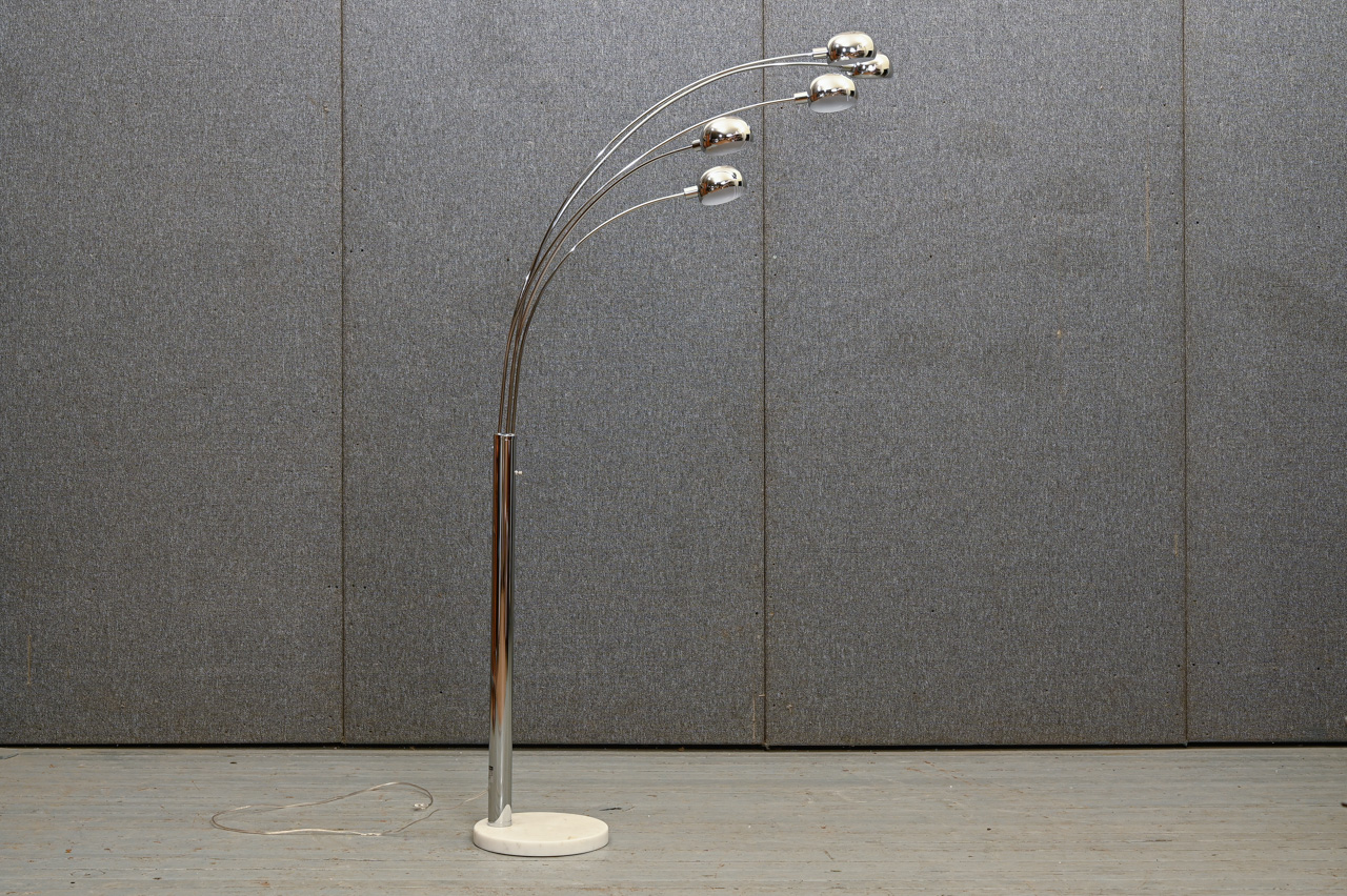 Grīdas lampa uz hromētas metāla kājas uz apaļas marmora imitācijas pamatnes. 5 dažāda garuma kāti ar kupolveida metāla plafoniem. Nelietota, salikta. Kods 708409.