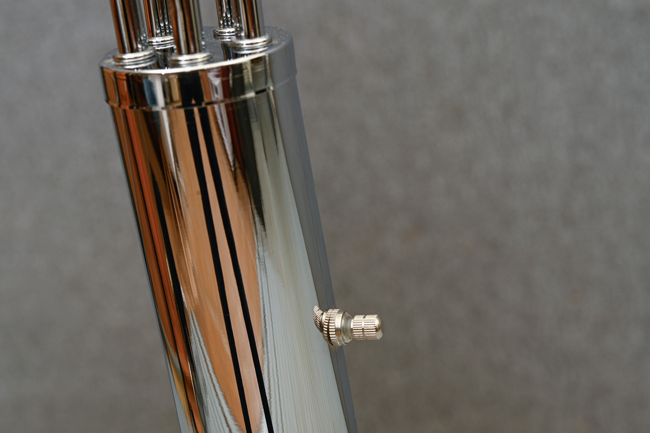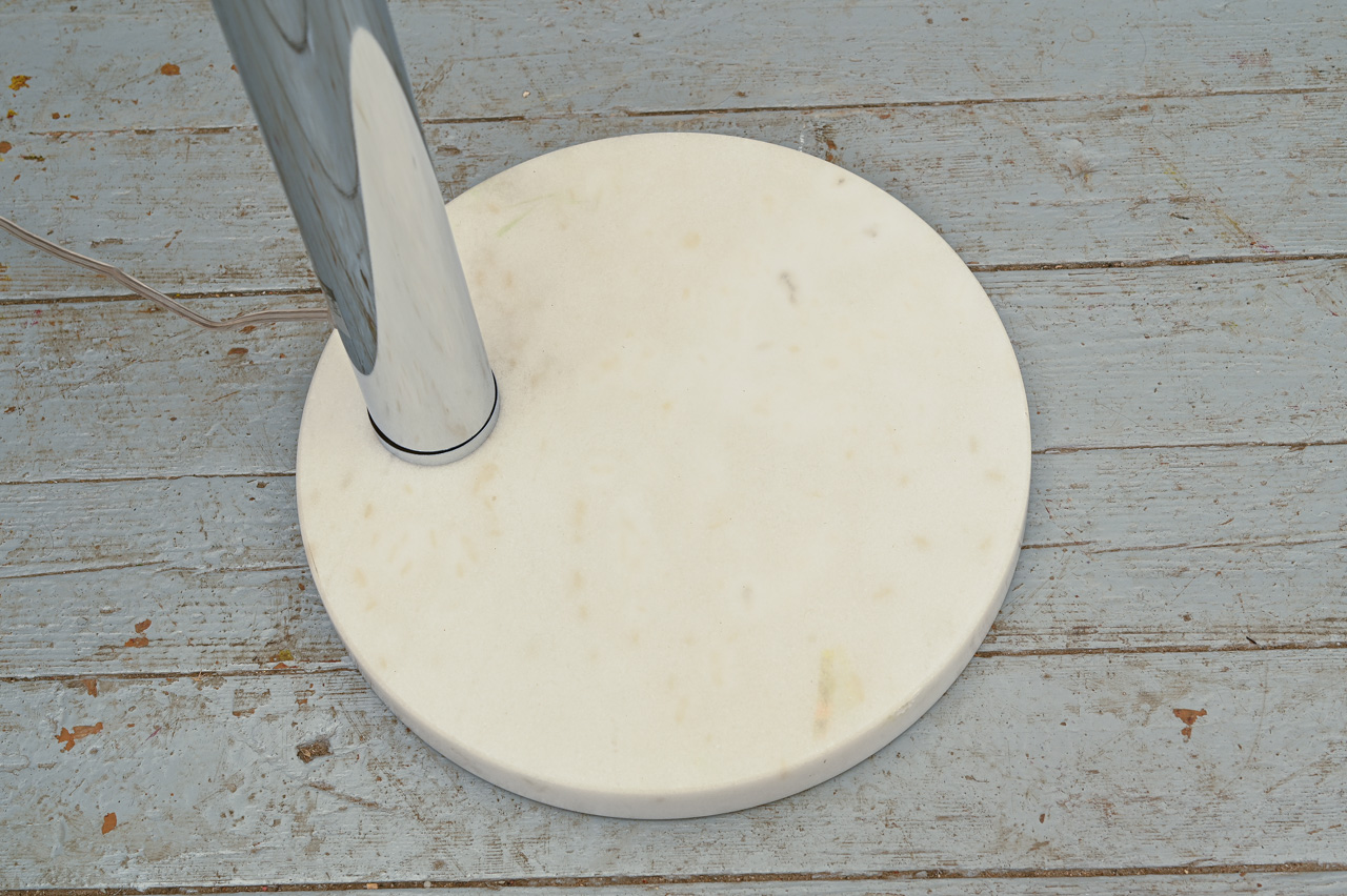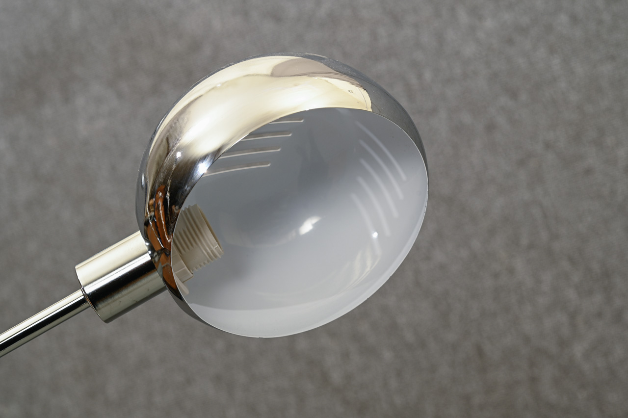 Grīdas lampa uz hromētas metāla kājas uz apaļas marmora imitācijas pamatnes. 5 dažāda garuma kāti ar kupolveida metāla plafoniem. Nelietota, salikta. Kods 708409.