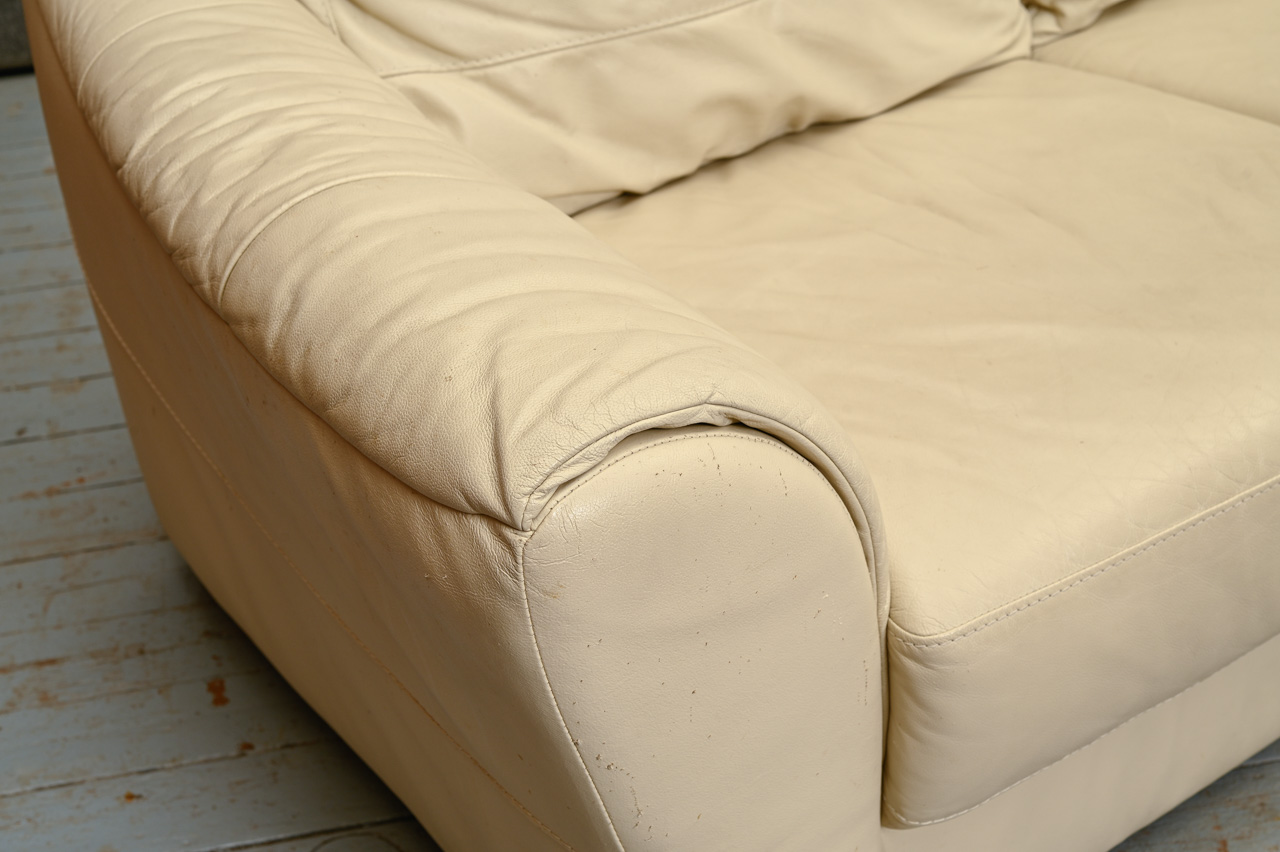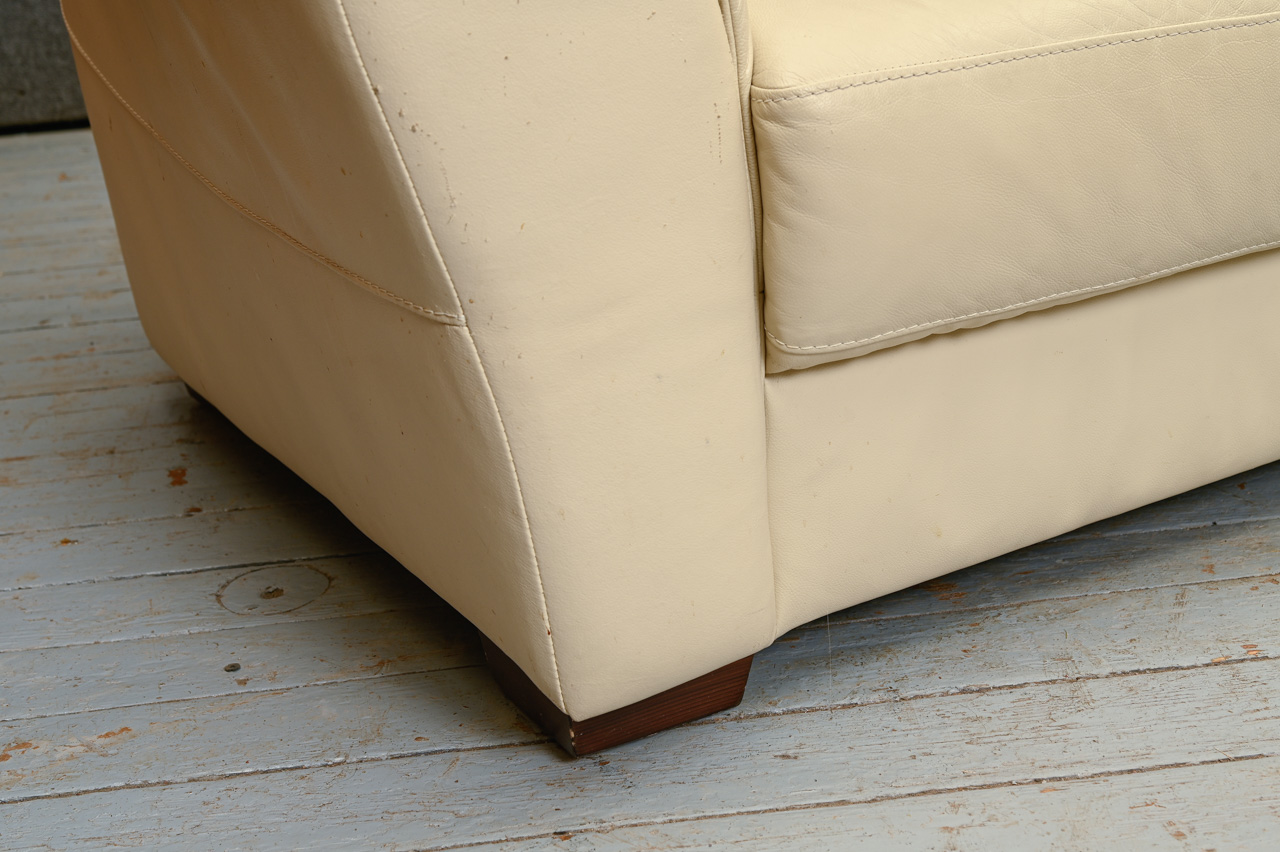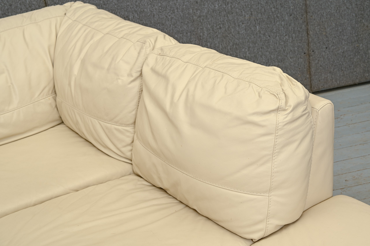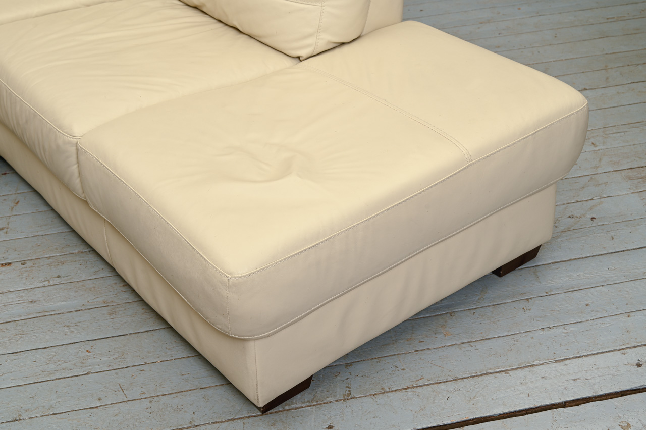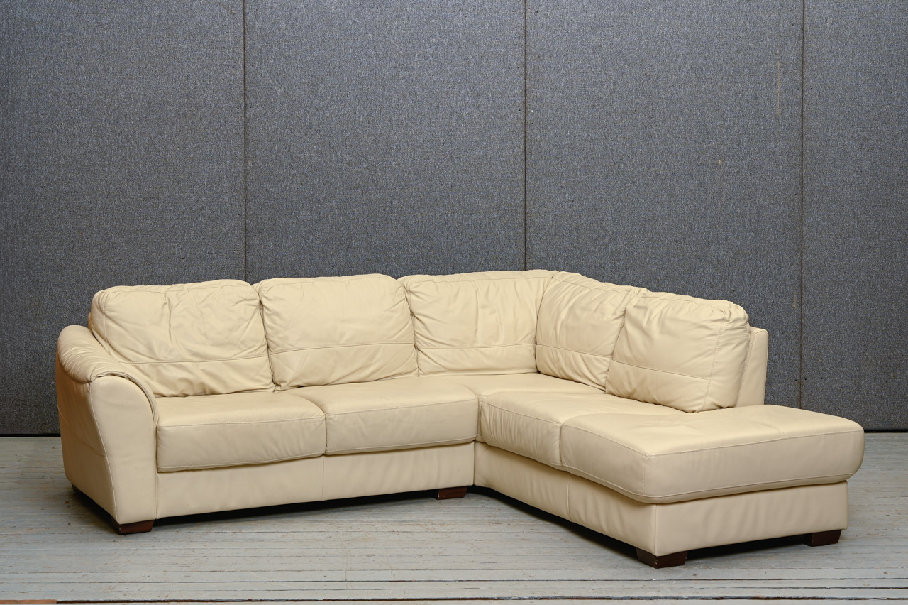 Stūra dīvāns, tapsēts ar bēšu dabīgo ādu. Fasāde zem sēdvirsmas, sāni un aizmugure ar ādas imitācijas tapsējumu. Kods 660050.