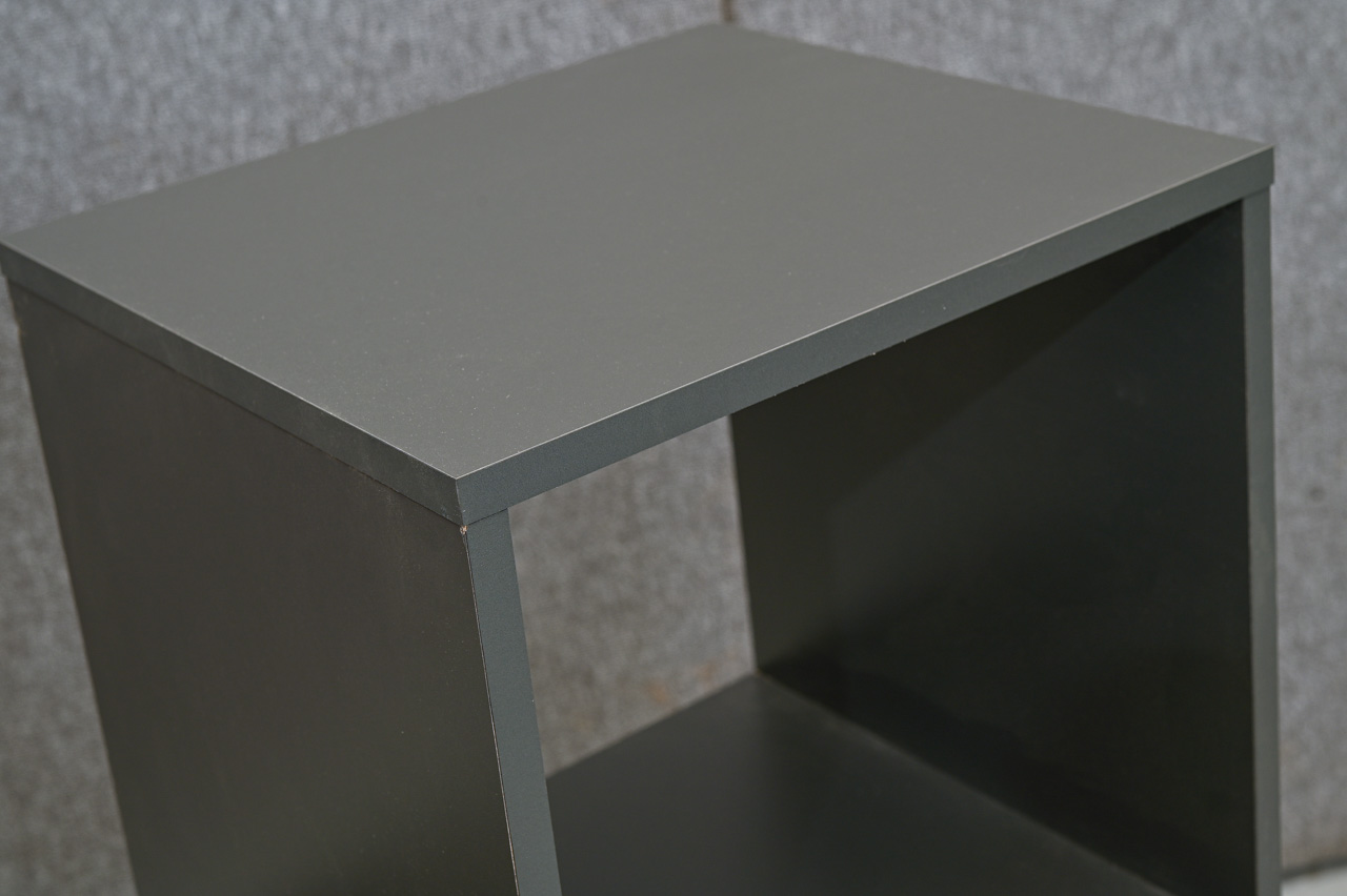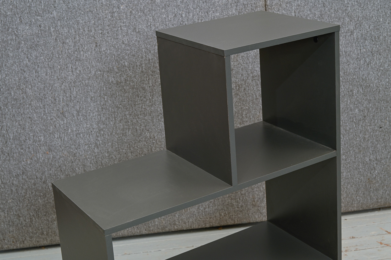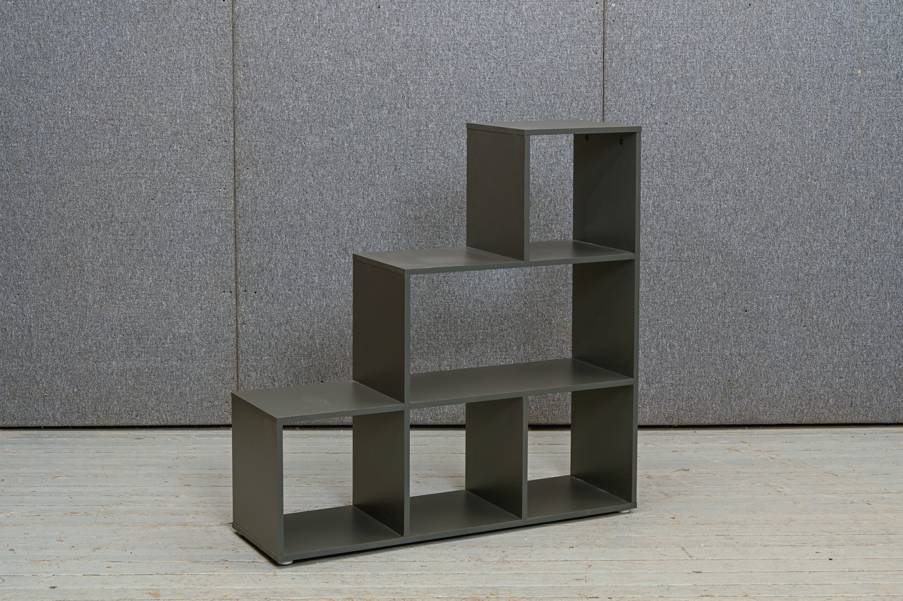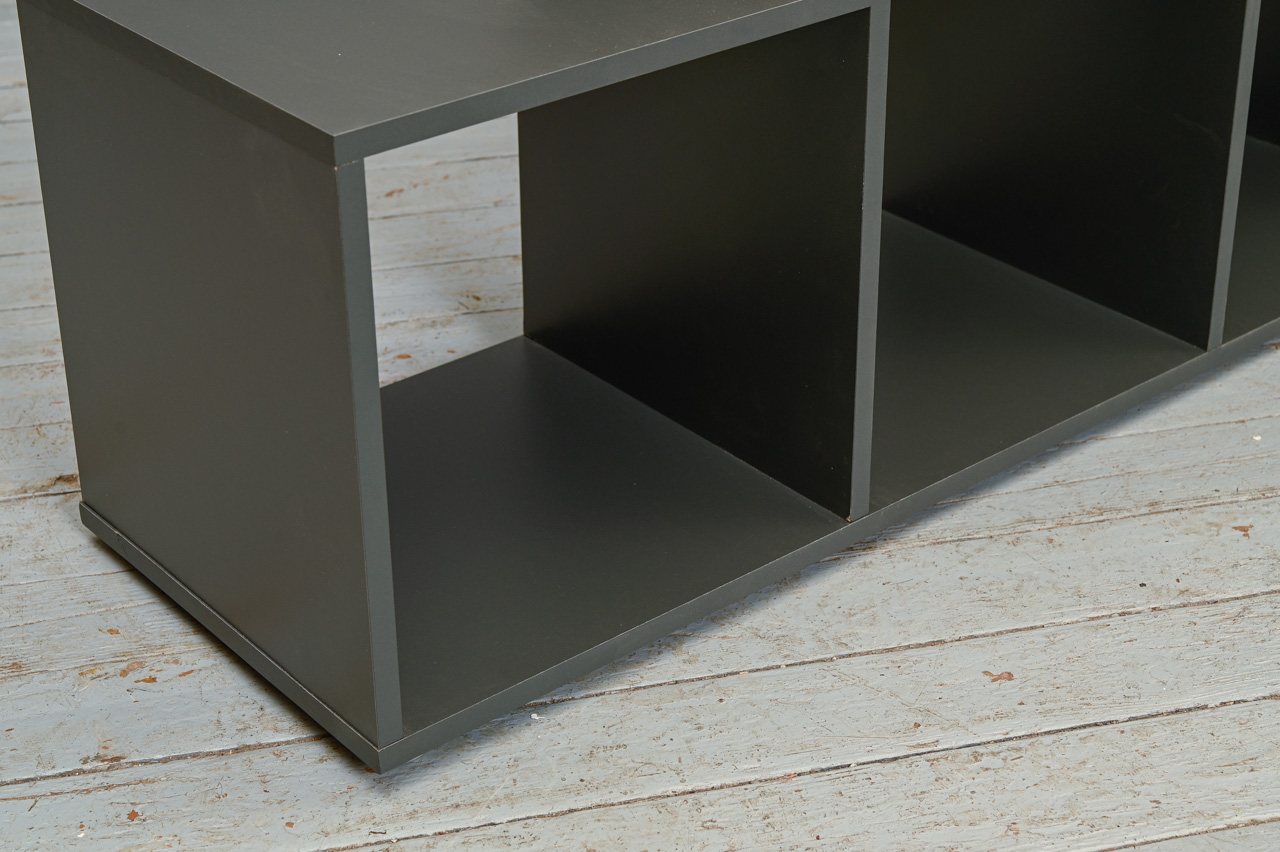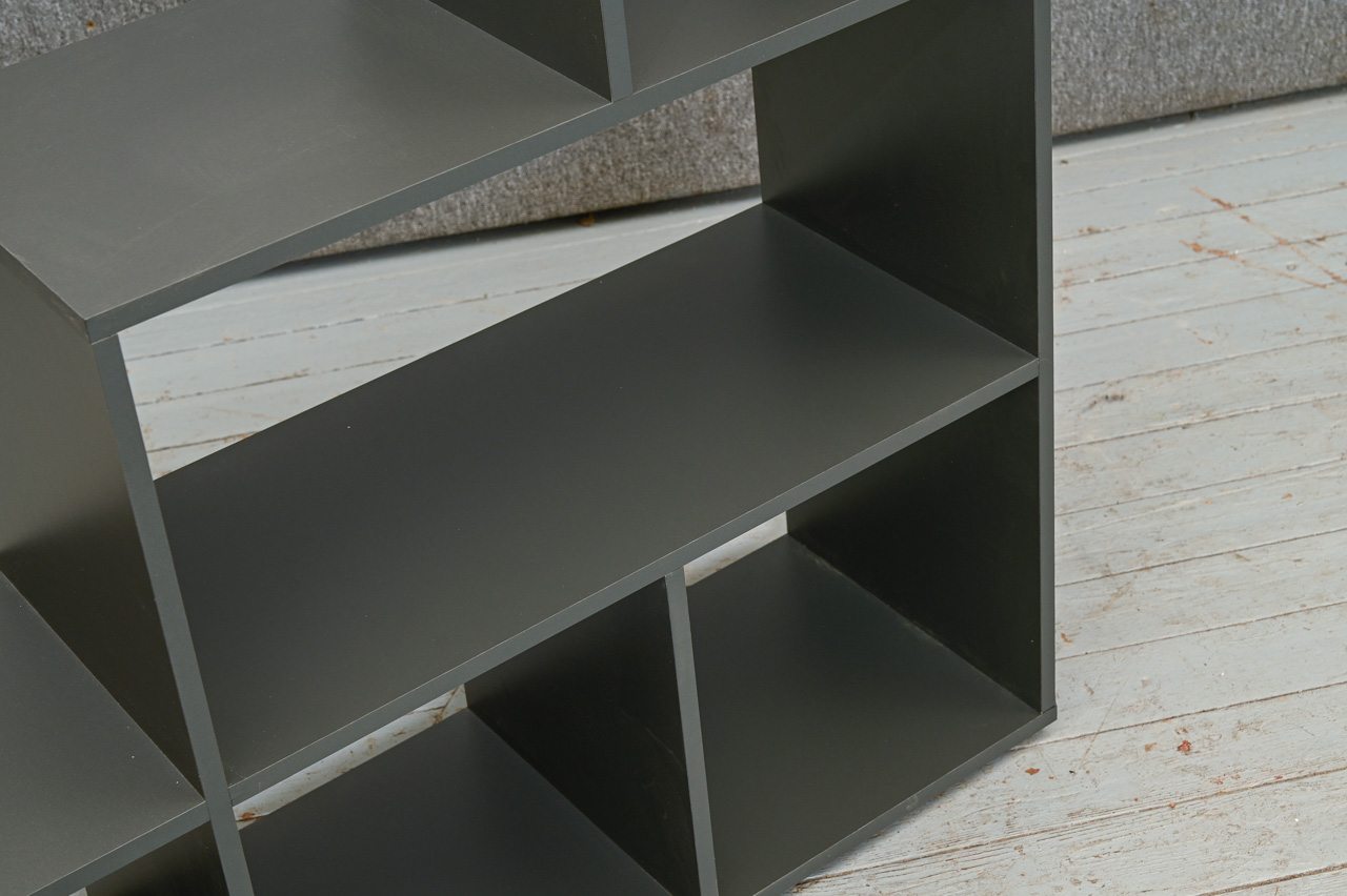 Pelēki laminēts kokskaidu plātnes šūnu plaukts. Katra plaukta izmērs 35x35cm. Lielākā plaukta izmērs 35x71cm. Nelietots, salikts ar virsmas bojājumiem. Kods 408345.
