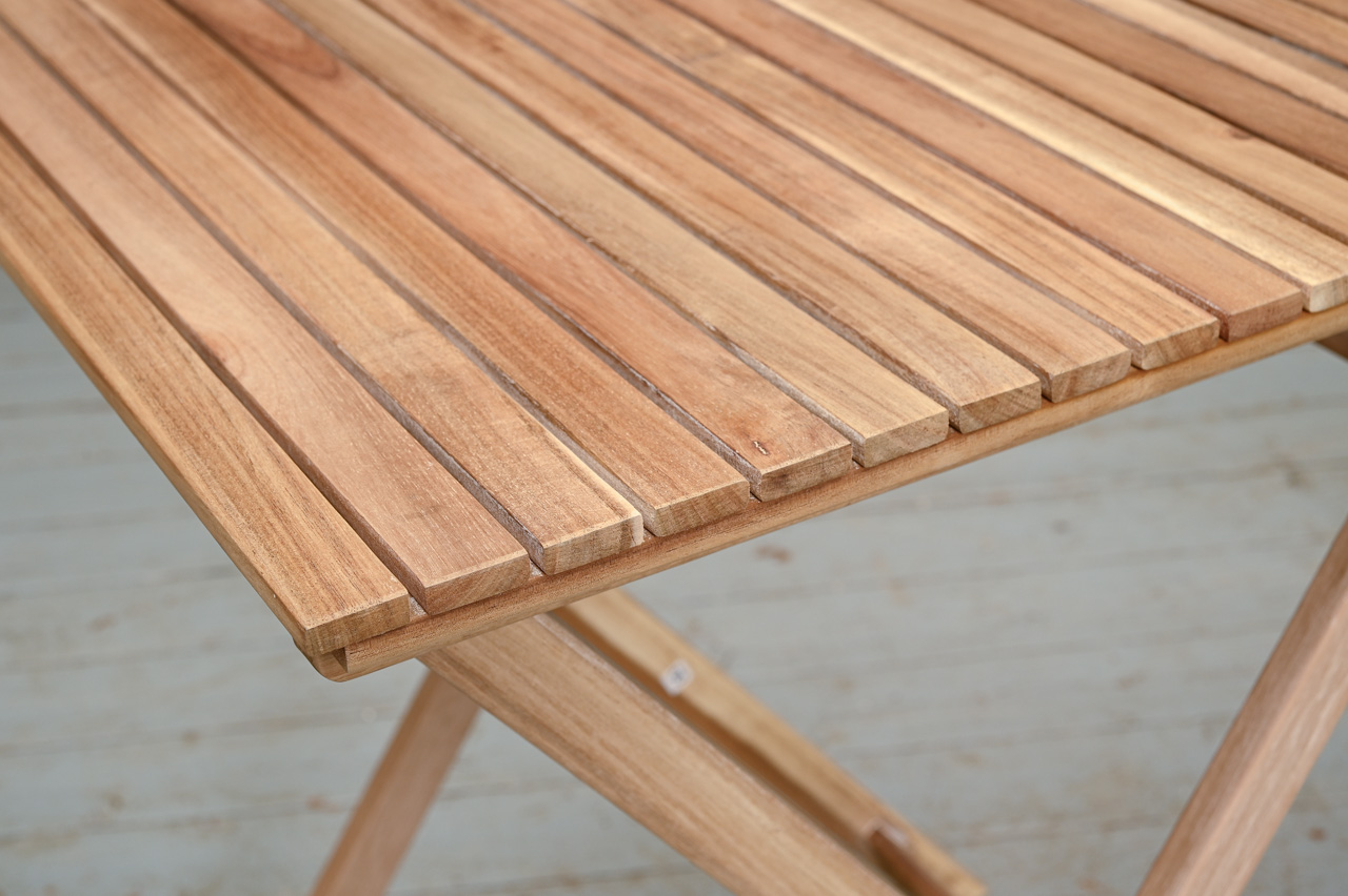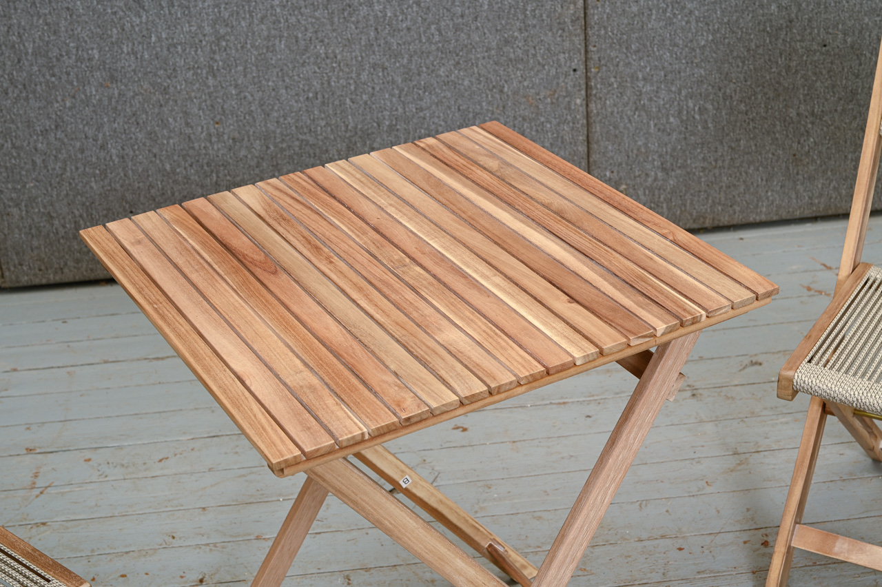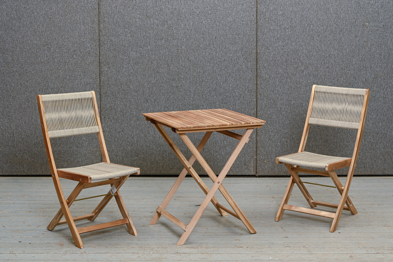 Akācijas koka saliekama galda un 2 krēslu komplekts. Krēslu sēdvirsma un atzveltne nostiepta ar tumši pelēkiem divkrāsu striķi. Nelietots, salikts. Komplekta kods 808360.