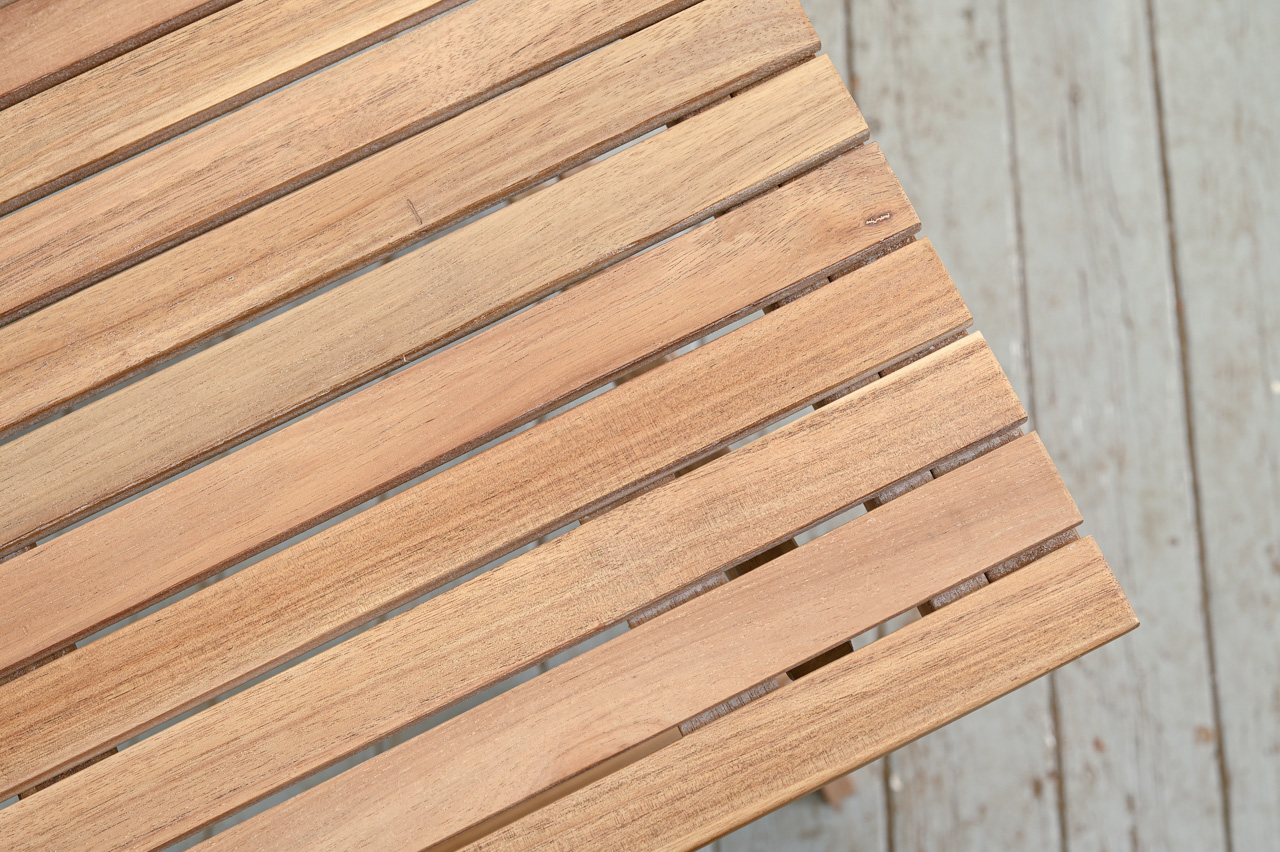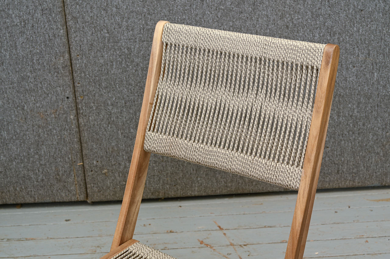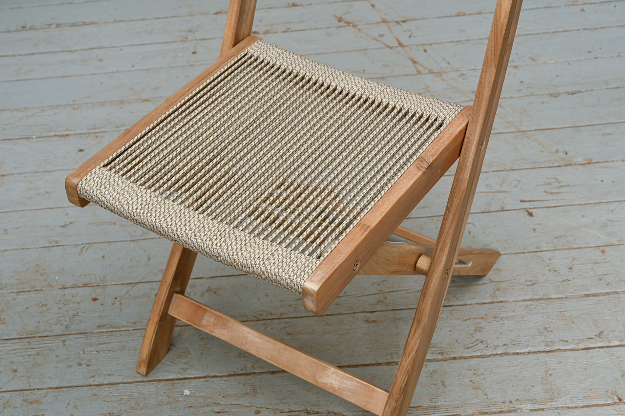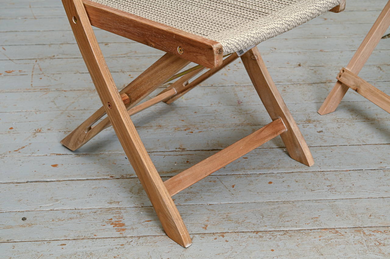 Akācijas koka saliekama galda un 2 krēslu komplekts. Krēslu sēdvirsma un atzveltne nostiepta ar tumši pelēkiem divkrāsu striķi. Nelietots, salikts. Komplekta kods 808360.