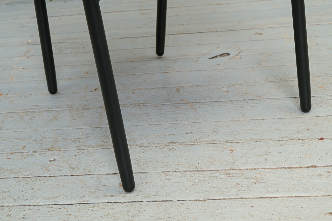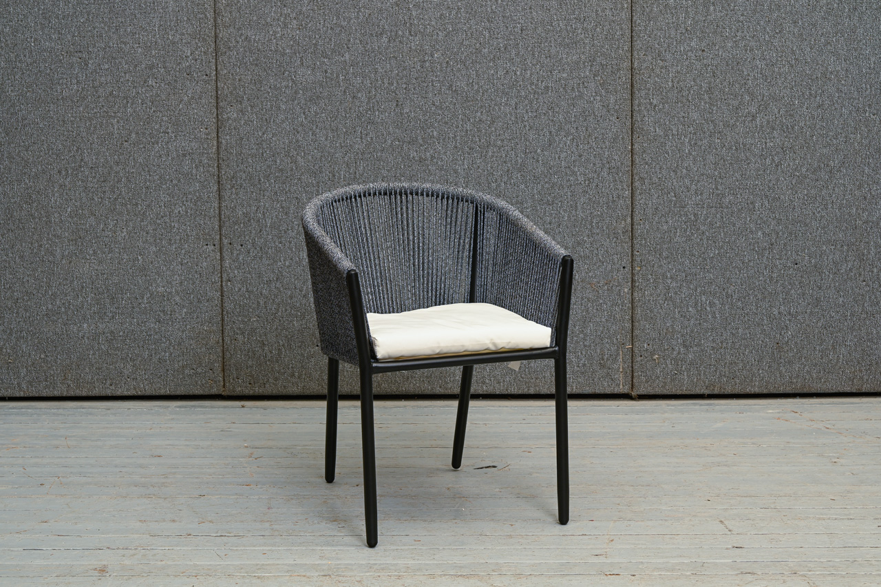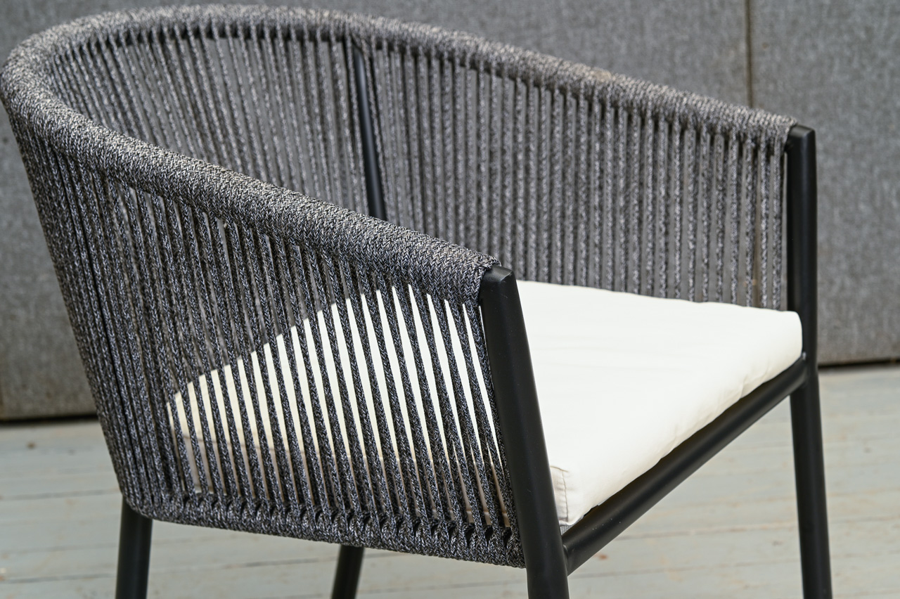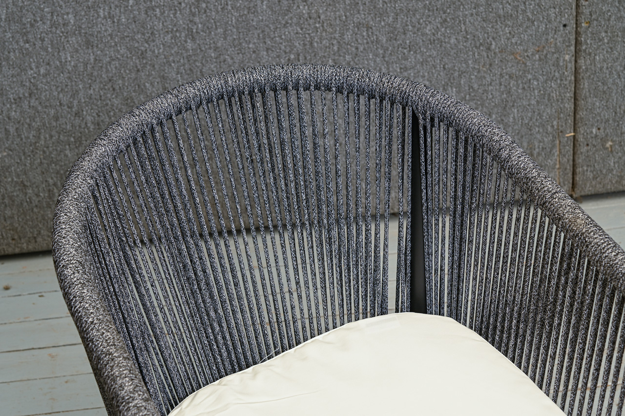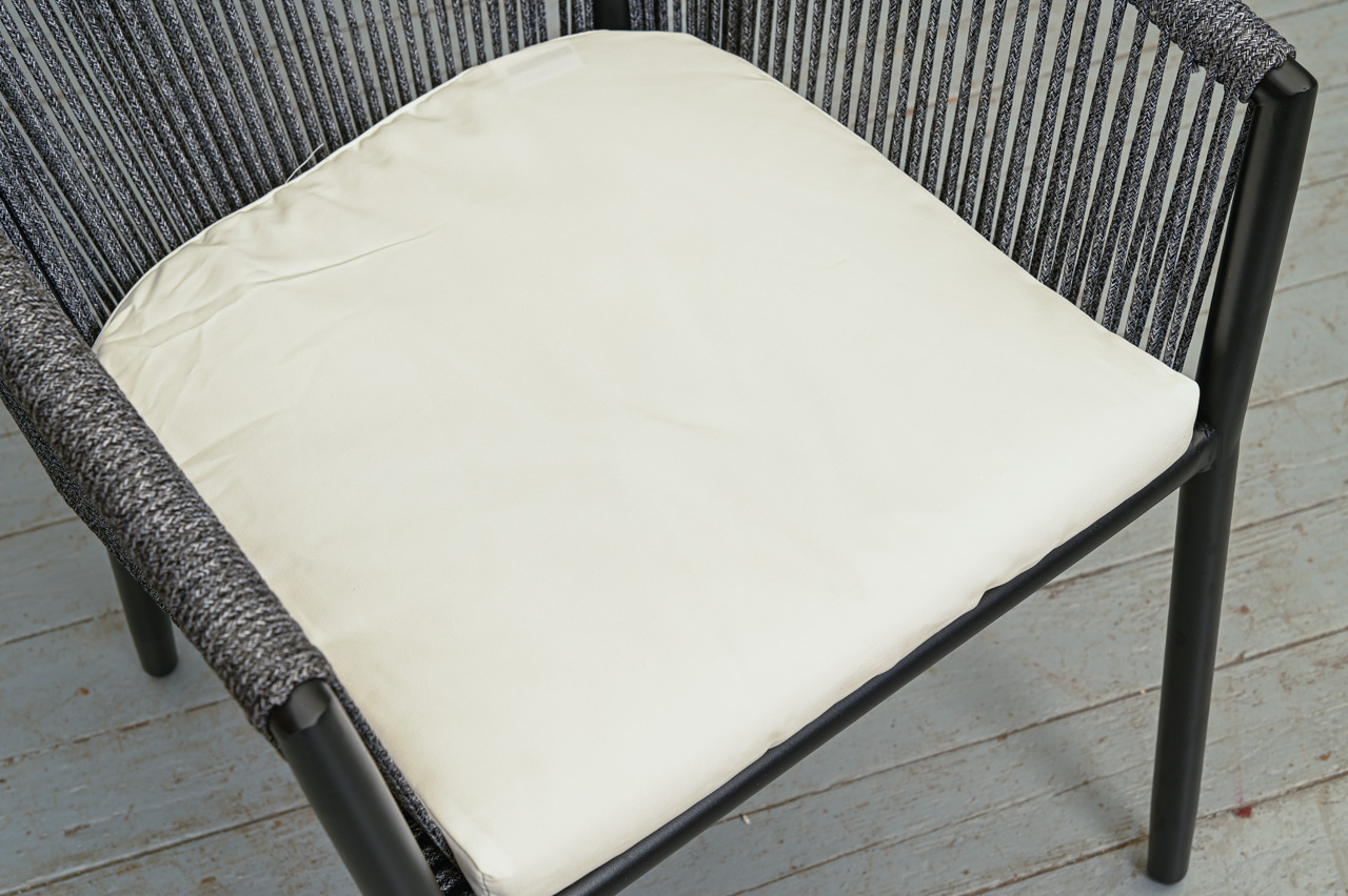 Alumīnija krēsls ar dekoratīvu tumši pelēkas krāsas auklas pinumu un balta sēdvirsmas spilvena paliktni. Nelietots, salikts. Kods 108319.