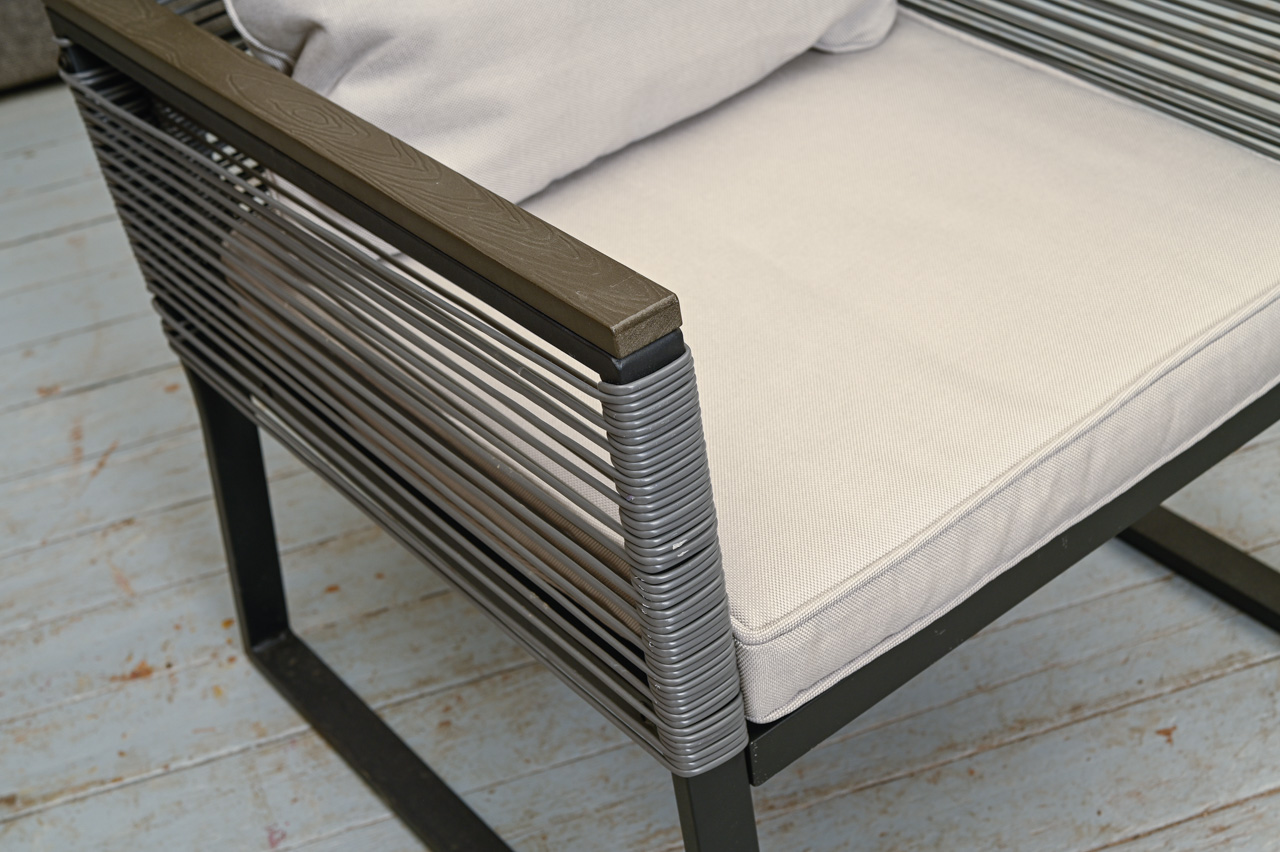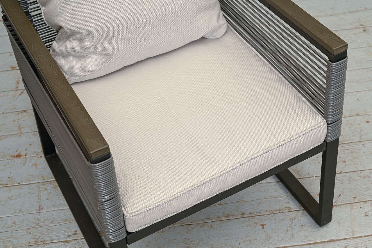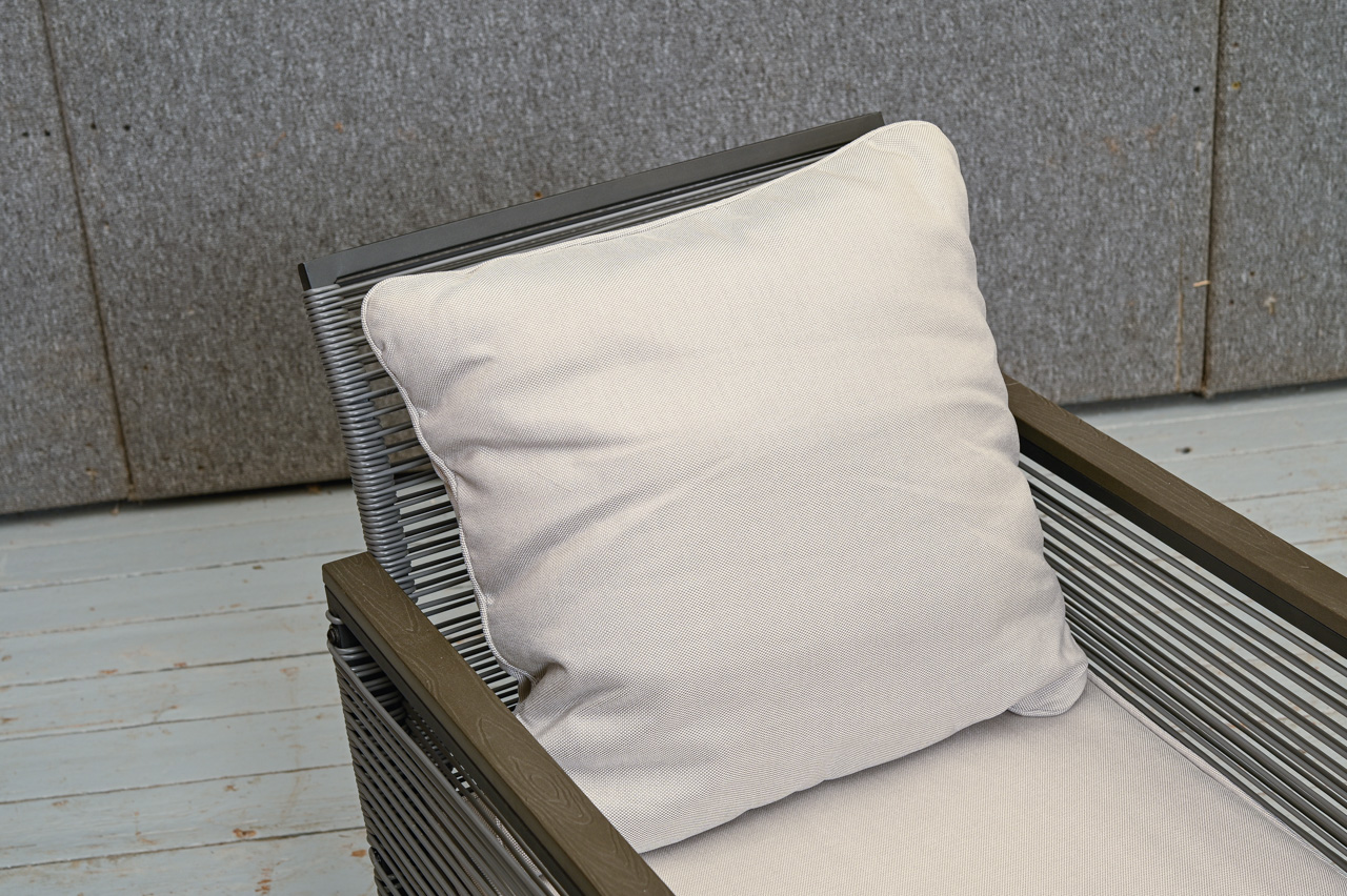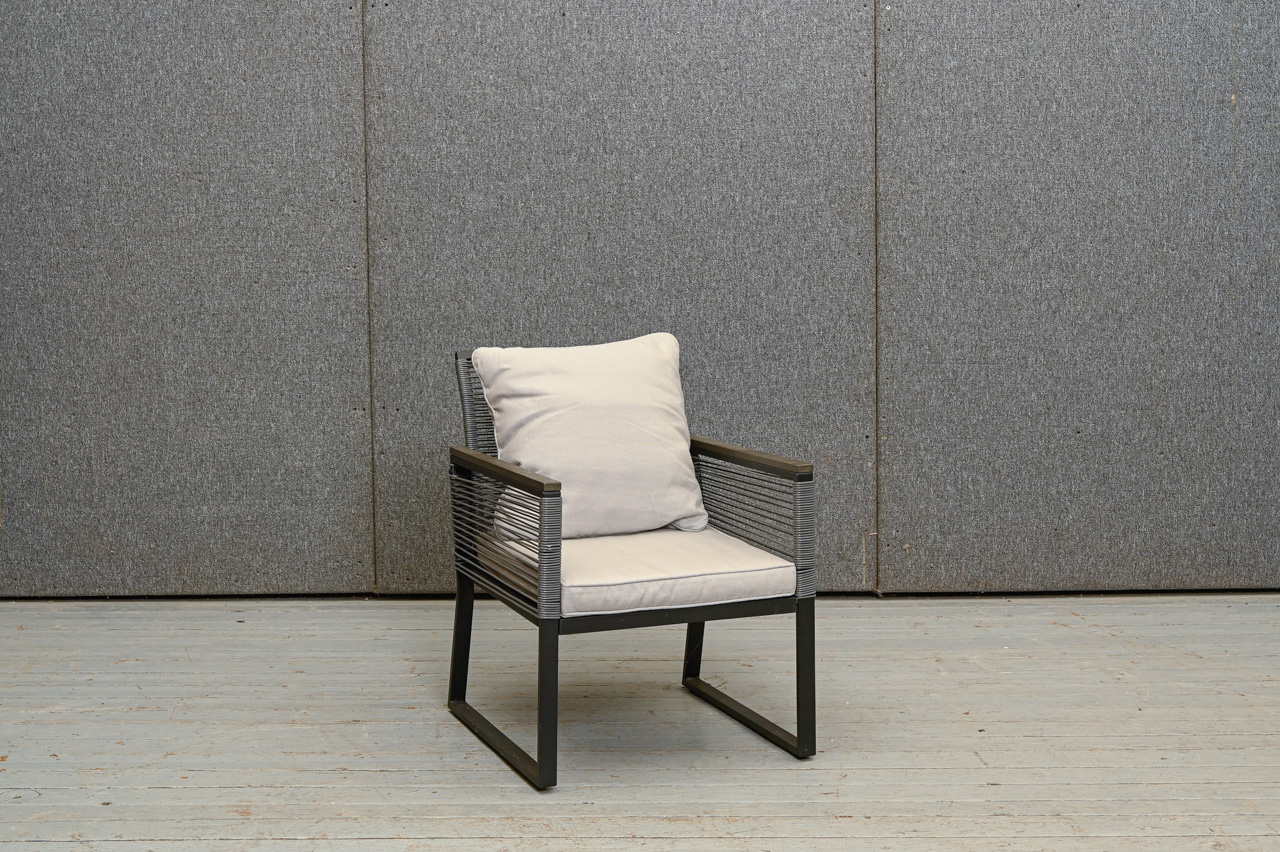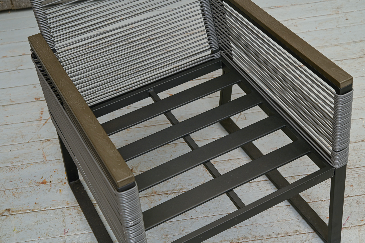 Alumīnija terases krēsls ar paroceņiem. Paroceņu virsma ar polimēra apdari. Paroceņi un atzveltne ar dekoratīvu, nostieptu plastikāta striķu apdari. Komplektā ar ūdens un UV staru izturīgu sēdvirsmas un atzveltnes spivenu. Maksimālā slodze 120kg. Nelietots, salikts. Kods 108336.