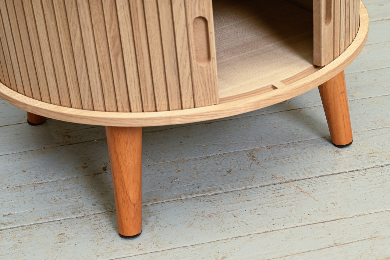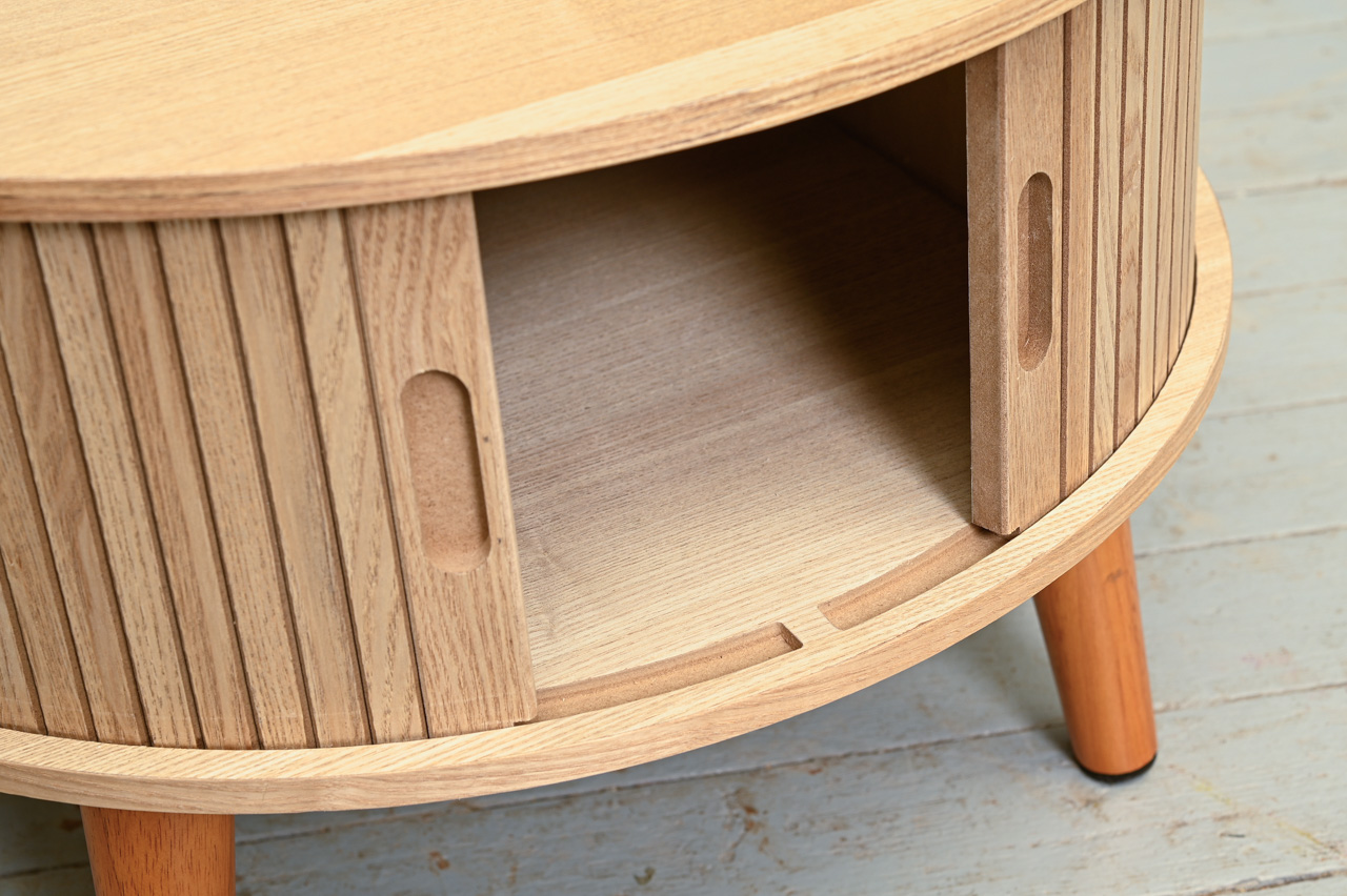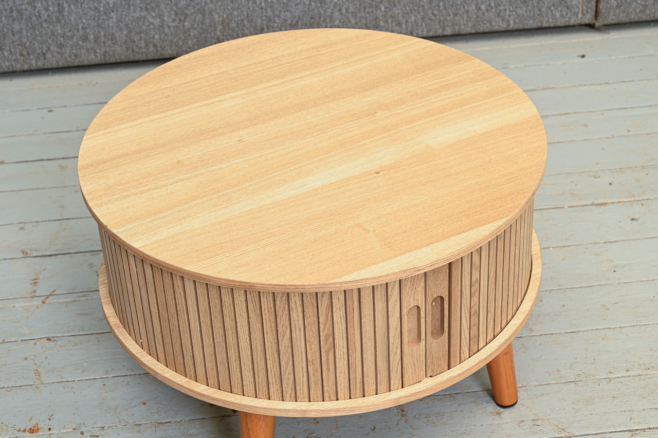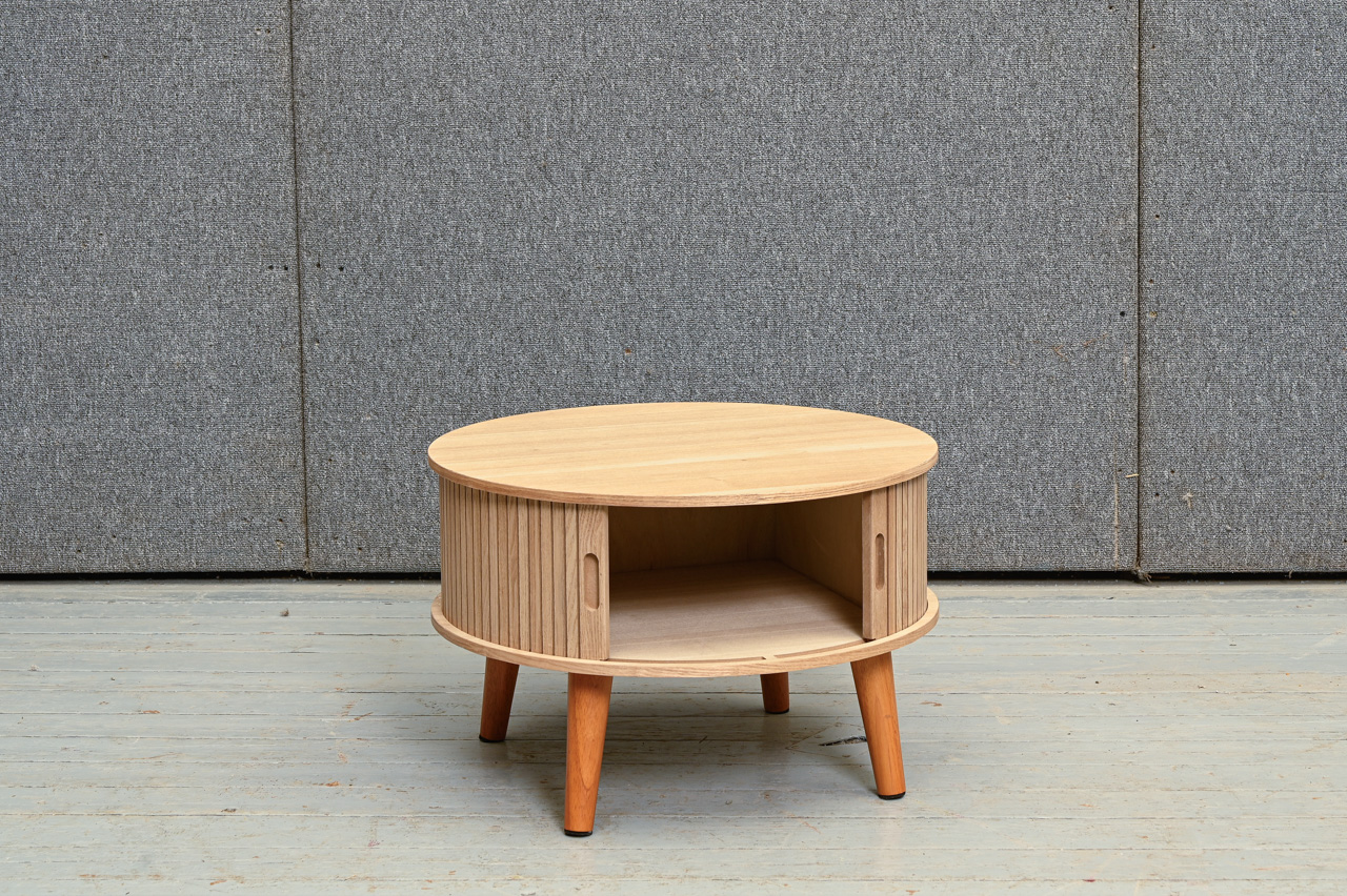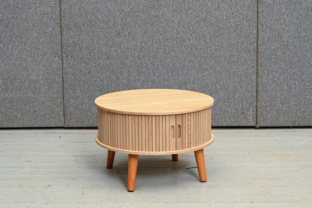 Finierēts MDF zemais galdiņš ar uzglabāšanas nodalījumu zem virsmas. Bīdāmas durtiņas ar priedes koka līstīšu apdari. Nelietots, salikts. Kods 308318. Pieejams līdzīga stila konsoles galdiņš, kods 308329.