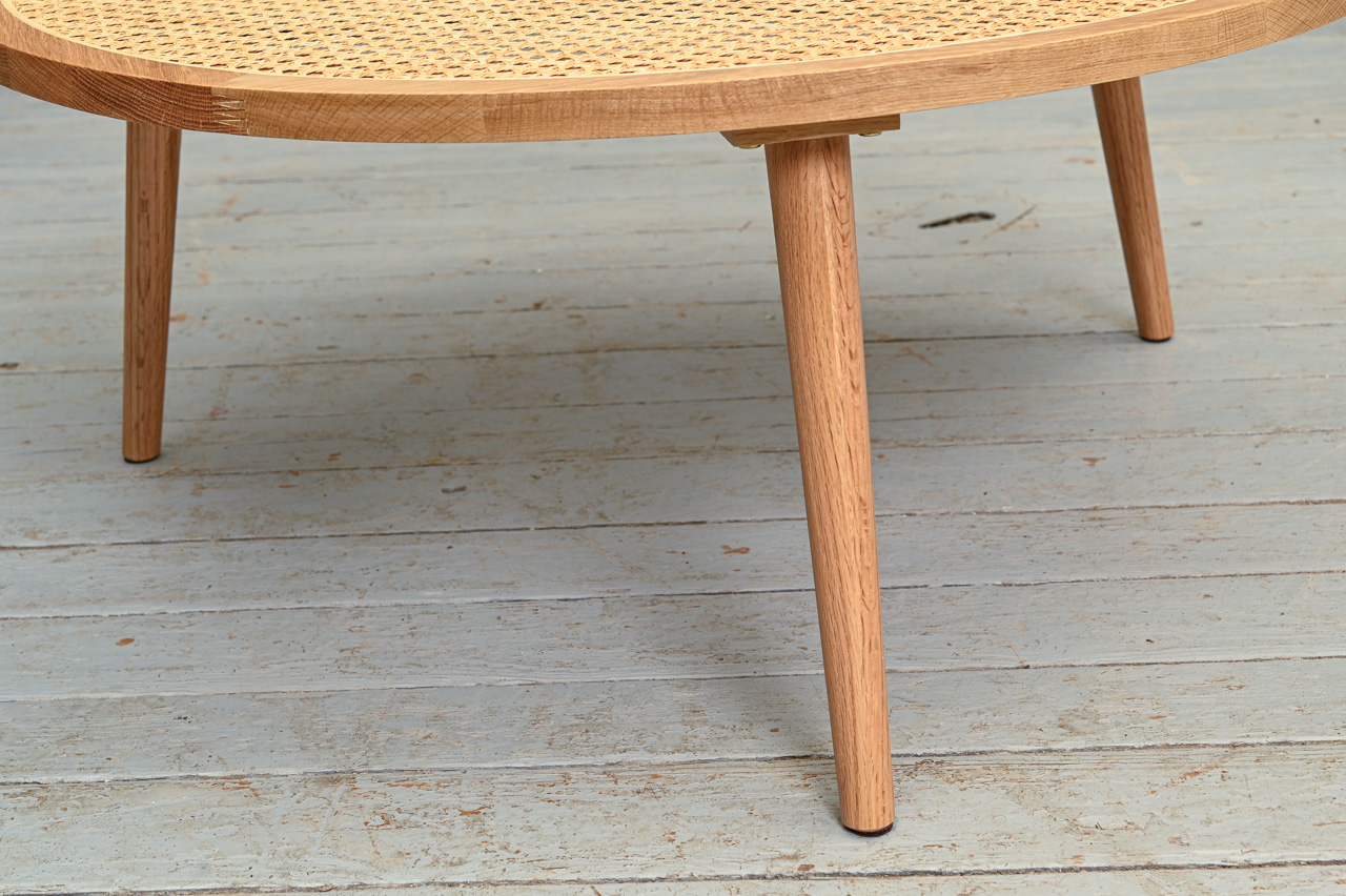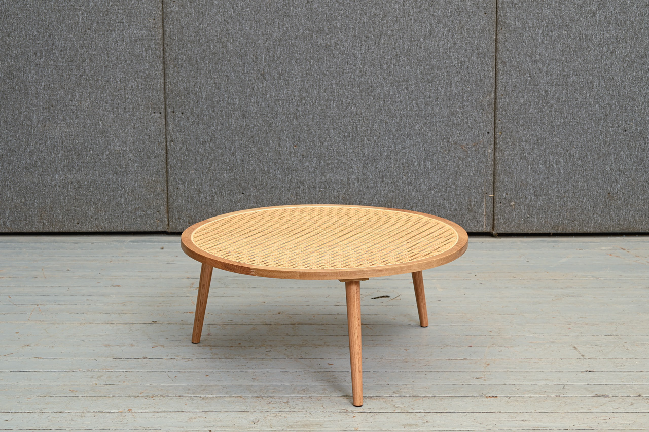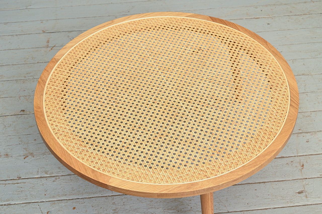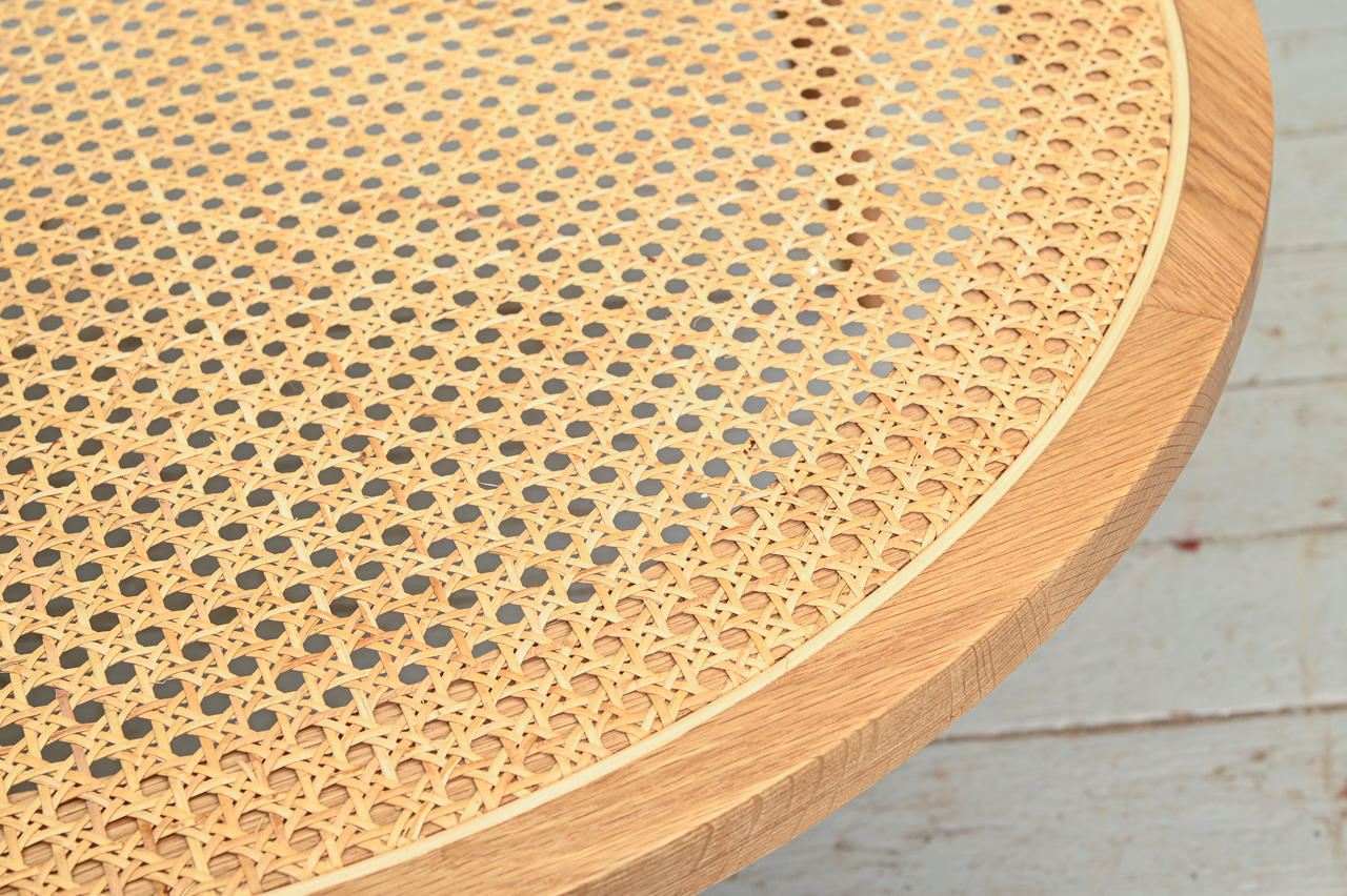 Dekoratīvs zemais ozolkoka galdiņš ar apaļu rotangpalmas virsmu. Nelietots, salikts. Kods 308316.