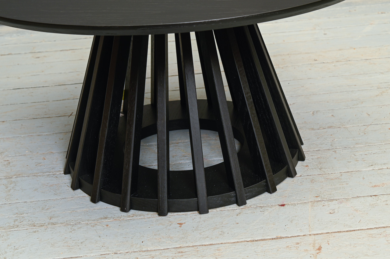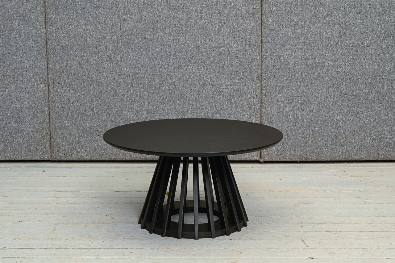Zemais galdiņš uz konusveida MDF pamatnes ar melni krāsotām koka līstēm. Apaļa MDF virsma ar koka raksta mākslīgo materiālu. Nelietots, salikts. Kods 308324.