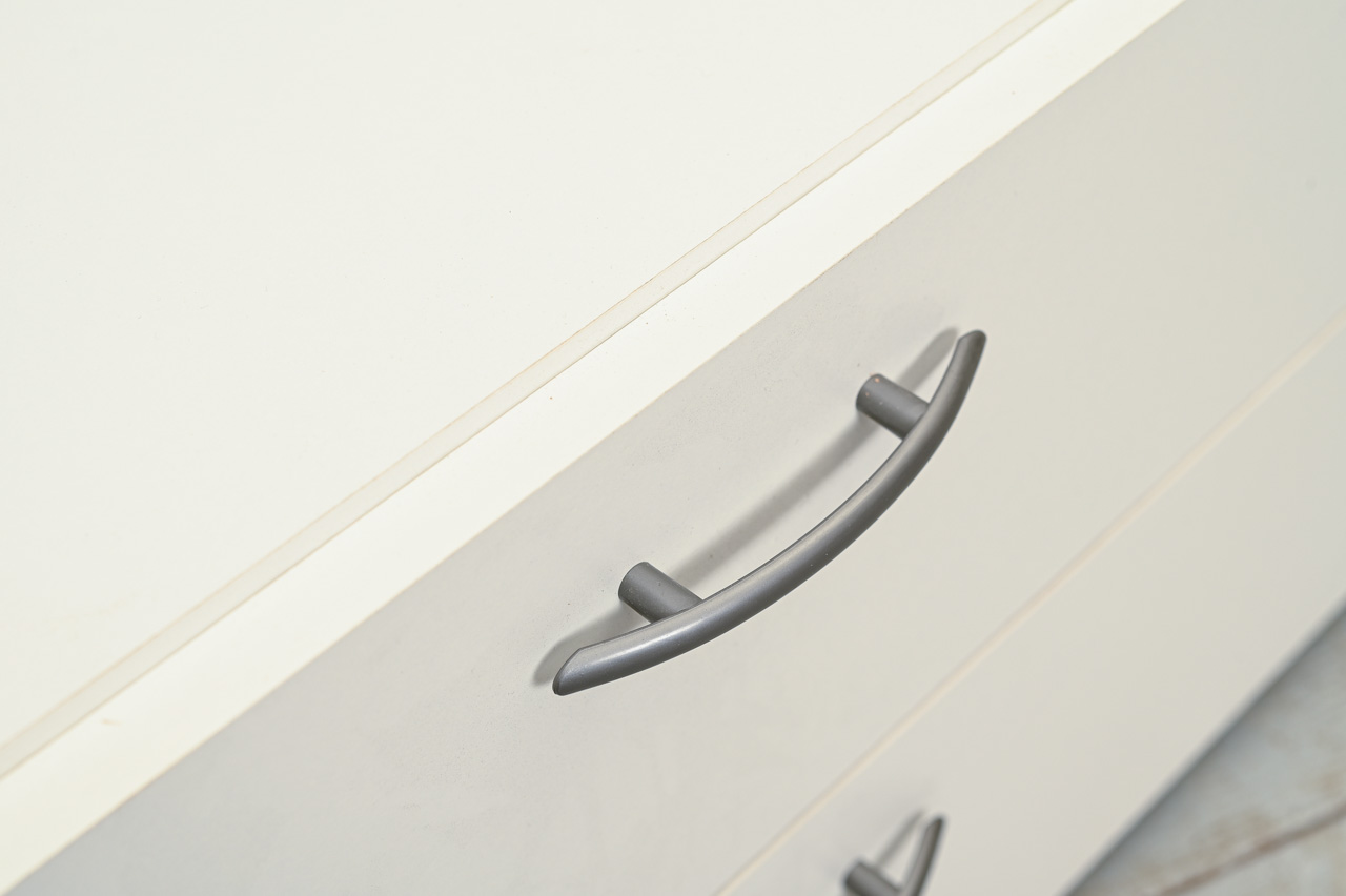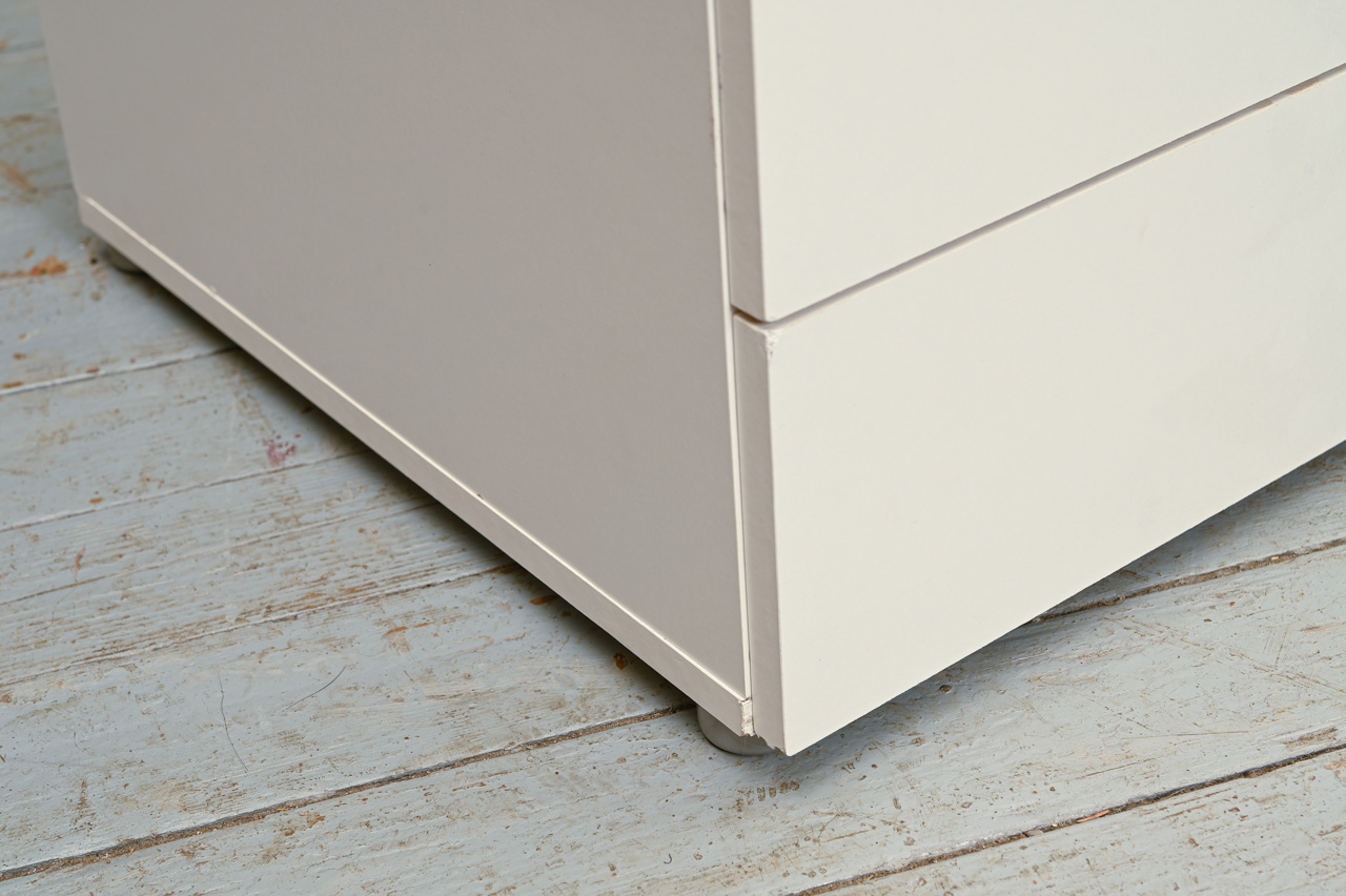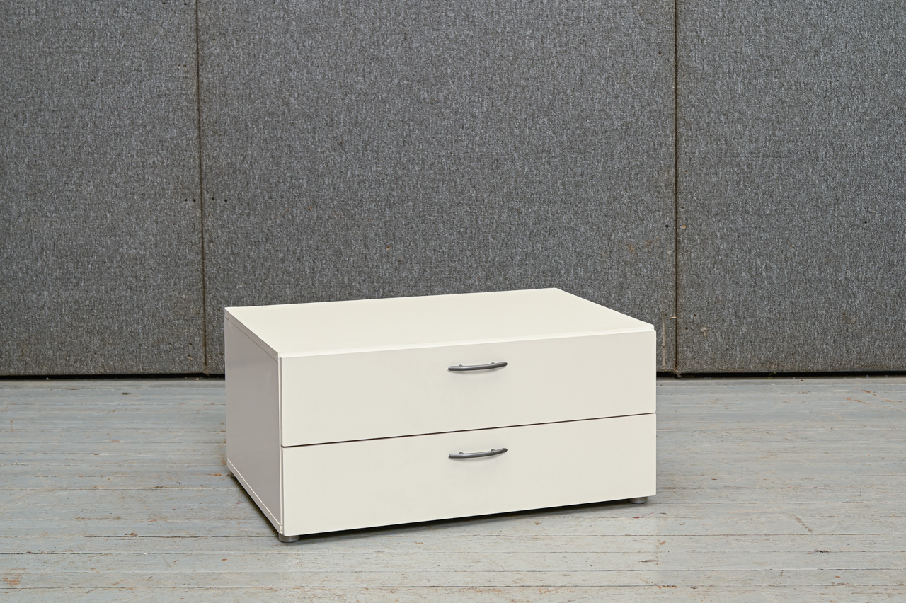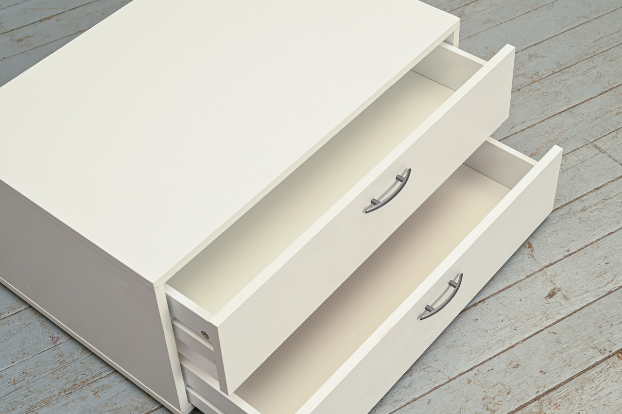 Balts kokskaidu plātnes zemais skapītis ar 2 atvilktnēm. Nelietots, salikts. Kods 408317.