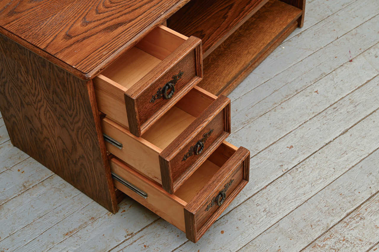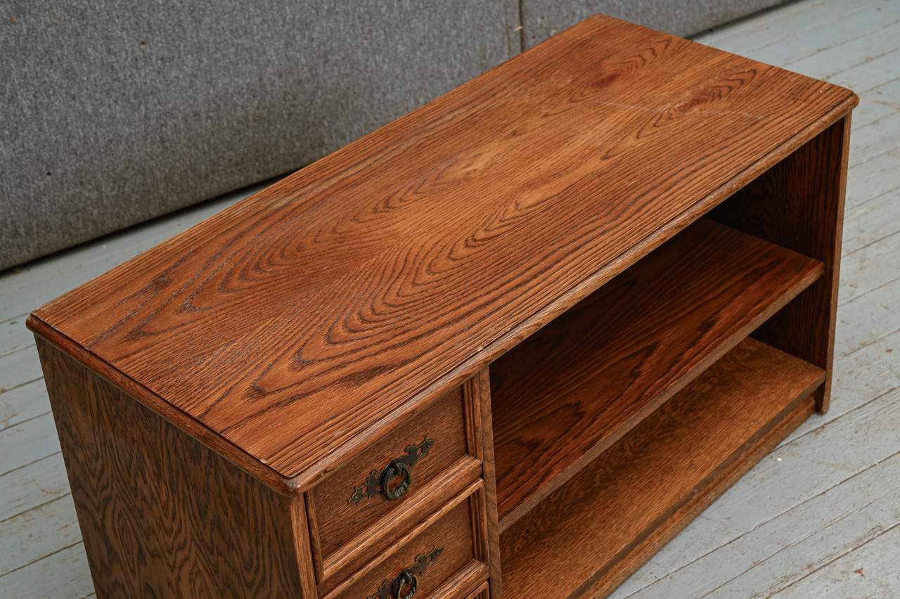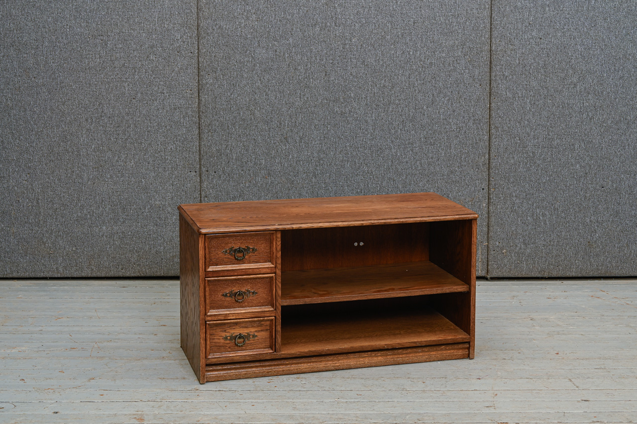 Zems skapītis ar 3 mazām atvilktnēm un uz priekšu izvelkamu plauktiņu. Kokskaidu plātne ar dabīga koka finierējumu un detaļām. Kods 460120.