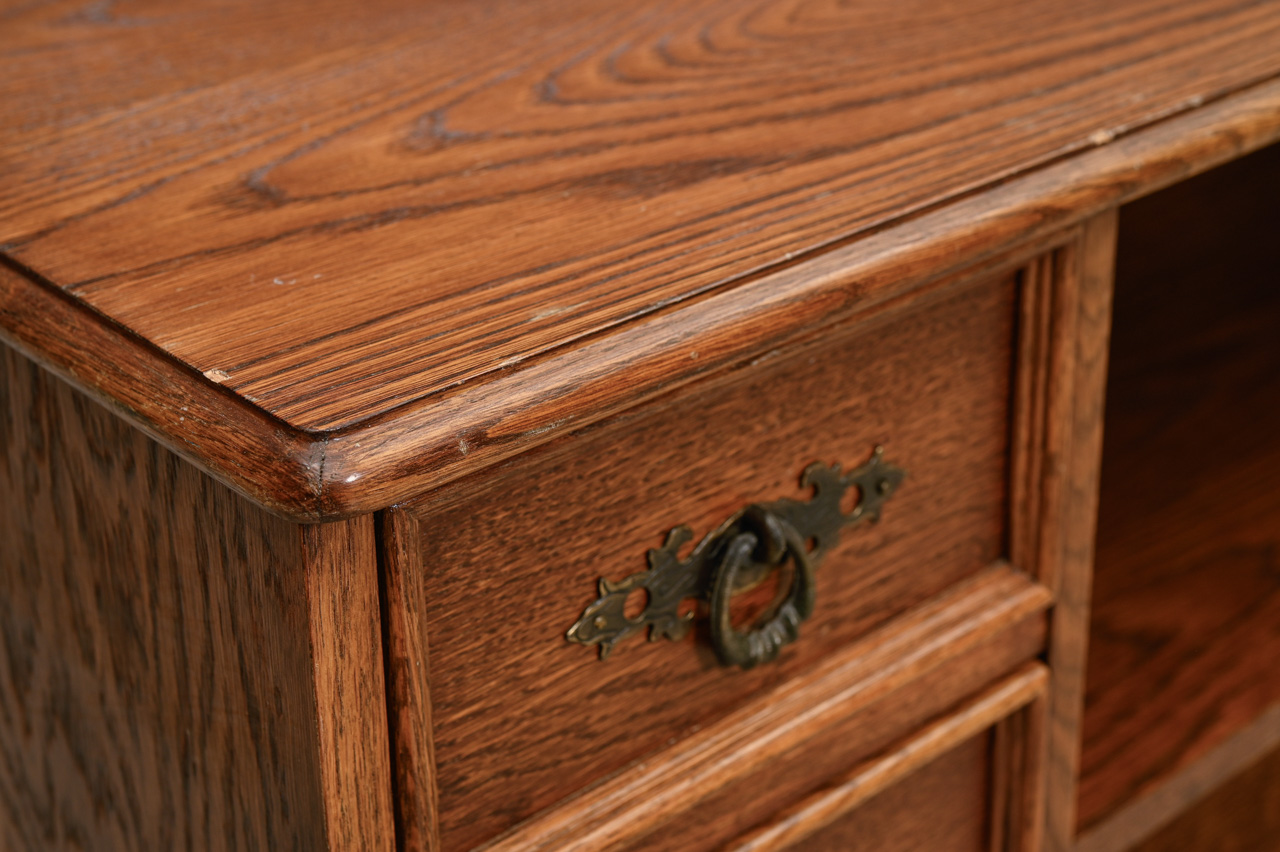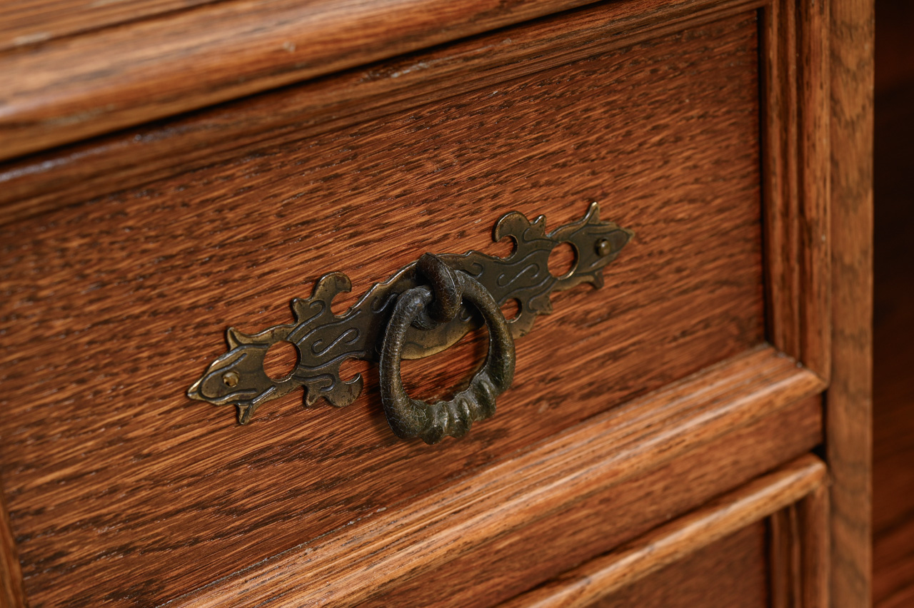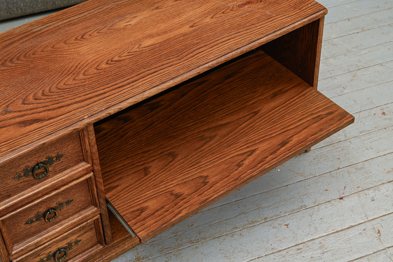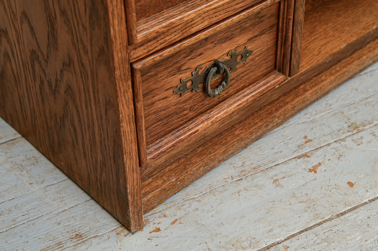 Zems skapītis ar 3 mazām atvilktnēm un uz priekšu izvelkamu plauktiņu. Kokskaidu plātne ar dabīga koka finierējumu un detaļām. Kods 460120.